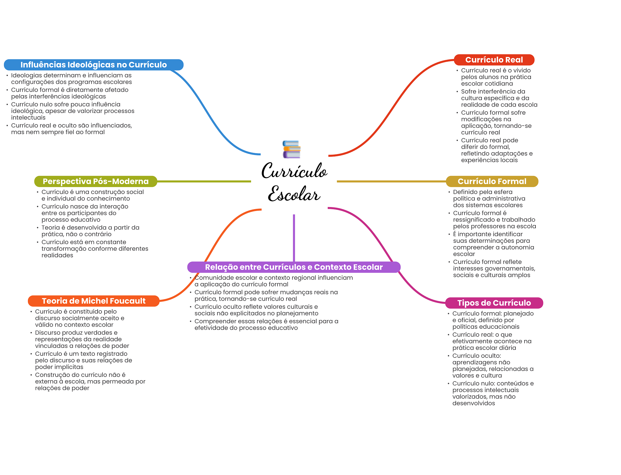 Currículo Real Influências Ideológicas no Currículo Currículo real é vivido Ideologias determinam e influenciam as alunos na prática configurações dos programas escolares escolar cotidiana Currículo formal é diretamente afetado Sofre interferência da pelas interferências ideológicas cultura específica e da Currículo nulo sofre pouca influência realidade de cada escola ideológica, apesar de valorizar processos Currículo formal sofre intelectuais modificações na Currículo real e oculto são influenciados, aplicação, tornando-se mas nem sempre fiel ao formal currículo real Currículo real pode diferir do formal, refletindo adaptações e experiências locais Currículo Perspectiva Pós-Moderna Currículo Formal Currículo é uma construção social Escolar Definido pela esfera e individual do conhecimento política e administrativa Currículo nasce da interação dos sistemas escolares entre participantes do Currículo formal é processo educativo ressignificado e trabalhado Teoria é desenvolvida a partir da pelos professores na escola prática, não O contrário É importante identificar Currículo está em constante suas determinações para transformação conforme diferentes compreender a autonomia realidades escolar Currículo formal reflete Relação entre Currículos e Contexto Escolar interesses governamentais, Comunidade escolar e contexto regional influenciam sociais e culturais amplos a aplicação do currículo formal Currículo formal pode sofrer mudanças reais na Teoria de Michel Foucault prática, tornando-se currículo real Currículo oculto reflete valores culturais e Tipos de Currículo Currículo é constituído pelo sociais não explicitados no planejamento Currículo formal: planejado discurso socialmente aceito e válido no contexto escolar Compreender essas relações é essencial para a e oficial, definido por efetividade do processo educativo políticas educacionais Discurso produz verdades e Currículo real: que representações da realidade efetivamente acontece na vinculadas a relações de poder prática escolar diária Currículo é um texto registrado Currículo oculto: pelo discurso e suas relações de aprendizagens não poder implícitas planejadas, relacionadas a Construção do currículo não é valores e cultura externa à escola, mas permeada por Currículo nulo: conteúdos e relações de poder processos intelectuais valorizados, mas não desenvolvidos