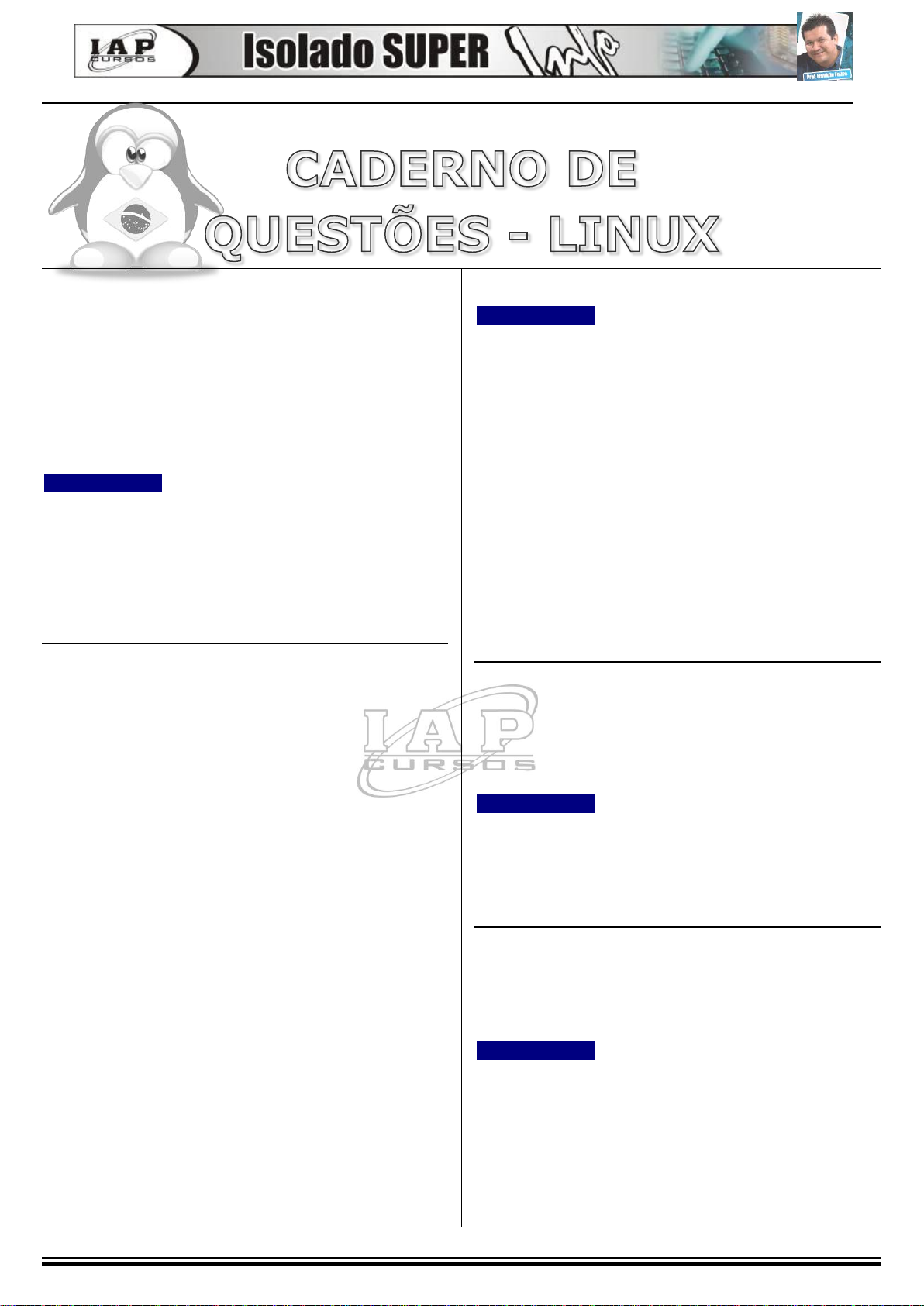 S é ri e Q u e st õ e s C o e m tn ad as In fo rM át iC a QUESTÕES COMENTADAS LINUX - Informática Para Concursos 1 F r a n k l i n . h u m b e r t o @ i g . c o m . b r – I n f o r m á t i c a p a r a C o n c u r s o s 1) (Franklin) Sobre as características de um programa denominado software livre, podemos afirmar que: A) É um programa que não é pago, ou seja, um freeware. B) Programa que pode ser copiado gratuitamente, mas é necessário permissão do desenvolvedor. C) Programa onde sua utilização é gratuita, mas a cópia é paga. D) Programa que se tem acesso ao código fonte e pode ser alterado e copiado para outros usuários sem a necessidade de comunicação ao desenvolvedor. E) Programa que se tem acesso ao código fonte através do pagamento de uma licença especial para este direito. C OM E NT Á RI O S: Segundo a Fundação do Software Livre, um software para ser livre tem de dar os direitos aos usuários de: Usar, Estudar, Modificar e Redistribuir o software sem a necessidade de comunicação previa ao criador original, ou seja, o conceito não está vinculado a pagamento de licença. Sendo assim, a grande característica de um software livre é permitir o acesso ao seu código fonte para a realização das modificações de acordo com as necessidades do usuário. Correto a letra D. CESPE- PRF /2008 (PA/MT) 2) Com relação a software livres, suas licenças de uso, distribuição e modificação, assinale a opção correta, tendo como referência as definições e os conceitos atualmente empregados pela Free Software Foundation. A Todo software livre deve ser desenvolvido para uso por pessoa física em ambiente com sistema operacional da família Linux, devendo haver restrições de uso a serem impostas por fornecedor no caso de outros sistemas operacionais.. B. O código-fonte de um software livre pode ser adaptado ou aperfeiçoado pelo usuário, para necessidades próprias, e o resultado de aperfeiçoamentos desse software pode ser liberado e redistribuído para outros usuários, sem necessidade de permissão do fornecedor do código original. C. Toda licença de software livre deve estabelecer a liberdade de que esse software seja, a qualquer momento, convertido em software proprietário e, a partir desse momento, passem a ser respeitados os direitos de propriedade intelectual do código-fonte do software convertido. D. Quando a licença de um software livre contém cláusula denominada copyleft, significa que esse software, além de livre, é também de domínio público e, dessa forma, empresas interessadas em comercializar versões não-gratuitas do referido software poderão fazê-lo, desde que não haja alterações nas funcionalidades originais do software. E. Um software livre é considerado software de código aberto quando o seu código-fonte está disponível em sítio da Internet com designação .org, podendo, assim, ser continuamente atualizado, aperfeiçoado e estendido às necessidades dos usuários, que, para executá-lo, devem compilá-lo em seus computadores pessoais. Essa característica garante a superioridade do software livre em face dos seus concorrentes comerciais proprietários. C OM E NT Á RI O S: Opção A: ERRADO. Um software livre pode ser usado por pessoa física ou jurídica, em ambiente Linux e Windows, e o principal, sem restrições. Opção B: CERTO. O Software livre segundo a FSF concede 4 liberdades aos usuários: de usar, de estuda, de modificar e de redistribuir. Fizemos inclusive questões sobre esse assunto. Opção C: ERRADO. Um software livre não pode ser convertido em um software proprietário, pois vai restringir as liberdades de estudar e modificar, pois para isso, necessita do código fonte. As cláusulas de copyleft protegem as quatro liberdades. Um software proprietário não permite o acesso ao código fonte para estudo e modificação. Opção D: ERRADO. As cláusulas de Copyleft apenas protegem as quatro liberdades, ou seja, os usuários devem passar para os outros essas mesmas liberdades e não restringi-las. Opção E: ERRADO. Um código fonte de um software livre pode está disponível em qualquer sítio da Web com qualquer designação. FUNRIO - PREF – SECRETARIA ESCOLAR 3) O Linux é um exemplo de: A) Proces. de Texto B) Sistema Operacional C) Planilha Eletrônica D) Processador Gráfico E) Antivírus C OM E NT Á RI O S: Apesar de muitas questões de provas considerarem um Linux como um sistema Operacional, na verdade ele é o núcleo de um sistema (Kernel) que sem dúvidas é a parte mais importante, e centro nervoso que controla todos os recursos e tarefas em execução como operações com periféricos, gerenciamento da memória e dispositivos. Resposta letra B. 4) Em relação ao Linux, sua licença é do tipo: A) Shareware; B) GPL; C) copyleft; D) freeware; E) proprietária. C OM E NT Á RI O S: O Linux adota a GPL (licença pública geral) da Fundação do Software Livre. Essa Licença nasceu do projeto GNU. Op.B 5) (Cespe/UnB-TRE/MA – Analista Judiciário – Administrativa) Entre as diferentes distribuições do sistema operacional Linux estão A) Conectiva, OpenOffice, StarOffice e Debian. B) GNU, Conectiva, Debian e Kernel. C) KDE, Blackbox, Debian e Pipe. . S é ri e Q u e st õ e s C o e m tn ad as In fo rM át iC a QUESTÕES COMENTADAS LINUX - Informática Para Concursos 2 F r a n k l i n . h u m b e r t o @ i g . c o m . b r – I n f o r m á t i c a p a r a C o n c u r s o s D) Debian, Conectiva, Turbo Linux e Slackware. E) Fedora, RedHat, Kurumim e Posix. C OM E NT Á RI O S: OpenOffice e StarOffice é um conjunto de aplicativos, KDE e Gnome são interfaces gráfica, GNU é o nome do projeto da fundação do software livre. A correta é a opção D. (Cespe-TCE-TO/2009) 6) A respeito do sistema operacional Linux, assinale a opção correta. A. Kernel é a interface gráfica do Linux, que tem visual muito similar à interface do sistema operacional Windows XP. B. O Linux funciona em