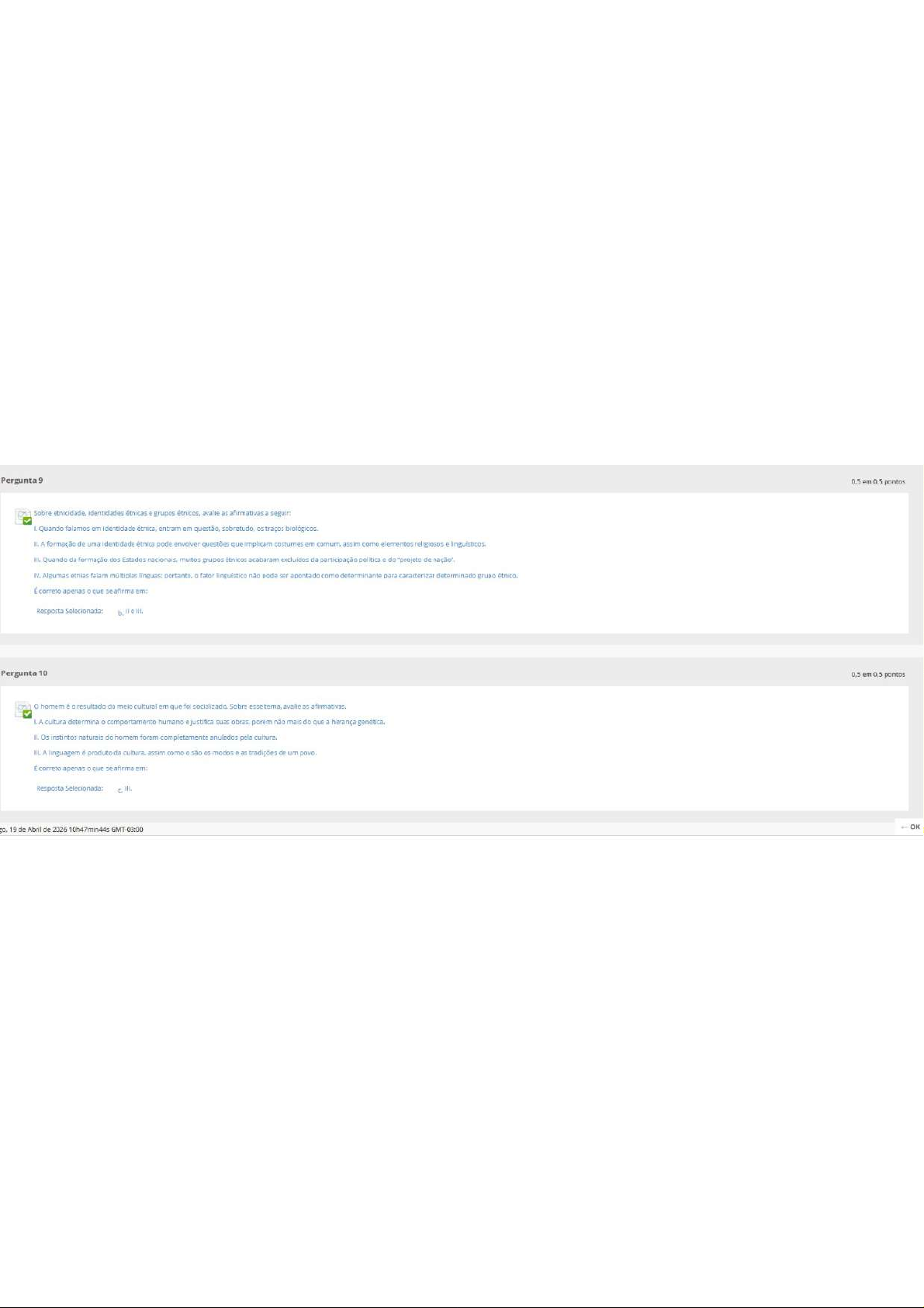 Pergunta 9 0.5 em 0.5 pontos Sobre identidades grupos étnicos, as afirmativas a Quando falamos em identidade entram em questão, traços A formação de uma identidade étnica pode envolver questões que implicam costumes em assim como elementos e Quando da formação dos Estados muitos grupos étnicos acabaram da participação 0 do de IV. Algumas etnias falam fator não pode ser apontado como determinante para caracterizar determinado grupo É correto apenas que se afirma em: b. Pergunta 10 0,5 em 0,5 pontos homem e resultado cultural em que Sobre esse tema, avalle as LA cultura determina comportamento humano e justifica suas obras porem não mais do que herança Os instintos naturais do homem foram completamente anulados pela A da assim como são 03 modos e as tradições de um correto apenas que se afirma em: Resposta Selecionada: 19 de Abril de 2026 10h47min44s GMT-03:00 OK