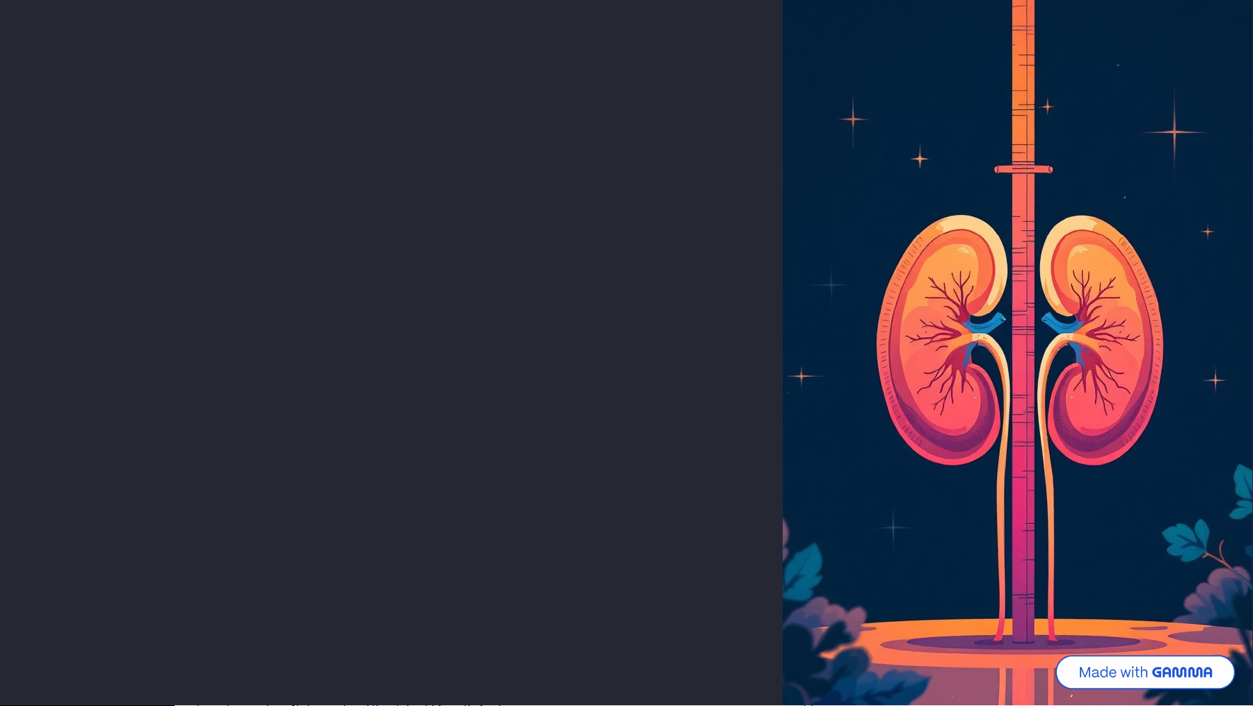 Fluidos Biológicos e a Saúde Renal: O Que a Urina Revela Entenda como os rins protegem o corpo e o que a presença de proteínas na urina pode indicar sobre a sua saúde. Discentes: Eduarda, Emilly e Luana Docente: Jocene https://gamma.app/?utm_source=made-with-gamma Os Rins: Filtros Essenciais do Nosso Corpo Capacidade de Filtração Os rins filtram aproximadamente 180 litros de sangue por dia, removendo resíduos metabólicos e excesso de líquidos para manter o equilíbrio corporal. Unidade Funcional: O Néfron Cada rim contém cerca de um milhão de néfrons, compostos pelo glomérulo e túbulos renais que trabalham em conjunto. Barreira Seletiva O glomérulo funciona como um filtro sofisticado, impedindo a passagem de grandes moléculas como proteínas enquanto permite a filtração de água e pequenas substâncias. https://gamma.app/?utm_source=made-with-gamma Proteinúria: Um Sinal de Alerta nos Rins Valores Normais Em indivíduos saudáveis, a excreção diária de proteínas na urina é inferior a 150 mg/dia, demonstrando a eficiência da barreira glomerular. Proteinúria Definida A presença de quantidades anormais de proteínas na urina caracteriza a proteinúria, indicando possível comprometimento da função renal. Significado Clínico A proteinúria é um marcador importante de dano renal, sugerindo que a barreira seletiva do glomérulo está comprometida e necessita avaliação médica. Uma urina excessivamente espumosa pode ser um sinal clássico observável da presença de proteínas, merecendo atenção médica. https://gamma.app/?utm_source=made-with-gamma A Importância da Taxa de Filtração Glomerular (TFG) 01 Medida de Eficiência A TFG quantifica a eficiência com que os rins filtram o sangue, sendo o principal indicador da função renal global. 02 Critério de Diagnóstico Uma TFG inferior a 60 mL/min/1,73m² mantida por mais de 3 meses constitui critério diagnóstico de Doença Renal Crônica (DRC). 03 Indicador de Risco A combinação de proteinúria persistente com TFG diminuída indica risco aumentado de progressão da doença renal, eventos cardiovasculares e mortalidade. https://gamma.app/?utm_source=made-with-gamma Proteinúria: O Que Indica e Como Agir Proteinúria Transitória Pode ocorrer temporariamente durante febre, exercício intenso, estresse ou desidratação, normalizando após resolução da causa. Proteinúria Persistente Indica dano renal crônico ou agudo, requerendo investigação completa para identificar a causa subjacente. Detecção Precoce Exames como EAS (Elementos Anormais Sedimentares) ou proteinúria de 24 horas são essenciais para diagnóstico precoce. Tratamento Ocorre através do controle da causa subjacente (diabetes, hipertensão) e medidas para preservar a função renal. Importante: A avaliação regular da função renal é fundamental para pacientes com fatores de risco como diabetes, hipertensão ou histórico familiar de doenças renais. https://gamma.app/?utm_source=made-with-gamma