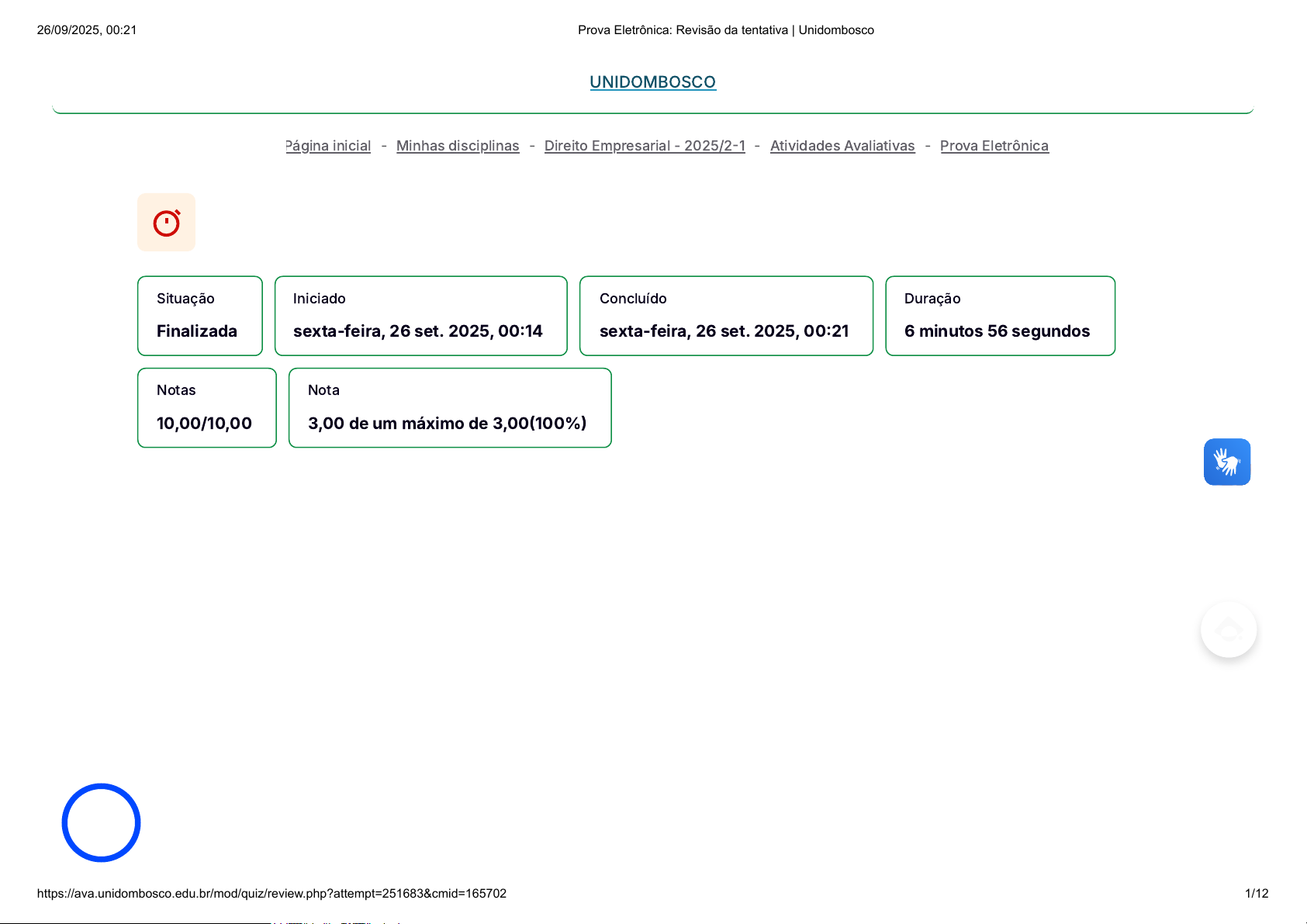 - - - - Situação Finalizada Iniciado sexta-feira, 26 set. 2025, 00:14 Concluído sexta-feira, 26 set. 2025, 00:21 Duração 6 minutos 56 segundos Notas 10,00/10,00 Nota 3,00 de um máximo de 3,00(100%) Página inicial Minhas disciplinas Direito Empresarial - 2025/2-1 Atividades Avaliativas Prova Eletrônica UNIDOMBOSCO 26/09/2025, 00:21 Prova Eletrônica: Revisão da tentativa | Unidombosco https://ava.unidombosco.edu.br/mod/quiz/review.php?attempt=251683&cmid=165702 1/12 https://ava.unidombosco.edu.br/ https://ava.unidombosco.edu.br/my/courses.php https://ava.unidombosco.edu.br/course/view.php?id=10600 https://ava.unidombosco.edu.br/course/section.php?id=43609 https://ava.unidombosco.edu.br/mod/quiz/view.php?id=165702 https://ava.unidombosco.edu.br/ https://accessibility-widget.pages.dev/ Questão 1 Correto Atingiu 1,00 de 1,00 Marcar questão O que é o direito de retirada do sócio? Escolha uma opção: a. O direito de poder participar ativamente das decisões da sociedade. b. É o direito de não mais fazer parte dos quadros societários da sociedade. c. O recebimento de parte dos lucros acumulados num exercício social. d. É o direito de fiscalizar a administração da sociedade, desde que não faça parte desta mesma administração. A resposta correta é: É o direito de não mais fazer parte dos quadros societários da sociedade. UNIDOMBOSCO 26/09/2025, 00:21 Prova Eletrônica: Revisão da tentativa | Unidombosco https://ava.unidombosco.edu.br/mod/quiz/review.php?attempt=251683&cmid=165702 2/12 https://ava.unidombosco.edu.br/ https://accessibility-widget.pages.dev/ Questão 2 Correto Atingiu 1,00 de 1,00 Marcar questão Segundo o Código Civil, qual o significado do termo empresa? Escolha uma opção: a. Sinônimo de sociedades mercantis. b. Junta comercial. c. Atos mercantis. d. Qualquer pessoa jurídica que participe de atos mercantis, mesmo as sem fins lucrativos. e. Sinônimo de pessoa jurídica. A resposta correta é: Atos mercantis. UNIDOMBOSCO 26/09/2025, 00:21 Prova Eletrônica: Revisão da tentativa | Unidombosco https://ava.unidombosco.edu.br/mod/quiz/review.php?attempt=251683&cmid=165702 3/12 https://ava.unidombosco.edu.br/ https://accessibility-widget.pages.dev/ Questão 3 Correto Atingiu 1,00 de 1,00 Marcar questão O que é a Comissão de Valores Mobiliários? Escolha uma opção: a. É uma autarquia federal encarregada de regular a operação de valores mobiliários. b. Um órgão societário encarregado de verificar o valor das ações na bolsa de valores. c. É um órgão equivalente à assembleia dos sócios. d. É o nome técnico da bolsa de valores. e. É um órgão de fiscalização dentro da sociedade. A resposta correta é: É uma autarquia federal encarregada de regular a operação de valores mobiliários. UNIDOMBOSCO 26/09/2025, 00:21 Prova Eletrônica: Revisão da tentativa | Unidombosco https://ava.unidombosco.edu.br/mod/quiz/review.php?attempt=251683&cmid=165702 4/12 https://ava.unidombosco.edu.br/ https://accessibility-widget.pages.dev/ Questão 4 Correto Atingiu 1,00 de 1,00 Marcar questão Em relação ao nome da sociedade anônima, marque a resposta incorreta: Escolha uma opção: a. A expressão "LTDA" não pode em qualquer hipótese ser utilizada pela sociedade anônima. b. A sociedade não pode omitir a expressão "sociedade anônima" no final ou a expressão "companhia" no início da denominação. c. O nome de qualquer sócio pode ser utilizado para nominar a sociedade. d. Termos pejorativos não podem ser usados na denominação da sociedade. A resposta correta é: A sociedade não pode omitir a expressão "sociedade anônima" no final ou a expressão "companhia" no início da denominação. UNIDOMBOSCO 26/09/2025, 00:21 Prova Eletrônica: Revisão da tentativa | Unidombosco https://ava.unidombosco.edu.br/mod/quiz/review.php?attempt=251683&cmid=165702 5/12 https://ava.unidombosco.edu.br/ https://accessibility-widget.pages.dev/ Questão 5 Correto Atingiu 1,00 de 1,00 Marcar questão O que são valores mobiliários nas sociedades anônimas? Escolha uma opção: a. São os valores móveis, utilizados para formar o capital de giro. b. Quaisquer valores, bens ou direitos não imobilizados. c. É todo o ativo circulante ou seja o ativo que não é imobilizado na sociedade. d. São os valores dos móveis e utensílios da sociedade. e. São títulos emitidos pela sociedade para sua capitalização. A resposta correta é: São títulos emitidos pela sociedade para sua capitalização. UNIDOMBOSCO 26/09/2025, 00:21 Prova Eletrônica: Revisão da tentativa | Unidombosco https://ava.unidombosco.edu.br/mod/quiz/review.php?attempt=251683&cmid=165702 6/12 https://ava.unidombosco.edu.br/ https://accessibility-widget.pages.dev/ Questão 6 Correto Atingiu 1,00 de 1,00 Marcar questão Quem é o empresário? Escolha uma opção: a. São os sócios "pessoas-físicas". b. Aquele que pratica atos de empresa. c. São os sócios ou associados. d. É o sócio majoritário. e. São todos os sócios da sociedade mercantil. A resposta correta é: Aquele que pratica atos de empresa. UNIDOMBOSCO 26/09/2025, 00:21 Prova Eletrônica: Revisão da tentativa | Unidombosco https://ava.unidombosco.edu.br/mod/quiz/review.php?attempt=251683&cmid=165702 7/12 https://ava.unidombosco.edu.br/ https://accessibility-widget.pages.dev/ Questão 7 Correto Atingiu 1,00 de 1,00 Marcar questão As sociedades estão classificadas em: Escolha uma opção: a. De pessoas e de capital. b. Públicas e privadas. c. Nacionais e multinacionais. d. Lucrativas e não lucrativas. e. Limitadas e S/As. A resposta correta é: De pessoas e de capital. UNIDOMBOSCO 26/09/2025, 00:21 Prova Eletrônica: Revisão da tentativa | Unidombosco https://ava.unidombosco.edu.br/mod/quiz/review.php?attempt=251683&cmid=165702 8/12 https://ava.unidombosco.edu.br/ https://accessibility-widget.pages.dev/ Questão 8 Correto Atingiu 1,00 de 1,00 Marcar questão O que é a EIRELI? Escolha uma opção: a. É o conjunto de ativ