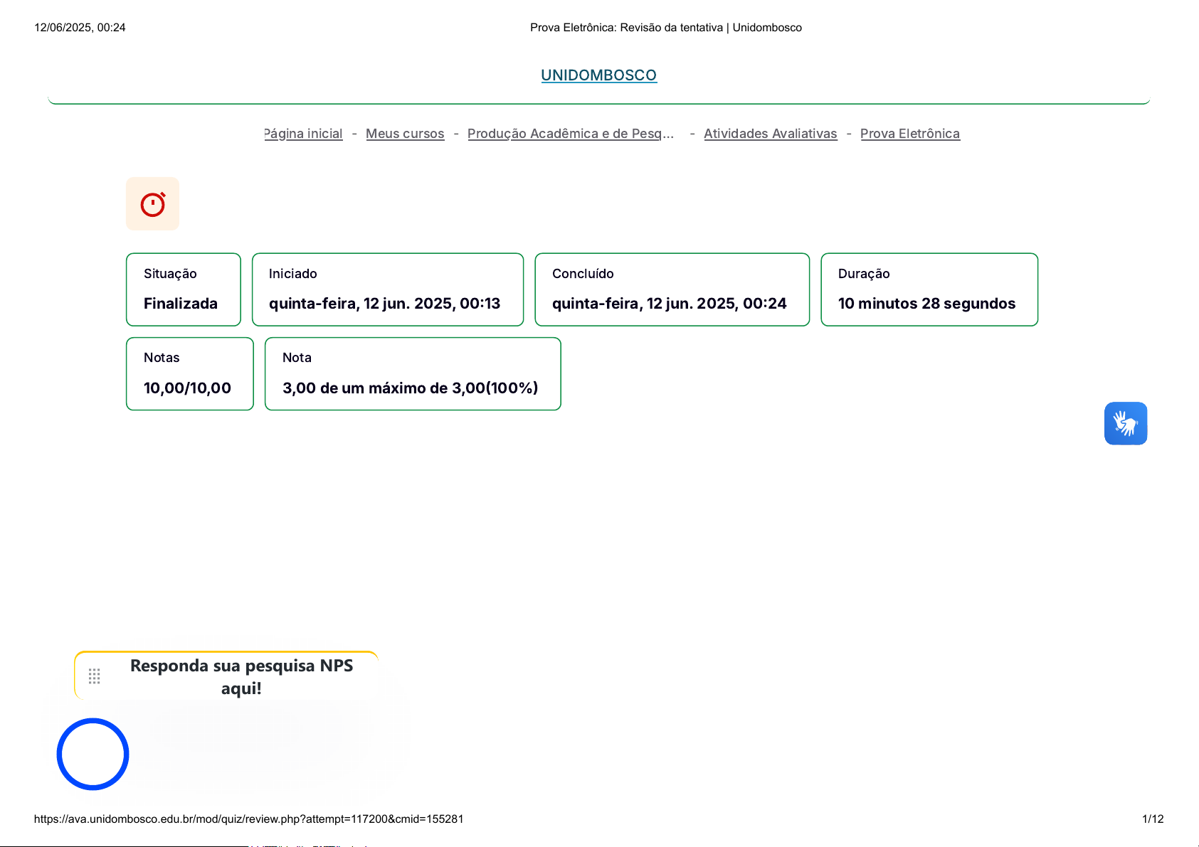 - - - - Situação Finalizada Iniciado quinta-feira, 12 jun. 2025, 00:13 Concluído quinta-feira, 12 jun. 2025, 00:24 Duração 10 minutos 28 segundos Notas 10,00/10,00 Nota 3,00 de um máximo de 3,00(100%) Página inicial Meus cursos Produção Acadêmica e de Pesq… Atividades Avaliativas Prova Eletrônica Responda sua pesquisa NPS aqui! UNIDOMBOSCO 12/06/2025, 00:24 Prova Eletrônica: Revisão da tentativa | Unidombosco https://ava.unidombosco.edu.br/mod/quiz/review.php?attempt=117200&cmid=155281 1/12 https://ava.unidombosco.edu.br/ https://ava.unidombosco.edu.br/my/courses.php https://ava.unidombosco.edu.br/course/view.php?id=10001 https://ava.unidombosco.edu.br/course/section.php?id=41074 https://ava.unidombosco.edu.br/mod/quiz/view.php?id=155281 https://ava.unidombosco.edu.br/ https://accessibility-widget.pages.dev/ Questão 1 Correto Atingiu 1,00 de 1,00 Marcar questão A revisão de literatura é uma etapa essencial na pesquisa. Qual das seguintes alternativas descreve corretamente o objetivo da revisão de literatura? Escolha uma opção: a. A revisão de literatura visa coletar, sintetizar e analisar as informações disponíveis sobre determinado assunto, identificar lacunas no conhecimento e avaliar estudos anteriores. b. O objetivo da revisão de literatura é justificar o desenvolvimento de pesquisa sobre um tema específico. c. A revisão de literatura tem como objetivo principal a realização de experimentos e a descrição das técnicas e equipamentos utilizados na pesquisa. d. Esta etapa consiste em elaborar um cronograma com as atividades a serem realizadas ao longo da pesquisa. e. A revisão de literatura tem como finalidade definir os objetivos gerais e específicos do projeto de pesquisa. A resposta correta é: A revisão de literatura visa coletar, sintetizar e analisar as informações disponíveis sobre determinado assunto, identificar lacunas no conhecimento e avaliar estudos anteriores. UNIDOMBOSCO 12/06/2025, 00:24 Prova Eletrônica: Revisão da tentativa | Unidombosco https://ava.unidombosco.edu.br/mod/quiz/review.php?attempt=117200&cmid=155281 2/12 https://ava.unidombosco.edu.br/ https://accessibility-widget.pages.dev/ Questão 2 Correto Atingiu 1,00 de 1,00 Marcar questão O conhecimento pode ser dividido em quatro tipos. Assinale abaixo a alternativa que não condiz com essa divisão: Escolha uma opção: a. Místico: fundamentado na percepção. b. Teológico: fundamentado na fé. c. Empírico: fundamentado na experiência; d. Filosófico: fundamentado na reflexão; e. Científico: fundamentado na razão; A resposta correta é: Místico: fundamentado na percepção. UNIDOMBOSCO 12/06/2025, 00:24 Prova Eletrônica: Revisão da tentativa | Unidombosco https://ava.unidombosco.edu.br/mod/quiz/review.php?attempt=117200&cmid=155281 3/12 https://ava.unidombosco.edu.br/ https://accessibility-widget.pages.dev/ Questão 3 Correto Atingiu 1,00 de 1,00 Marcar questão Qual é a importância da adoção de gêneros textuais acadêmicos na produção científica? Escolha uma opção: a. Diminuir o reconhecimento das contribuições individuais. b. Eliminar a necessidade de pesquisa original. c. Padronizar a escrita e a comunicação. d. Limitar a difusão de informações. e. Facilitar a comunicação imprecisa. A resposta correta é: Padronizar a escrita e a comunicação. UNIDOMBOSCO 12/06/2025, 00:24 Prova Eletrônica: Revisão da tentativa | Unidombosco https://ava.unidombosco.edu.br/mod/quiz/review.php?attempt=117200&cmid=155281 4/12 https://ava.unidombosco.edu.br/ https://accessibility-widget.pages.dev/ Questão 4 Correto Atingiu 1,00 de 1,00 Marcar questão Qual das alternativas a seguir referem-se às técnicas de leitura específicas para textos acadêmicos? Escolha uma opção: a. São estratégias para escrever textos acadêmicos. b. São estratégias para organizar a pesquisa. c. São estratégias para compreender objetivos e estrutura do texto de forma efetiva. d. São estratégias para criar fontes confiáveis. e. São estratégias para produzir argumentos sólidos. A resposta correta é: São estratégias para compreender objetivos e estrutura do texto de forma efetiva. UNIDOMBOSCO 12/06/2025, 00:24 Prova Eletrônica: Revisão da tentativa | Unidombosco https://ava.unidombosco.edu.br/mod/quiz/review.php?attempt=117200&cmid=155281 5/12 https://ava.unidombosco.edu.br/ https://accessibility-widget.pages.dev/ Questão 5 Correto Atingiu 1,00 de 1,00 Marcar questão No que se refere à linguagem científica qual das características a seguir pode considerada uma boa prática? Escolha uma opção: a. Ter clareza e concisão na comunicação, evitando ambiguidades e termos desnecessários. b. Incorporar humor e linguagem informal para tornar o texto mais atraente. c. Fazer uso de jargões técnicos e termos complexos para impressionar os leitores. d. Utilizar de frases curtas e elaboradas para transmitir opinião. e. Usar informações de forma imprecisa. A resposta correta é: Ter clareza e concisão na comunicação, evitando ambiguidades e termos desnecessários. UNIDOMBOSCO 12/06/2025, 00:24 Prova Eletrônica: Revisão da tentativa | Unidombosco https://ava.unidombosco.edu.br/mod/quiz/review.php?attempt=117200&cmid=155281 6/12 https://ava.unidombosco.edu.br/ https://accessibility-widget.pages.dev/ Questão 6 Correto Atingiu 1,00 de 1,00 Marcar questão Quando iniciamos a elaboração de uma pesquisa, temos o planejamento como sua primeira fase e este se concretiza pela a elaboração de um projeto de pesquisa, que deve oferecer respostas para alguns questionamentos. Assinale a alternativa que indica a sequência correta: Escolha uma opção: a. Temas já investigados, porém menos estruturados e formalizados b. Onde serão realizadas as pesquisas de campo e quais serão as amostras utilizadas c. Temas pouco pesquisados e pouco estrutura d. O que, por que, para que, como quando e onde pesquisar e. Temas já pesquisados, estruturados e formalizados A respost