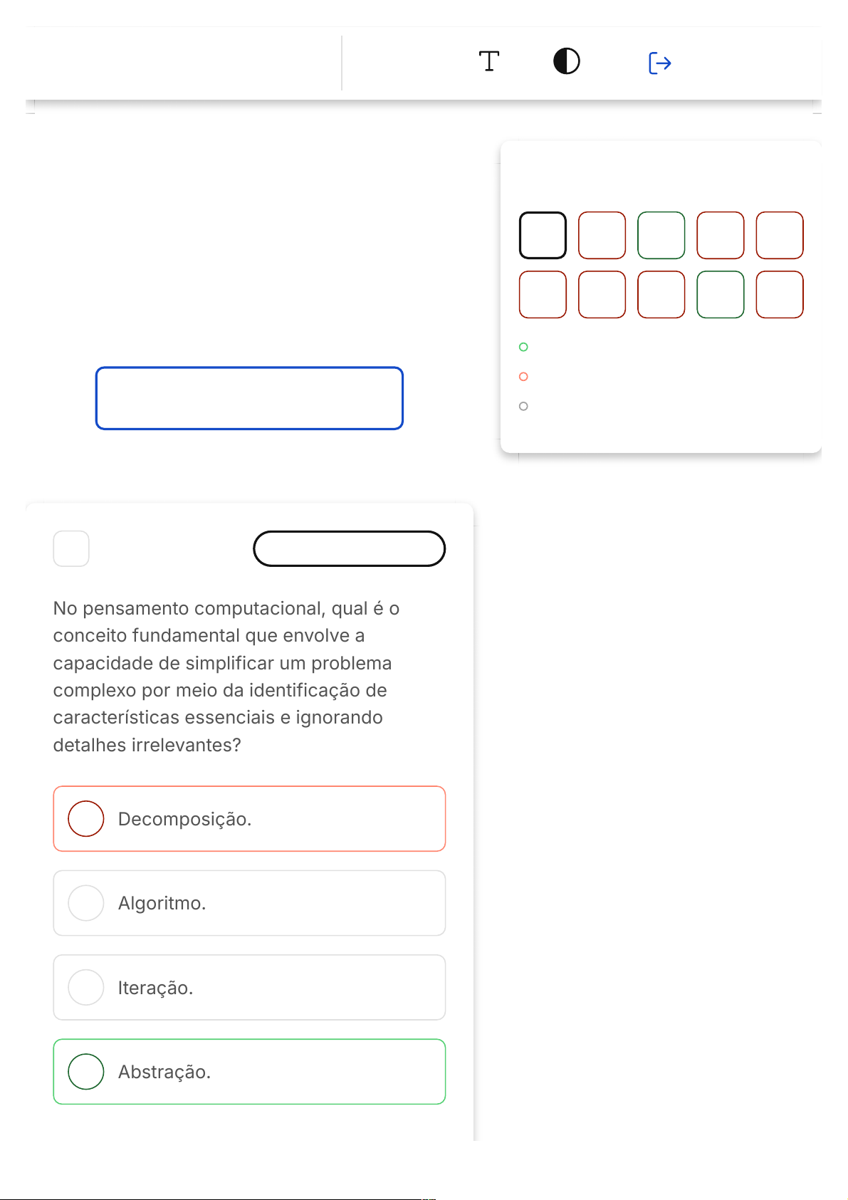 Você acertou 2 de 10 questões Verifique o seu desempenho e continue treinando! Você pode refazer o exercício quantas vezes quiser. Verificar Desempenho A B C D 1 Marcar para revisão No pensamento computacional, qual é o conceito fundamental que envolve a capacidade de simplificar um problema complexo por meio da identificação de características essenciais e ignorando detalhes irrelevantes? Decomposição. Algoritmo. Iteração. Abstração. Questão 1 de 10 Corretas (2) Incorretas (8) Em branco (0) 1 2 3 4 5 6 7 8 9 10 Lista de exercícios Noções De… Programação: Exemplos Com Manipulação De Imagens Digitais Sair E Padrões. Resposta incorreta Opa! A alternativa correta é a letra D. Confira o gabarito comentado! Gabarito Comentado A questão aborda um dos principais conceitos do pensamento computacional, que é a abstração. A resposta correta, destaca a capacidade de simplificar problemas complexos, identificando características essenciais e ignorando detalhes irrelevantes. A abstração é essencial para lidar com problemas computacionais, permitindo uma compreensão mais clara e a busca por soluções eficientes. 2 Marcar para revisão Frequentemente, durante práticas de programação, observamos o resultado de determinado código-fonte, observamos as limitações desse resultado e refletimos como poderíamos proceder para alcançar resultados melhores. Este é um exemplo da habilidade de pensamento computacional denominada: A B C D E Abstração Automação Detecção de padrões Análise/avaliação Decomposição Resposta incorreta Opa! A alternativa correta é a letra D. Confira o gabarito comentado! Gabarito Comentado A alternativa correta é a "Análise/avaliação". Esta habilidade de pensamento computacional envolve a avaliação de um código-fonte, identificando suas limitações e refletindo sobre como melhorá-lo. É uma competência essencial para um programador, pois permite aprimorar a eficiência do código. Por exemplo, pode-se reduzir linhas de código e maximizar a eficiência da codificação. O enunciado descreve essa habilidade ao mencionar a análise do resultado de um código-fonte e a reflexão sobre como obter melhores resultados. A B C D E 3 Marcar para revisão Entre as técnicas de programação para manipulação de imagens digitais, há uma que permite instruir que o computador selecione pixels sobre os quais determinadas instruções foram executadas. Por exemplo, selecionamos pixels em tons de amarelo e, para esses pixels, instruímos o computador a alterar sua tonalidade de cor. Assinale a alternativa cuja instrução reflete essa ideia de escolher pixels que serão afetados por um conjunto de instruções: if( pixel.getRed() > 130 ) pixel=img.getPixel(10,10) for(pixel: img) pixel.setRed(0) pixel.setZoom(20) Resposta correta Parabéns, você selecionou a alternativa correta. Confira o gabarito comentado! Gabarito Comentado A alternativa correta é: if( pixel.getRed() > 130 ). Esta instrução representa uma estrutura condicional na programação, que é usada para tomar decisões baseadas em determinadas condições. No caso desta questão, a condição é que o valor do pixel vermelho seja maior que 130. Se essa condição for verdadeira, então o computador executará as instruções dentro do bloco de código do 'if'. Isso reflete a ideia de selecionar pixels específicos (neste caso, aqueles com um valor de vermelho maior que 130) para serem afetados por um conjunto de instruções. 4 Marcar para revisão Observe o código a seguir, que está manipulando uma imagem totalmente branca: Se o computador executar as linhas de código da parte 1 e, segundos depois, as linhas de código da parte 2, qual será o efeito observado nas imagens apresentadas na tela? A B C D E Um pixel preto se deslocando para a esquerda. Um pixel preto se deslocando para baixo. Um pixel preto se deslocando para a direita. Um pixel cinza se deslocando para a esquerda. Um pixel cinza se deslocando para baixo. Resposta incorreta Opa! A alternativa correta é a letra B. Confira o gabarito comentado! Gabarito Comentado A execução sequencial do código revelará um pixel preto, código RGB (0,0,0), se deslocando para baixo. 5 Marcar para revisão Lucas é um estudante de programação e está aprendendo sobre a importância das estruturas de repetição na programação. Ele está explorando como essas estruturas A B C D E permitem executar um conjunto de instruções várias vezes de forma eficiente. Com base no seu conhecimento sobre a importância das estruturas de repetição em programação, assinale a alternativa correta que descreve a função principal dessas estruturas. Facilitar a organização de variáveis e comentários em um programa. Realizar a entrada e saída de dados em um programa. Executar operações matemáticas e lógicas em um programa. Permitir a tomada de decisões com base em condições específicas em um programa. Executar um conjunto de instruções várias vezes de forma eficiente em um programa. Resposta incorreta Opa! A alternativa correta é a letra E. Confira o gabarito comentado! Gabarito Comentado As estruturas de repetição permitem que um conjunto de instruções seja A B C D executado várias vezes, evitando a repetição de código e tornando o programa mais eficiente. Elas são fundamentais para resolver problemas complexos que exigem a execução repetida de tarefas ou a manipulação de grandes volumes de dados. As demais alternativas mencionam outras funcionalidades importantes na programação, mas não descrevem adequadamente a função das estruturas de repetição. 6 Marcar para revisão No pensamento computacional, qual é o conceito fundamental que envolve a capacidade de escrever soluções na forma de instruções que o computador é capaz de seguir automaticamente para chegar ao resultado desejado? Fatoração. Automação. Iteração. Imaginação. E A B Padrões. Resposta incorreta Opa! A alternativa co