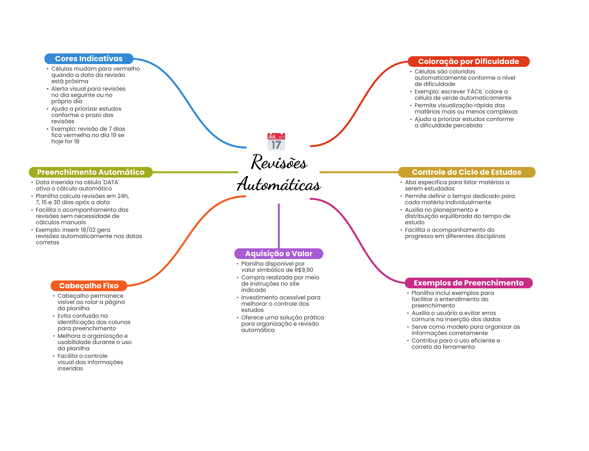 Cores Indicativas Coloração por Dificuldade Células mudam para vermelho Células são coloridas quando a data da revisão automaticamente conforme nível está próxima de dificuldade Alerta visual para revisões Exemplo: escrever 'FÁCIL' colore a no dia seguinte ou no célula de verde automaticamente próprio dia Permite visualização rápida das Ajuda a priorizar estudos conforme prazo das matérias mais ou menos complexas revisões Ajuda a priorizar estudos conforme a dificuldade percebida Exemplo: revisão de 7 dias fica vermelha no dia 19 se JUL hoje for 18 17 Revisões Preenchimento Automático Controle do Ciclo de Estudos Data inserida na célula 'DATA' ativa cálculo automático Automáticas Aba específica para listar matérias a serem estudadas Planilha calcula revisões em 24h, Permite definir tempo dedicado para 7, 15 e 30 dias após a data cada matéria individualmente Facilita acompanhamento das Auxilia no planejamento e revisões sem necessidade de distribuição equilibrada do tempo de cálculos manuais estudo Exemplo: inserir 18/02 gera Facilita O acompanhamento do revisões automaticamente nas datas progresso em diferentes disciplinas corretas Aquisição e Valor Planilha disponível por valor simbólico de R$9,90 Compra realizada por meio Cabeçalho Fixo de instruções no site Exemplos de Preenchimento indicado Cabeçalho permanece Planilha inclui exemplos para Investimento acessível para facilitar entendimento do visível ao rolar a página melhorar O controle dos da planilha preenchimento estudos Auxilia usuário a evitar erros Evita confusão na Oferece uma solução prática identificação das colunas comuns na inserção dos dados para organização e revisão para preenchimento automática Serve como modelo para organizar as Melhora a organização e informações corretamente usabilidade durante uso Contribui para uso eficiente e da planilha correto da ferramenta Facilita controle visual das informações inseridas