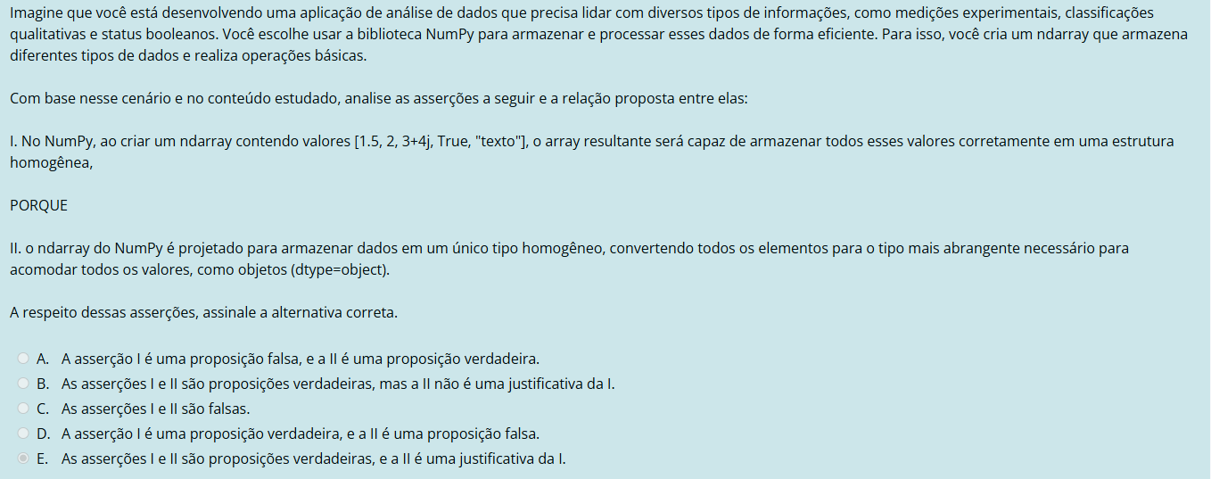 Imagine que você está desenvolvendo uma aplicação de análise de dados que precisa lidar com diversos tipos de informações, como medições experimentais, classificações qualitativas e status booleanos. Você escolhe usar a biblioteca NumPy para armazenar e processar esses dados de forma eficiente. Para isso, você cria um ndarray que armazena diferentes tipos de dados e realiza operações básicas. Com base nesse cenário e no conteúdo estudado, analise as asserções a seguir e a relação proposta entre elas: No NumPy, ao criar um ndarray contendo valores [1.5, 2, 3+4j, True, "texto"], array resultante será capaz de armazenar todos esses valores corretamente em uma estrutura homogênea, PORQUE II. O ndarray do NumPy é projetado para armazenar dados em um único tipo homogêneo, convertendo todos elementos para O tipo mais abrangente necessário para acomodar todos os valores, como objetos (dtype=object). A respeito dessas asserções, assinale a alternativa correta. A. A asserção I é uma proposição falsa, e a II é uma proposição verdadeira. B. As asserções I e II são proposições verdadeiras, mas a não é uma justificativa da I. C. As asserções I e são falsas. D. A asserção I é uma proposição verdadeira, e a é uma proposição falsa. E. As asserções I e são proposições verdadeiras, e a II é uma justificativa da I.