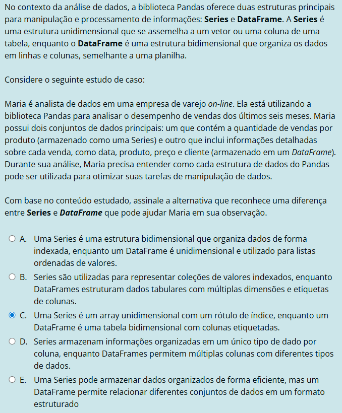 No contexto da análise de dados, a biblioteca Pandas oferece duas estruturas principais para manipulação e processamento de informações: Series e DataFrame. A Series é uma estrutura unidimensional que se assemelha a um vetor ou uma coluna de uma tabela, enquanto DataFrame é uma estrutura bidimensional que organiza dados em linhas e colunas, semelhante a uma planilha. Considere O seguinte estudo de caso: Maria é analista de dados em uma empresa de varejo on-line. Ela está utilizando a biblioteca Pandas para analisar desempenho de vendas dos últimos seis meses. Maria possui dois conjuntos de dados principais: um que contém a quantidade de vendas por produto (armazenado como uma Series) e outro que inclui informações detalhadas sobre cada venda, como data, produto, preço e cliente (armazenado em um DataFrame). Durante sua análise, Maria precisa entender como cada estrutura de dados do Pandas pode ser utilizada para otimizar suas tarefas de manipulação de dados. Com base no conteúdo estudado, assinale a alternativa que reconhece uma diferença entre Series e DataFrame que pode ajudar Maria em sua observação. A. Uma Series é uma estrutura bidimensional que organiza dados de forma indexada, enquanto um DataFrame é unidimensional e utilizado para listas ordenadas de valores. B. Series são utilizadas para representar coleções de valores indexados, enquanto DataFrames estruturam dados tabulares com múltiplas dimensões e etiquetas de colunas. C. Uma Series é um array unidimensional com um rótulo de índice, enquanto um DataFrame é uma tabela bidimensional com colunas etiquetadas. D. Series armazenam informações organizadas em um único tipo de dado por coluna, enquanto DataFrames permitem múltiplas colunas com diferentes tipos de dados. E. Uma Series pode armazenar dados organizados de forma eficiente, mas um DataFrame permite relacionar diferentes conjuntos de dados em um formato estruturado