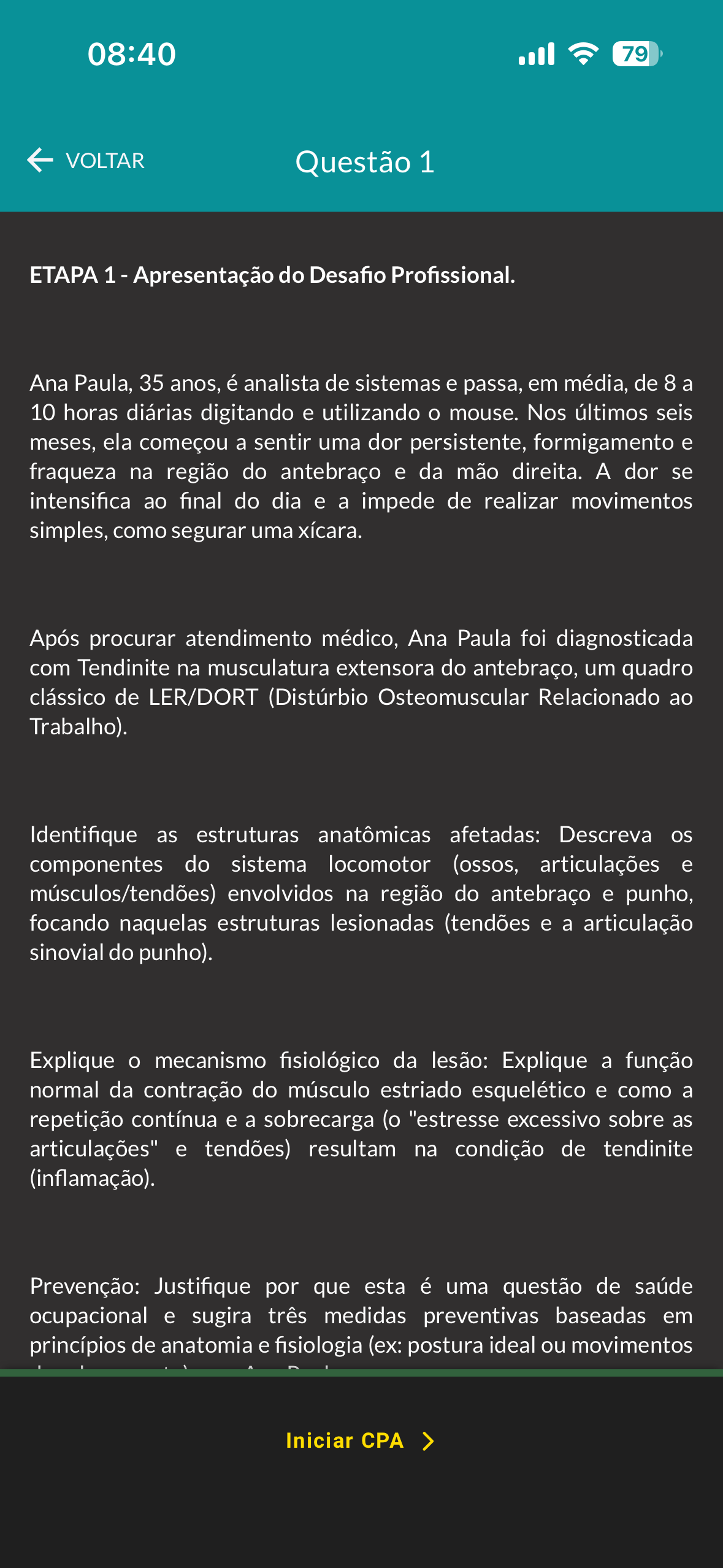 08:40 79 VOLTAR Questão 1 ETAPA 1 Apresentação do Desafio Profissional. Ana Paula, 35 anos, é analista de sistemas e passa, em média, de 8 a 10 horas diárias digitando e utilizando mouse. Nos últimos seis meses, ela começou a sentir uma dor persistente, formigamento e fraqueza na região do antebraço e da mão direita. A dor se intensifica ao final do dia e a impede de realizar movimentos simples, como segurar uma xícara. Após procurar atendimento médico, Ana Paula foi diagnosticada com Tendinite na musculatura extensora do antebraço, um quadro clássico de LER/DORT (Distúrbio Osteomuscular Relacionado ao Trabalho). Identifique as estruturas anatômicas afetadas: Descreva os componentes do sistema locomotor (ossos, articulações e músculos/tendões) envolvidos na região do antebraço e punho, focando naquelas estruturas lesionadas (tendões e a articulação sinovial do punho). Explique o mecanismo fisiológico da lesão: Explique a função normal da contração do músculo estriado esquelético e como a repetição contínua e a sobrecarga "estresse excessivo sobre as articulações" e tendões) resultam na condição de tendinite (inflamação). Prevenção: Justifique por que esta é uma questão de saúde ocupacional e sugira três medidas preventivas baseadas em princípios de anatomia e fisiologia (ex: postura ideal ou movimentos Iniciar >