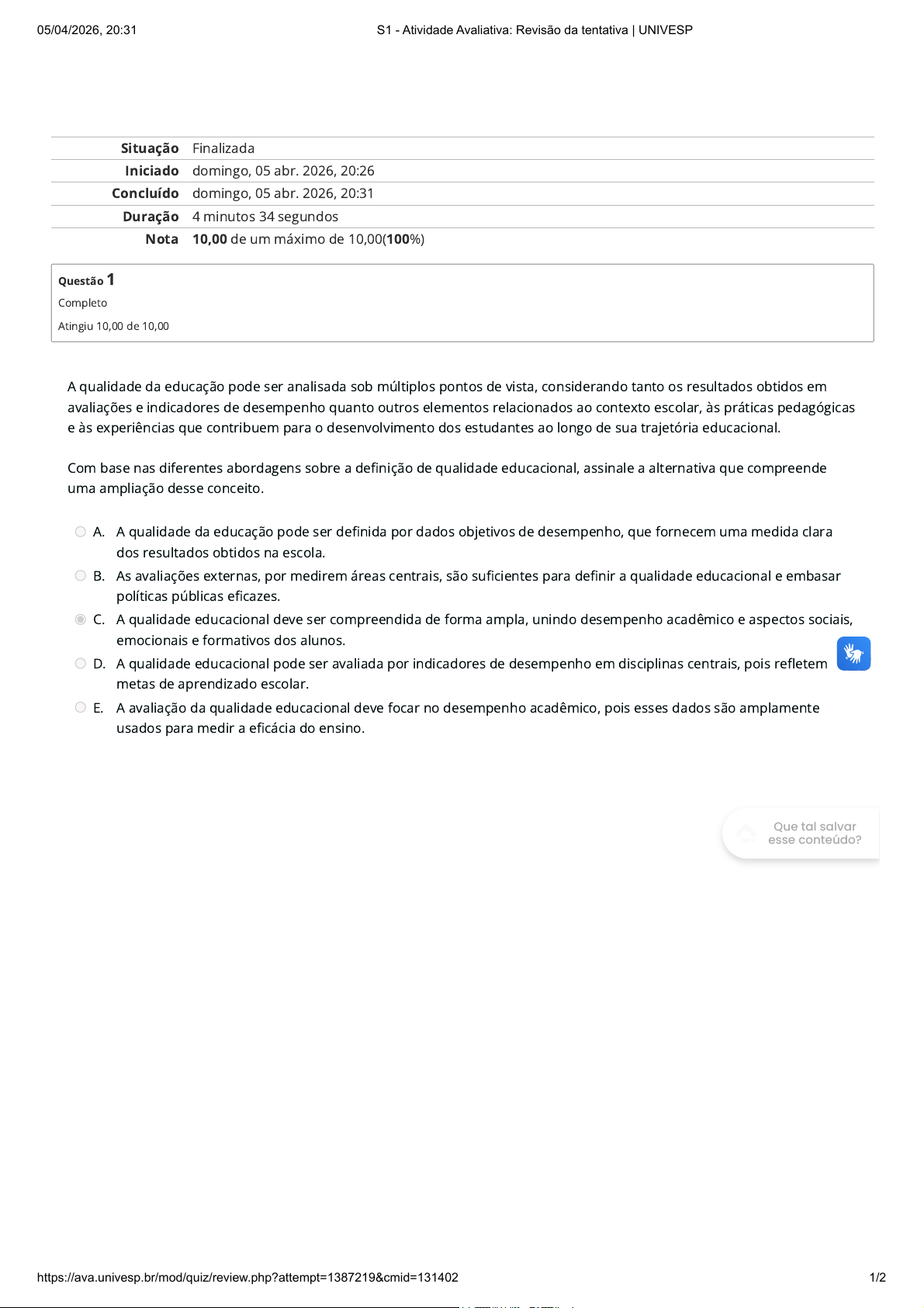 Situação Finalizada Iniciado domingo, 05 abr. 2026, 20:26 Concluído domingo, 05 abr. 2026, 20:31 Duração 4 minutos 34 segundos Nota 10,00 de um máximo de 10,00(100%) Questão 1 Completo Atingiu 10,00 de 10,00 A qualidade da educação pode ser analisada sob múltiplos pontos de vista, considerando tanto os resultados obtidos em avaliações e indicadores de desempenho quanto outros elementos relacionados ao contexto escolar, às práticas pedagógicas e às experiências que contribuem para o desenvolvimento dos estudantes ao longo de sua trajetória educacional. Com base nas diferentes abordagens sobre a definição de qualidade educacional, assinale a alternativa que compreende uma ampliação desse conceito. A. A qualidade da educação pode ser definida por dados objetivos de desempenho, que fornecem uma medida clara dos resultados obtidos na escola. B. As avaliações externas, por medirem áreas centrais, são suficientes para definir a qualidade educacional e embasar políticas públicas eficazes. C. A qualidade educacional deve ser compreendida de forma ampla, unindo desempenho acadêmico e aspectos sociais, emocionais e formativos dos alunos. D. A qualidade educacional pode ser avaliada por indicadores de desempenho em disciplinas centrais, pois refletem metas de aprendizado escolar. E. A avaliação da qualidade educacional deve focar no desempenho acadêmico, pois esses dados são amplamente usados para medir a eficácia do ensino. Que tal salvar esse conteúdo? 05/04/2026, 20:31 S1 - Atividade Avaliativa: Revisão da tentativa | UNIVESP https://ava.univesp.br/mod/quiz/review.php?attempt=1387219&cmid=131402 1/2 Que tal salvar esse conteúdo? 05/04/2026, 20:31 S1 - Atividade Avaliativa: Revisão da tentativa | UNIVESP https://ava.univesp.br/mod/quiz/review.php?attempt=1387219&cmid=131402 2/2