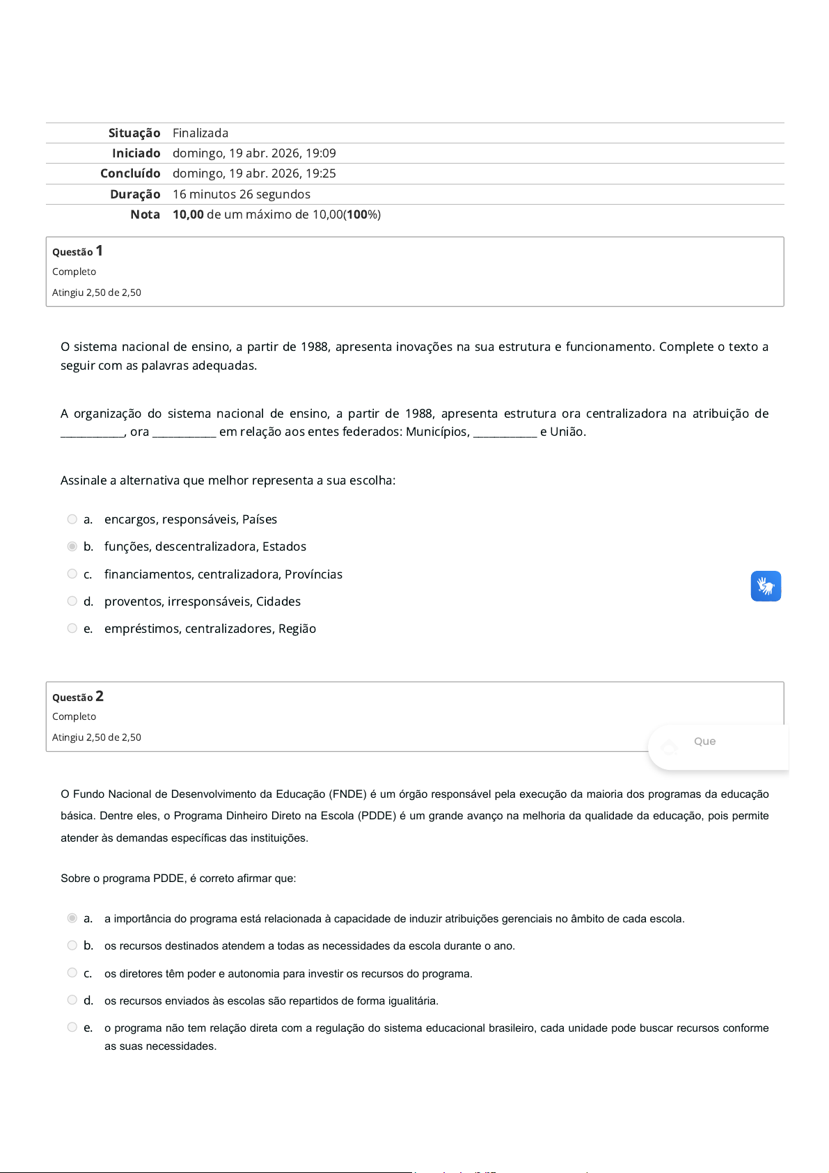 Situação Finalizada Iniciado domingo, 19 abr. 2026, 19:09 Concluído domingo, 19 abr. 2026, 19:25 Duração 16 minutos 26 segundos Nota 10,00 de um máximo de 10,00(100%) Questão 1 Completo Atingiu 2,50 de 2,50 Questão 2 Completo Atingiu 2,50 de 2,50 O sistema nacional de ensino, a partir de 1988, apresenta inovações na sua estrutura e funcionamento. Complete o texto a seguir com as palavras adequadas. A organização do sistema nacional de ensino, a partir de 1988, apresenta estrutura ora centralizadora na atribuição de ____________, ora ____________ em relação aos entes federados: Municípios, ____________ e União. Assinale a alternativa que melhor representa a sua escolha: a. encargos, responsáveis, Países b. funções, descentralizadora, Estados c. financiamentos, centralizadora, Províncias d. proventos, irresponsáveis, Cidades e. empréstimos, centralizadores, Região O Fundo Nacional de Desenvolvimento da Educação (FNDE) é um órgão responsável pela execução da maioria dos programas da educação básica. Dentre eles, o Programa Dinheiro Direto na Escola (PDDE) é um grande avanço na melhoria da qualidade da educação, pois permite atender às demandas específicas das instituições. Sobre o programa PDDE, é correto afirmar que: a. a importância do programa está relacionada à capacidade de induzir atribuições gerenciais no âmbito de cada escola. b. os recursos destinados atendem a todas as necessidades da escola durante o ano. c. os diretores têm poder e autonomia para investir os recursos do programa. d. os recursos enviados às escolas são repartidos de forma igualitária. e. o programa não tem relação direta com a regulação do sistema educacional brasileiro, cada unidade pode buscar recursos conforme as suas necessidades. Que tal salvar esse conteúdo? 19/04/2026, 19:25 S3 - Atividade Avaliativa: Revisão da tentativa | UNIVESP https://ava.univesp.br/mod/quiz/review.php?attempt=1693468&cmid=134332 1/2 Questão 3 Completo Atingiu 2,50 de 2,50 Questão 4 Completo Atingiu 2,50 de 2,50 O Artigo 211, proveniente da Constituição Federal (BRASIL, 1988), apresenta, em seu texto, a pluralização do sistema de ensino brasileiro. Isso significa que a União, os Estados, o Distrito Federal e os Municípios organizarão, em regime de colaboração, seus sistemas de ensino. BRASIL. [Constituição (1988)]. Constituição da República Federativa do Brasil de 1988. Brasília, DF: Presidência da República, [2020]. Disponível em: http://www.planalto.gov.br/ccivil_03/constituicao/constituicao.htm. Acesso em: 9 out. 2022. Considerando o texto da lei, assinale a alternativa correta. a. A educação básica pública é composta pela educação infantil e cursos de extensão. b. A equalização de oportunidades educacionais deve ser uma responsabilidade dos estados. c. Os estados e o Distrito Federal atuarão prioritariamente no ensino fundamental e médio. d. Somente o Distrito Federal exercerá ação redistributiva em relação às suas instituições. e. Os municípios atuarão prioritariamente no ensino médio. A estrutura do sistema educacional brasileiro, no âmbito legal (e também na realidade prática) apresentava até a década de 1980 um caráter excludente e seletivo. Qual a lei que possibilitou o início da mudança na realidade educacional e em toda a sociedade brasileira? Identifique e marque a alternativa correta abaixo. a. Exame Nacional de Cursos (ENC) - Portaria n.º 249/1996. b. Fundo de Manutenção e Desenvolvimento do Ensino Fundamental e de Valorização do Magistério (FUNDEF) - Lei 9.394/1996 c. Base Nacional Comum Curricular (BNCC) - Resolução CNE/CP nº 2, de 22 de dezembro de 2017. d. Lei de Diretrizes e Bases da Educação Nacional (LDB) - Lei 9.394/1996 e. Constituição Federal (CF) de 1988. Que tal salvar esse conteúdo? 19/04/2026, 19:25 S3 - Atividade Avaliativa: Revisão da tentativa | UNIVESP https://ava.univesp.br/mod/quiz/review.php?attempt=1693468&cmid=134332 2/2 http://www.planalto.gov.br/ccivil_03/constituicao/constituicao.htm