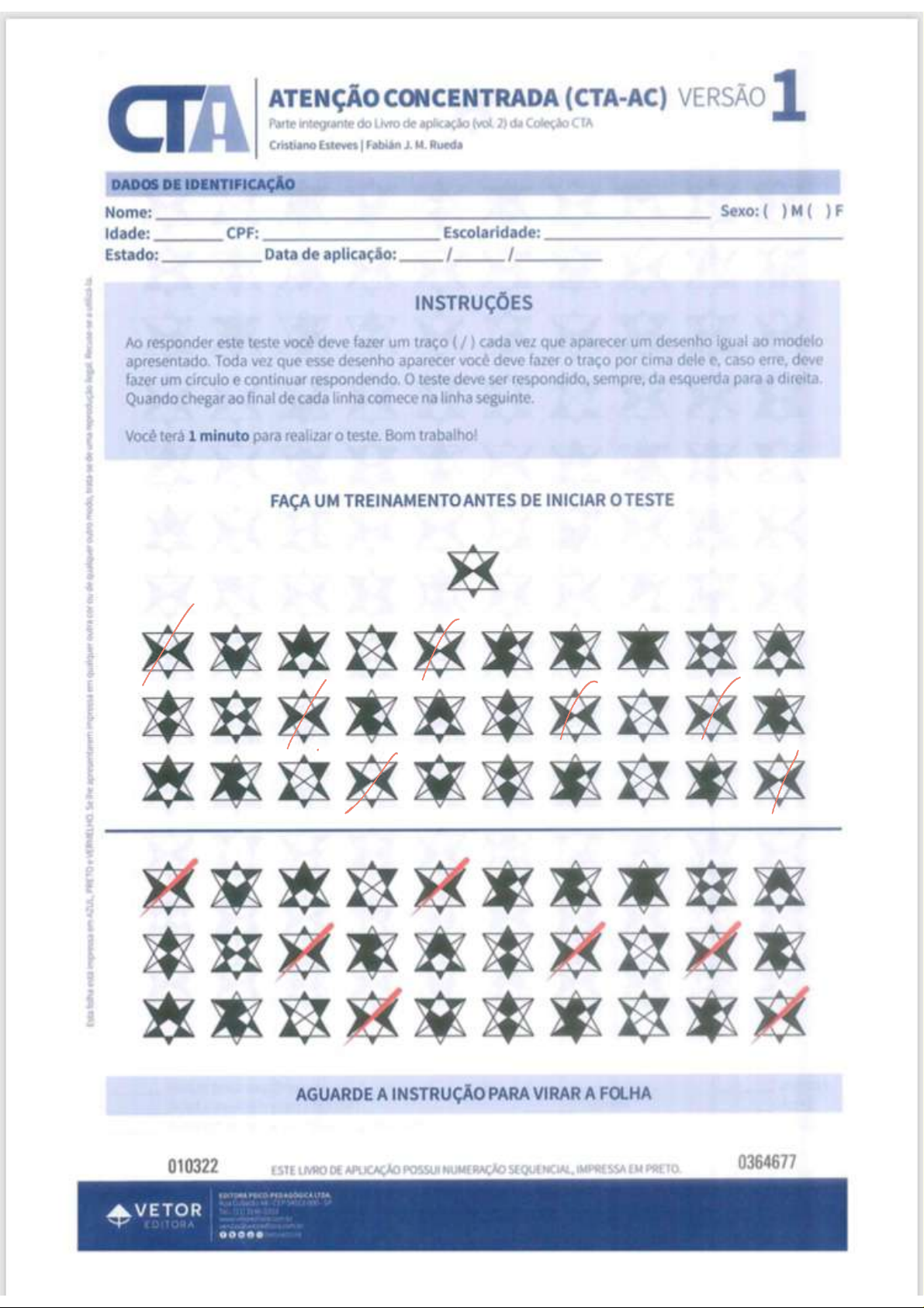 CTA ATENÇÃO CONCENTRADA (CTA-AC) VERSÃO 1 Parte integrante do Livro de aplicação 2) da Coleção CTA Cristiano Esteves I Fabián J. M. Rueda DADOS DE IDENTIFICAÇÃO Nome: Sexo: M( ) F Idade: CPF: Escolaridade: Estado: Data de aplicação: / / INSTRUÇÕES Ao responder este teste deve fazer um traço (/) cada vez que aparecer um desenho igual modelo apresentado. Toda vez que esse desenho aparecer você deve fazer o traço por cima dele caso erre, deve fazer um círculo e continuar respondendo. o teste deve ser respondido, sempre, da esquerda para a direita. Quando chegar ao final de cada linha comece na linha seguinte. Você terá 1 minuto para realizar 0 teste. Bom trabalho! - ou de reprodução FAÇA UM TREINAMENTO ANTES DE INICIAR TESTE AGUARDE A INSTRUÇÃO PARA VIRAR A FOLHA 010322 ESTE LIVRO DE APLICAÇÃO POSSUI NUMERAÇÃO IMPRESSA EM 0364677 VETOR EDITORAAcertos: Percentil por faixa etária: Erros: Pontos: Percentil para a amostra total: Omissões: Percentil por região para a amostra total:ATENÇÃO DIVIDIDA (CTA-AD) VERSÃO 1 Parte integrante do Livro de aplicação (vol. 5) da Coleção CTA Cristiano Esteves Fabián J. M. Rueda DADOS DE IDENTIFICAÇÃO Nome: Sexo: ( ) F Idade: CPF: Escolaridade: Estado: Data de aplicação: / / INSTRUÇÕES Ao responder este teste você deve fazer um traço (/) cada vez que aparecer um desenho que for igual a qualquer um dos três (3) modelos Toda vez que qualquer um desses desenhos aparecer você deve fazer traço por cima dele e, caso erre, deve fazer um e continuar respondendo. Eles podem ou não estar um do lado do outro. teste deve ser respondido, sempre, da esquerda para a direita. Quando chegar final de cada linha comece na linha seguinte. Você terá 1 minuto e 45 segundos para realizar 0 teste. Bom trabalho! FAÇA UM TREINAMENTO ANTES DE INICIAR o TESTE AGUARDE A INSTRUÇÃO PARA VIRAR A FOLHA 010122 0260177 ESTE LIVRO DE APLICAÇÃO POSSUI NUMERAÇÃO IMPRESSA EM VETOR EDITORAcertos: Percentil por faixa etária: Erros: Pontos: Percentil para a amostra total: Omissões: Percentil por região para a amostra total:ATENÇÃO ALTERNADA (CTA-AA) VERSÃO 1 Parte integrante do Livro de aplicação (vol. B) da Coleção CTA Cristiano Esteves I Fabián J. M. Rueda DADOS DE IDENTIFICAÇÃO Nome: Sexo: F Idade: CPF: Escolaridade: Estado: Data de aplicação: / / INSTRUÇÕES Ao responder este teste você deve fazer um traço (/) cada vez que aparecer um desenho que for igual ao modelo que se encontra do lado esquerdo da folha. Fique atento, pois em cada linha deverá ser procurado e marcado um desenho diferente. Caso erre, deve fazer um circulo e continuar respondendo. teste deve ser respondido, sempre, da esquerda para a Quando chegar ao final de cada linha comece na linha seguinte. Mais uma vez, lembre que em cada linha deverá ser marcado um desenho diferente, que está do esquerdo da seta. Você terá 1 minuto e 15 segundos para realizar teste. Bom trabalho! Se the qualquer FAÇA UM TREINAMENTO ANTES DE INICIAR TESTE AGUARDE A INSTRUÇÃO PARA VIRAR A FOLHA 010222 ESTE LIVRO DE APLICAÇÃO POSSUI NUMERAÇÃO IMPRESSA EM 0400077 EDITORA VETOR EDITORAAcertos: Percentil por faixa etária: Erros: Pontos: Percentil para a amostra total: Omissões: Percentil por região para a amostra total:CTA ATENÇÃO CONCENTRADA (CTA-AC) VERSÃO 2 Parte integrante do Livro de aplicação 3) da Coleção CTA Cristiano Esteves Fabián J.M. Rueda DADOS DE IDENTIFICAÇÃO Nome: Sexo: M( )F Idade: CPF: Escolaridade: Estado: Data de aplicação: / / INSTRUÇÕES Ao responder este teste você deve fazer um traço (/) cada vez que aparecer um desenho Igual ao modelo Toda vez que esse desenho aparecer você deve fazer traço por cima dele e, caso erre, deve fazer um circulo e continuar respondendo. teste deve ser respondido, sempre, da esquerda para a direita. Quando chegar ao final de cada linha comece na linha seguinte. Você terá 1 minuto para realizar 0 teste. Bom trabalho! to the qualquer outra de qualquer de uma FAÇA UM TREINAMENTO ANTES DE INICIAR TESTE AGUARDE A INSTRUÇÃO PARA VIRAR A FOLHA 010322 0249577 ESTE LIVRO DE APLICAÇÃO POSSUI NUMERAÇÃO IMPRESSA EM VETOR EDITORAAcertos: Percentil por faixa etária: Erros: Pontos: Percentil para a amostra total: Omissões: Percentil por região para a amostra total:ATENÇÃO DIVIDIDA (CTA-AD) VERSÃO 2 Parte integrante do Livro de aplicação 6) da Coleção CTA Cristiano Esteves I Fabián J.M. Rueda DADOS DE IDENTIFICAÇÃO Nome: Sexo: M( ) F Idade: CPF: Escolaridade: Estado: Data de aplicação: / / INSTRUÇÕES Ao responder este teste você deve fazer um traço cada vez que aparecer um desenho que for a qualquer um dos três (3) modelos Toda vez que qualquer um desses desenhos aparecer você deve fazer traço por cima dele e, caso erre, deve fazer um circulo e continuar respondendo. Eles podem não estar um do lado do teste deve ser respondido, sempre, da esquerda para a direita. Quando chegar ao final de cada linha comece na linha seguinte. Você terá 1 minuto e 45 segundos para realizar o teste. Bom trabalho! FAÇA UM ANTES DE INICIAR TESTE AGUARDE A INSTRUÇÃO PARA VIRAR A FOLHA 010821 ESTE LIVRO DE APLICAÇÃO POSSUI NUMERAÇÃO IMPRESSA EM 0116177 VETOR EDITORAAcertos: Percentil por faixa etária: Erros: Pontos: Percentil para a amostra total: Omissões: Percentil por região para a amostra total:ATENÇÃO ALTERNADA (CTA-AA) VERSÃO 2 Parte integrante do Livro de aplicação 9) da Coleção CTA Cristiano Esteves J. M. Rueda DADOS DE IDENTIFICAÇÃO Nome: Sexo: ) F Idade: CPF: Escolaridade: Estado: Data de aplicação: / / INSTRUÇÕES Ao responder este teste você deve fazer um traço (/) cada vez que aparecer um desenho que for igual ao modelo que se encontra do lado esquerdo da folha. Fique atento, pois em cada linha deverá ser procurado e marcado um desenho diferente. Caso erre, deve fazer um e continuar 0 teste deve ser respondido, sempre, da esquerda para a direita. Quando chegar ao final d