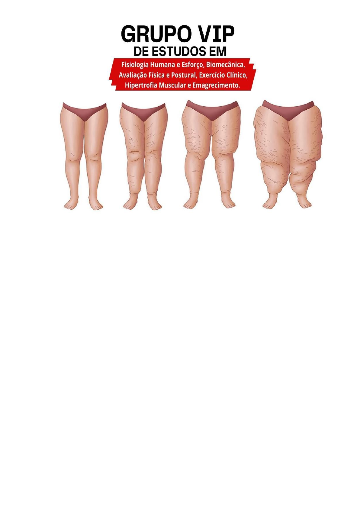 Grupo vip – Prof Nailson LIPEDEMA E EXERCÍCIOS FÍSICOS: QUAIS SÃO OS MAIS INDICADOS? Recentemente, o lipedema tem ganhado destaque nas discussões sobre saúde. Essa condição crônica e progressiva do tecido adiposo afeta principalmente mulheres e pode ocasionar uma série de sintomas, envolvendo inchaço, dor nas áreas acometidas, cansaço, facilidade para desenvolver hematomas e baixa autoestima. Apesar de não ser uma doença nova, ainda há muitas dúvidas sobre as formas de tratamento do lipedema, e quais atividades podem auxiliar ou agravar o quadro. Nesse sentido, será que os exercícios físicos podem ajudar a aliviar esses sintomas? E, mais importante, existem atividades que devem ser evitadas por quem tem lipedema? Afinal: o que é o lipedema? O lipedema é uma doença crônica e inflamatória do tecido adiposo subcutâneo, caracterizada pelo acúmulo anormal de gordura. Embora afete principalmente os membros inferiores, também pode acometer os braços, se manifestando através do aumento simétrico dos membros, sem afetar as mãos, o tronco ou os pés. A condição predomina no sexo feminino, acometendo cerca de 11% das mulheres após a puberdade. O diagnóstico em homens não é comum, e Grupo vip – Prof Nailson geralmente está associado a quadros de hipogonadismo ou doenças hepáticas, em que ocorre aumento dos níveis de estrogênio e queda de testosterona. Quais os graus do Lipedema? O Lipedema acompanha graus (ou estágios), entre eles, muda a forma como a doença se manifesta e quais as indicações para solucionar a condição. São eles: Grau 1 – Fase inicial No primeiro estágio, há um pouco mais de gordura nas pernas e quadris, e às vezes é possível sentir pequenos nódulos sob a pele. As pernas podem parecer pesadas, haver um pouco de dor ao tocá-las e, às vezes, podem aparecer hematomas leves. Quais os sintomas do Lipedema? De modo geral, esse acúmulo de gordura pode causar como principais consequências os seguintes problemas: - Peso e desconforto - Formas e contorno irregulares - Propensão a contusões - Alterações na textura da pele - Impacto emocional e/ou psicológico - Reduzir e/ou comprometer a mobilidade - Variação hormonal Grupo vip – Prof Nailson Grau 2 – Evolução do quadro inicial A quantidade de gordura nas pernas e quadris aumenta bastante. Fazendo com que as pernas pareçam ter um formato de “culote”. A sensibilidade e a dor ficam mais fortes e é possível ter hematomas mesmo com pequenos machucados. Nesse grau, a mobilidade já começa a adquirir dificuldades por causa do aumento de gordura. Grau 3 – Evolução significativa do quadro A doença avança junto à quantidade de gordura, deixando a pele com a aparência que chamamos de “casca de laranja”. No grau 3, as dificuldades para se movimentar ficam sérias, e a sensibilidade e a dor se tornam intensas. Estágio em que a qualidade de vida já é muito afetada devido aos sintomas da Lipedema. Grau 4 – Diagnóstico avançado No estágio mais avançado, o quarto grau, a doença tem um impacto muito forte na vida do paciente. O acúmulo de gordura é extremamente alto, causando deformidades e limitando muito a capacidade de se movimentar a ponto de ser difícil realizar as mais simples atividades diárias. Áreas do corpo Lipedema nos Joelhos Nos joelhos, o Lipedema se manifesta geralmente com o acúmulo de gordura ao redor da rótula, formando um contorno irregular. Em termos, a aparência indesejada pode se assemelhar ao formato de uma pêra ou colchão dependendo da região. Grupo vip – Prof Nailson Desse modo, o Lipedema acaba causando sensação de peso e desconforto nos joelhos e em alguns casos mais avançados, pode afetar a mobilidade. Lipedema nas Pernas As pernas são frequentemente as áreas mais afetadas pelo Lipedema. Com o aumento desproporcional de gordura vindo desde as coxas até as panturrilhas. O contorno irregular característico nas pernas pode vir acompanhado de sensibilidade, dor e maior facilidade em sofrer contusões. Lipedema nas Coxas Por consequência das pernas, outra região muito afetada são as coxas. A gordura excessiva nas coxas se acumula de modo a conferir uma aparência característica com inchaços, uma pele mais seca e vários hematomas. Aqui, essa distribuição de gordura desproporcional deixa clara as áreas afetadas e não afetadas do corpo, o que pode evidenciar o diagnóstico de Lipedema. Outra indicação é o paciente que apresenta uma cicatriz preexistente na linha mediana abdominal (comum nas cirurgias bariátricas abertas ou cirurgias abdominais). Lipedema nos Braços Embora o Lipedema seja mais associado às pernas, ela também afeta os braços, especialmente a parte superior, ou seja, entre ombros e cotovelos. Nessa parte do corpo, a gordura excessiva dá aquela aparência de pele esticada ou “derretida”. Além disso, nos braços, o Lipedema pode ser sensível ao toque. DETALHE O lipedema é frequentemente subdiagnosticado, pois pode ser confundido com obesidade. No entanto, a histologia do tecido adiposo em pacientes com lipedema apresenta diferenças marcantes em comparação com o tecido adiposo subcutâneo comum. Essas pacientes frequentemente apresentam uma expressão anormal de receptores de estrogênio no tecido adiposo, e o ambiente estrogênico alterado favorece o armazenamento de lipídios de forma irregular, resultando no aumento significativo dos adipócitos. O tecido adiposo anormal em pacientes com lipedema parece não responder a dietas com déficit calórico nem à prática de exercícios físicos. Portanto, o IMC pode não ser um parâmetro confiável para o controle da doença, uma vez que o acúmulo desse tipo de tecido adiposo não parece estar diretamente relacionado ao percentual de gordura corporal total. Mesmo em pacientes que não Grupo vip – Prof Nailson apresentam obesidade, o tecido adiposo dessas mulheres demonstra sinais de inflamação, com infiltração de macrófa