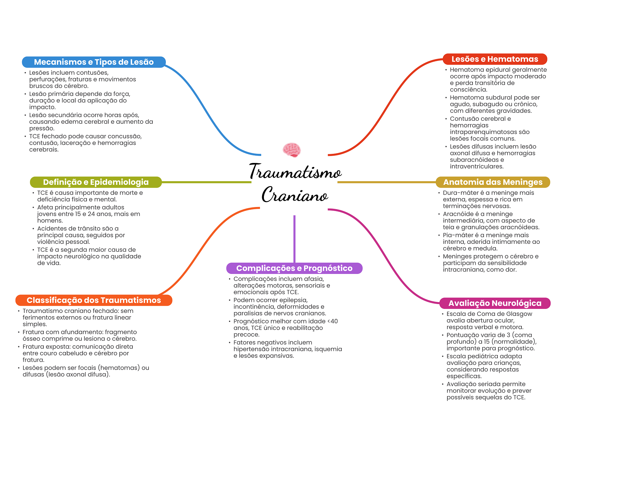 Mecanismos e Tipos de Lesão Lesões e Hematomas Lesões incluem contusões, Hematoma epidural geralmente perfurações, fraturas e movimentos ocorre após impacto moderado bruscos do cérebro. e perda transitória de consciência. Lesão primária depende da força, duração e local da aplicação do Hematoma subdural pode ser impacto. agudo, subagudo ou crônico, com diferentes gravidades. Lesão secundária ocorre horas após, Contusão cerebral e causando edema cerebral e aumento da pressão. hemorragias intraparenquimatosas são TCE fechado pode causar concussão, lesões focais comuns. contusão, laceração e hemorragias Lesões difusas incluem lesão cerebrais. axonal difusa e hemorragias subaracnóideas e Traumatismo intraventriculares Definição e Epidemiologia Anatomia das Meninges TCE é causa importante de morte e deficiência física e mental. Craniano Dura-máter é a meninge mais externa, espessa e rica em Afeta principalmente adultos terminações nervosas. jovens entre 15 e 24 anos, mais em Aracnóide é a meninge homens. intermediária, com aspecto de Acidentes de trânsito são a teia e granulações aracnóideas. principal causa, seguidos por Pia-máter é a meninge mais violência pessoal. interna, aderida intimamente ao TCE é a segunda maior causa de cérebro e medula. impacto neurológico na qualidade Meninges protegem cérebro e de vida. participam da sensibilidade Complicações e Prognóstico intracraniana, como dor. Complicações incluem afasia, alterações motoras, sensoriais e emocionais após TCE. Classificação dos Traumatismos Podem ocorrer epilepsia, incontinência, deformidades e Avaliação Neurológica Traumatismo craniano fechado: sem paralisias de nervos cranianos. ferimentos externos ou fratura linear Escala de Coma de Glasgow Prognóstico melhor com idade