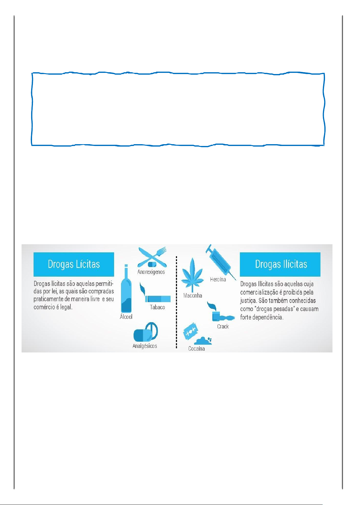 A palavra droga provavelmente tem origem francesa (drogue) ou holandesa (droog) e, originalmente, referia-se às folhas secas utilizadas nos tratamentos de doenças. Atualmente, essa denominação está relacionada não apenas às substâncias utilizadas no tratamento de doenças, tampouco às substâncias de origem natural (extraídas da natureza) apenas, referindo-se também às substâncias de uso recreativo e de origem sintética (produzidas em laboratório e com ausência de substâncias naturais em sua composição) e semissintética (produzidas em laboratório com a presença de substâncias naturais em sua composição). Drogas e Sistema Nervoso Denominam-se drogas quaisquer substâncias utilizadas que causam alterações na estrutura e funções do organismo. Podem ser classificadas quanto à origem, efeitos, entre outros. As drogas são utilizadas pelo homem há séculos. Inicialmente, eram retiradas da natureza – as folhas secas eram o principal recurso no tratamento de doenças. Atualmente, muitas dessas drogas são sintetizadas em laboratórios, e muitas são usadas de forma recreativa. O homem sempre teve uma relação com a natureza de forma íntima. A utilização das plantas em seu dia a dia foi essencial para o conhecimento de suas diversas propriedades, como a existência de substâncias psicoativas. O homem faz uso dessas substâncias desde a antiguidade, como para suportar algumas adversidades no ambiente em que viviam, como o cansaço. Em seguida, essas substâncias passaram a ser utilizadas em rituais religiosos, como forma de cura, ou recreativamente. Tipos de drogas As drogas podem ser classificadas, de acordo com o ponto de vista legal, por meio dos efeitos produzidos no sistema nervoso central, dos efeitos de acordo com a indicação terapêutica, entre outras formas. De acordo com o ponto de vista legal (essa classificação pode variar entre países, pois possuem legislações diferentes). De acordo com a legislação brasileira: De acordo com os efeitos produzidos no sistema nervoso central (essa classificação é bastante utilizada pelos profissionais de saúde): Figura: Drogas lícitas e ilícitas. Disponível em: . Acesso em 09 set. 2020. Drogas Ilícitas Os entorpecentes ilícitos ou drogas ilícitas, como dito anteriormente, são drogas cuja venda e consumo são proibidos. No Brasil, são exemplos de drogas ilícitas a maconha, cocaína, entre outras. O debate sobre a legalidade e ilegalidade das drogas vai além dos benefícios ou malefícios que causam no organismo, tendo também os fatores cultural e econômico um peso significativo nas tomadas de decisões. No Brasil, por exemplo, o álcool e o tabaco são substâncias que têm sua venda e consumo liberados, ou seja, são drogas lícitas. É importante destacar que a venda dessas substâncias a menores de 18 anos é proibida por lei. No entanto, o álcool e o tabaco são responsáveis pelo desenvolvimento de diversas enfermidades. O álcool, devido às alterações que causam no estado de consciência, está relacionado também a outros problemas, como violência e acidentes de trânsito. Efeitos das Drogas no Cérebro Os efeitos que as drogas causam no organismo variam entre os indivíduos. No entanto, sabe-se que o seu efeito no cérebro está relacionado principalmente com a sua ação sobre os neurotransmissores, atuando no estímulo dos neurônios. Muitas drogas atuam desencadeando uma sensação de prazer ou causando alucinações. Porém, o consumo de drogas ao longo do tempo pode desencadear alterações no sistema nervoso de forma que, para que se sintam os mesmos efeitos ao consumir determinada droga, a dosagem deve ser aumentada. A partir desse ponto, pode ser caracterizada a dependência química, pois da mesma maneira que o indivíduo passa a utilizar uma dosagem maior para obter um determinado efeito, a diminuição ou ausência do consumo também gera efeitos específicos de mal-estar, levando a uma compulsão pelo consumo com maior frequência da droga. Disponível em: . Acesso em 09 set. 2020. Consequências do Uso de Drogas na Família O consumo de drogas pode causar efeitos diversos nos indivíduos. Um desses efeitos é a dependência química, que vem se tornando um problema grave de saúde pública no país. A dependência química afeta a vida do dependente de diversas formas, seja em suas relações afetivas, seja como profissionais, o que acaba por desestruturar muitas famílias. Disponível em: Acesso em 09 set. 2020. Resolva em seu caderno as atividades a seguir. 1. Dentre os prejuízos sociais associados ao consumo de álcool estão os acidentes de trânsito, sendo um problema de preocupação mundial e que acarretam um número excessivo de mortes e prejuízos por ano. http://conselheiros6.nute.ufsc.br/ebook/modulo-1.html A proibição do consumo de álcool para quem pretende dirigir é devido ao fato de que o consumo de bebida alcóolica a) ( ) acelera o funcionamento do corpo. b) ( ) deixa os reflexos mais lentos. c) ( ) melhora a coordenação motora. d) ( ) provoca estado de euforia. 2. O homem faz uso de substâncias psicoativas desde a antiguidade, para suportar algumas adversidades no ambiente em que viviam, como o cansaço, e atualmente para uso recreativo, por exemplo. Como essas substâncias psicoativas agem no sistema nervoso central? 3. Selecione a alternativa que completa as lacunas das afirmações seguintes: I – A utilização das plantas em seu dia a dia foi essencial para o conhecimento de suas diversas propriedades, como a existência de substâncias . II – As drogas podem ser classificadas, de acordo com o ponto de vista legal, por meio dos efeitos produzidos no , dos efeitos de acordo com a indicação , entre outras formas. a) ( ) psicoativas – sistema nervoso – terapêutica. b) ( ) alternativas – sistema endócrino – médica. c) ( ) depressoras – sistema periférico – clínica. d) ( ) recreativas – sistema nervoso – social. 4. O