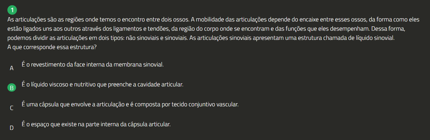 1 As articulações são as regiões onde temos 0 encontro entre dois OSSOS. A mobilidade das articulações depende do encaixe entre esses da forma como eles estão ligados uns aos outros através dos ligamentos e tendões, da região do corpo onde se encontram e das funções que eles desempenham. Dessa forma, podemos dividir as articulações em dois tipos: não sinoviais e sinoviais. As articulações sinoviais apresentam uma estrutura chamada de líquido sinovial. A que corresponde essa estrutura? É revestimento da face interna da membrana sinovial. A É líquido viscoso e nutritivo que preenche a cavidade articular. É uma cápsula que envolve a articulação e é composta por tecido conjuntivo vascular. É 0 espaço que existe na parte interna da cápsula articular. D