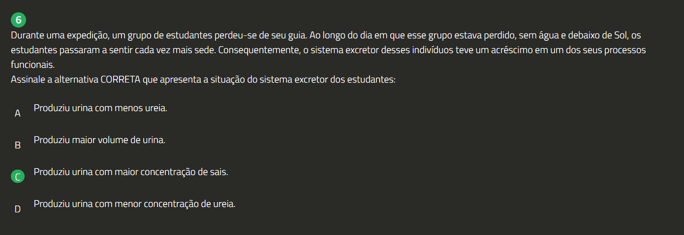 6 Durante uma expedição, um grupo de estudantes perdeu-se de seu guia. Ao longo do dia em que esse grupo estava perdido, sem água e de Sol, estudantes passaram a sentir cada vez mais sede. Consequentemente, 0 sistema excretor desses indivíduos teve um acréscimo em um dos seus processos funcionais. Assinale a alternativa CORRETA que apresenta a situação do sistema excretor dos estudantes: Produziu urina com menos ureia. A Produziu maior volume de urina. B Produziu urina com maior concentração de sais. D Produziu urina com menor concentração de ureia.