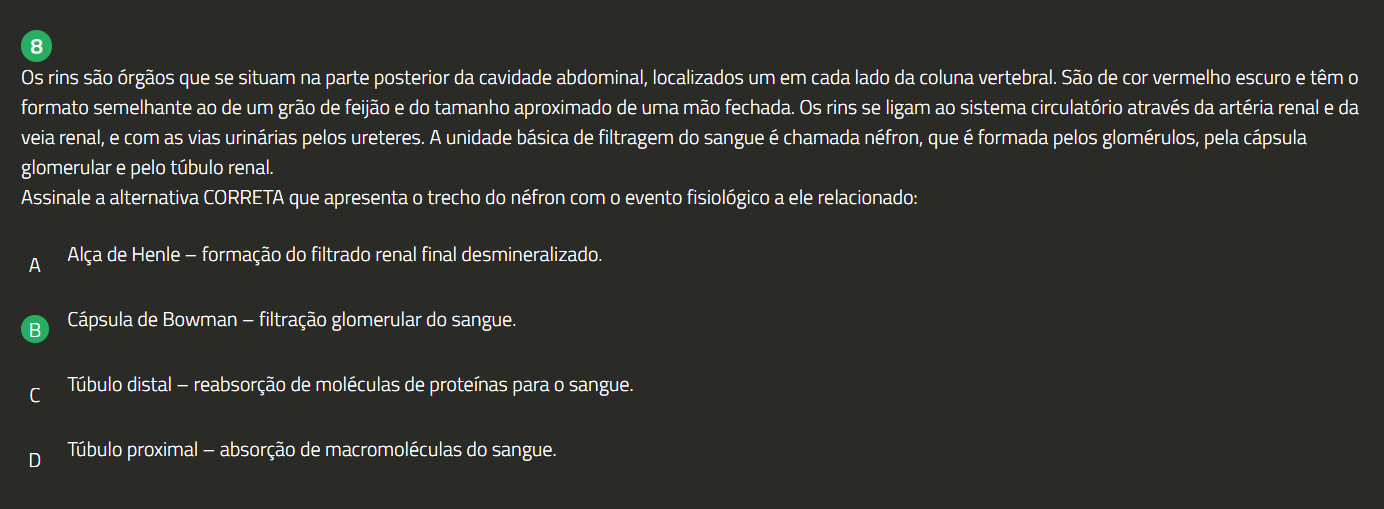 8 Os rins são órgãos que se situam na parte posterior da cavidade abdominal, localizados um em cada lado da coluna vertebral. São de cor vermelho escuro e têm 0 formato semelhante ao de um grão de feijão e do tamanho aproximado de uma mão fechada. Os rins se ligam ao sistema circulatório através da artéria renal e da veia renal, e com as vias urinárias pelos ureteres. A unidade básica de filtragem do sangue é chamada néfron, que é formada pelos glomérulos, pela cápsula glomerular e pelo túbulo renal. Assinale a alternativa CORRETA que apresenta trecho do néfron com 0 evento fisiológico a ele relacionado: A Alça de Henle - formação do filtrado renal final desmineralizado. Cápsula de Bowman - filtração glomerular do sangue. Túbulo distal - reabsorção de moléculas de proteínas para 0 sangue. D Túbulo proximal absorção de macromoléculas do sangue.