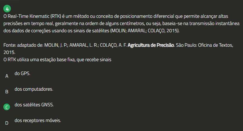 4 0 Real-Time Kinematic (RTK) é um método ou conceito de posicionamento diferencial que permite alcançar altas precisões em tempo real, geralmente na ordem de alguns centímetros, ou seja, baseia-se na transmissão instantânea dos dados de correções usando sinais de satélites (MOLIN; AMARAL; COLAÇO, 2015). Fonte: adaptado de: MOLIN, J. P.; AMARAL, L. R.; COLAÇO, A. F. Agricultura de Precisão. São Paulo: Oficina de Textos, 2015. 0 RTK utiliza uma estação base fixa, que recebe sinais do GPS. A dos computadores. dos satélites GNSS. D dos receptores móveis.