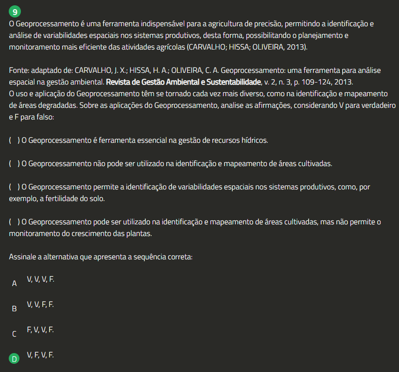 9 0 Geoprocessamento é uma ferramenta indispensável para a agricultura de precisão, permitindo a identificação e análise de variabilidades espaciais nos sistemas produtivos, desta forma, possibilitando 0 planejamento e monitoramento mais eficiente das atividades agrícolas (CARVALHO; HISSA; OLIVEIRA, 2013). Fonte: adaptado de: CARVALHO, J. X.; HISSA, H. A.; OLIVEIRA, C.A. Geoprocessamento: uma ferramenta para análise espacial na gestão ambiental. Revista de Gestão Ambiental e Sustentabilidade, V. 2, n. 3, p. 109-124, 2013. 0 uso e aplicação do Geoprocessamento têm se tornado cada vez mais diverso, como na identificação e mapeamento de áreas degradadas. Sobre as aplicações do Geoprocessamento, analise as afirmações, considerando V para verdadeiro e F para falso: ( ) 0 Geoprocessamento é ferramenta essencial na gestão de recursos hídricos. ( ) 0 Geoprocessamento não pode ser utilizado na identificação e mapeamento de áreas cultivadas. ( ) 0 Geoprocessamento permite a identificação de variabilidades espaciais nos sistemas produtivos, como, por exemplo, a fertilidade do solo. 0 Geoprocessamento pode ser utilizado na identificação e mapeamento de áreas cultivadas, mas não permite monitoramento do crescimento das plantas. Assinale a alternativa que apresenta a sequência correta: V,V,V,F. A B F,V,V,F. V,F,V,F. D