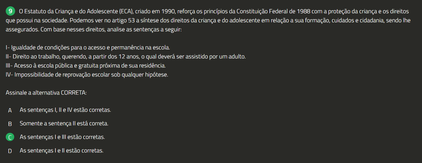 9 0 Estatuto da Criança e do Adolescente (ECA), criado em 1990, reforça princípios da Constituição Federal de 1988 com a proteção da criança e direitos que possui na sociedade. Podemos ver no artigo 53 a síntese dos direitos da criança e do adolescente em relação a sua formação, cuidados e cidadania, sendo lhe assegurados. Com base nesses direitos, analise as sentenças a seguir: Igualdade de condições para 0 acesso e permanência na escola. II- Direito ao trabalho, querendo, a partir dos 12 anos, 0 qual deverá ser assistido por um adulto. III- Acesso à escola pública e gratuita próxima de sua residência. IV- Impossibilidade de reprovação escolar sob qualquer hipótese. Assinale a alternativa CORRETA: A As sentenças I, e IV estão corretas. B Somente a sentença está correta. As sentenças e III estão corretas. D As sentenças e estão corretas.