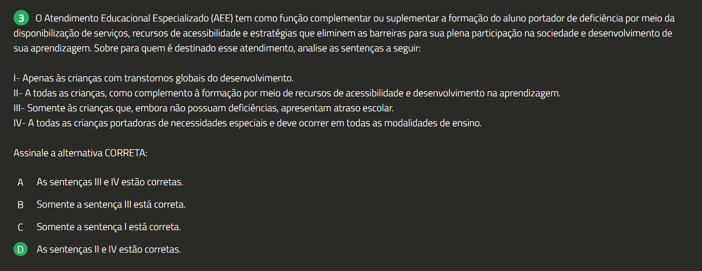 3 0 Atendimento Educacional Especializado (AEE) tem como função complementar ou suplementar a formação do aluno portador de deficiência por meio da disponibilização de serviços, recursos de acessibilidade e estratégias que eliminem as barreiras para sua plena participação na sociedade e desenvolvimento de sua aprendizagem. Sobre para quem é destinado esse atendimento, analise as sentenças a seguir: Apenas às crianças com transtornos globais do desenvolvimento. II- A todas as crianças, como complemento à formação por meio de recursos de acessibilidade e desenvolvimento na aprendizagem. III- Somente às crianças que, embora não possuam deficiências, apresentam atraso escolar. IV- A todas as crianças portadoras de necessidades especiais e deve ocorrer em todas as modalidades de ensino. Assinale a alternativa CORRETA: A As sentenças III e IV estão corretas. B Somente a sentença III está correta. Somente a sentença está correta. D As sentenças e IV estão corretas.