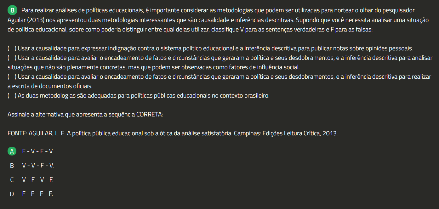 8 Para realizar análises de políticas educacionais, é importante considerar as metodologias que podem ser utilizadas para nortear 0 olhar do pesquisador. Aguilar (2013) nos apresentou duas metodologias interessantes que são causalidade e inferências descritivas. Supondo que você necessita analisar uma situação de política educacional, sobre como poderia distinguir entre qual delas utilizar, classifique V para as sentenças verdadeiras e F para as falsas: Usar a causalidade para expressar indignação contra 0 sistema político educacional e a inferência descritiva para publicar notas sobre opiniões pessoais. ( ) Usar a causalidade para avaliar 0 encadeamento de fatos e circunstâncias que geraram a política e seus desdobramentos, e a inferência descritiva para analisar situações que não são plenamente concretas, mas que podem ser observadas como fatores de influência social. Usar a causalidade para avaliar 0 encadeamento de fatos e circunstâncias que geraram a política e seus desdobramentos, e a inferência descritiva para realizar a escrita de documentos oficiais. ( ) As duas metodologias são adequadas para políticas públicas educacionais no contexto brasileiro. Assinale a alternativa que apresenta a sequência CORRETA: FONTE: AGUILAR, L.E. A política pública educacional sob a ótica da análise satisfatória. Campinas: Edições Leitura Crítica, 2013. A F-V-F-V. B V-V-F-V. V-F-V-F. D F-F-F-F.