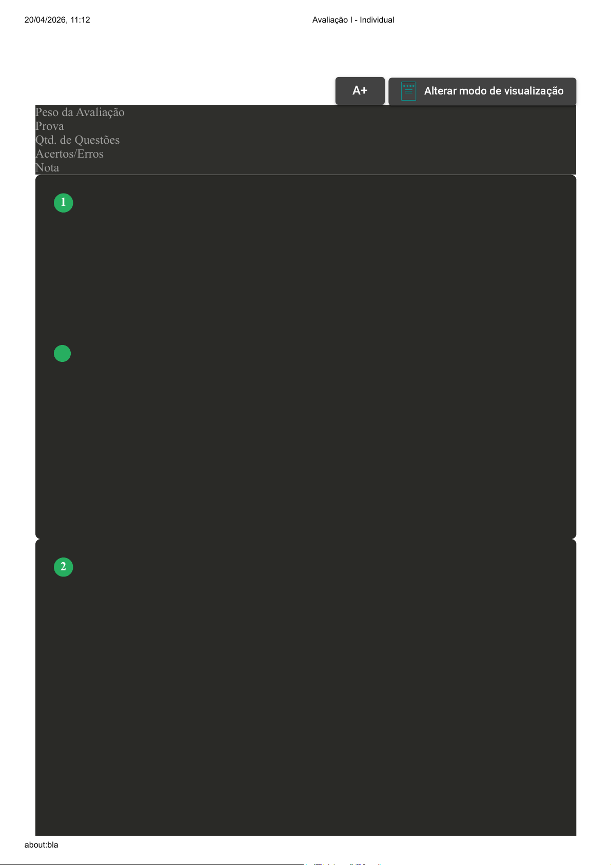 Prova Impressa GABARITO | Avaliação I - Individual (Cod.:1597015) Peso da Avaliação 1,50 Prova 118464206 Qtd. de Questões 10 Acertos/Erros 10/0 Nota 10,00 Analisando a literatura, identificamos que o termo “por cento” significa “em cem”. Na matemática, porcentagens são usadas como frações, decimais e como forma de descrever partes de um todo. Quando se está usando porcentagens, considera-se que o todo é composto por cem. O símbolo % é usado para mostrar que um número é uma porcentagem. Calcule o valor que corresponde a 28% do valor R$ 1.700,00 e assinale a alternativa CORRETA: A R$ 515,00. B R$ 476,00. C R$ 780,00. D R$ 262,00. E R$ 377,00. A porcentagem serve para representar de uma maneira prática o "quanto" de um "todo" se está referenciando. Analise a situação a seguir: em uma turma de Ciências da Computação formada por 40 rapazes e 40 moças, tem-se a seguinte estatística: 20% dos rapazes são fumantes e 30% das moças são fumantes. Com base nessas informações, analise as sentenças a seguir: I- 12 rapazes são fumantes. II- 8 mulheres são fumantes. III- 8 rapazes são fumantes. IV- 28 mulheres não são fumantes. Assinale a alternativa CORRETA: A As sentenças I e IV estão corretas. VOLTAR A+Aumentar, FonteAlterar modo de visualização 1 2 20/04/2026, 11:12 Avaliação I - Individual about:blank 1/6 B As sentenças I e III estão corretas. C As sentenças II e III estão corretas. D As sentenças I e II estão corretas. E As sentenças III e IV estão corretas. A porcentagem é empregada o tempo todo nas relações comerciais e em várias outras situações do dia a dia. É bastante comum ver, em vitrines de lojas ou em contas de energia, por exemplo, o uso do símbolo de porcentagem para passar alguma informação. Nesse sentido, considere que uma ação de investimentos caiu de R$ 32,47 para R$ 12,05. Qual é a diferença percentual? A -88,67%. B -13,10%. C -62,89%. D -10,11%. E -77,77%. O termo da porcentagem é empregado o tempo todo nas relações comerciais e em várias outras situações do dia a dia. É bastante comum ver em vitrines de lojas ou em contas de energia, por exemplo, o uso do símbolo de porcentagem para passar alguma informação. Nesse sentido, considere que uma ação de investimentos caiu de R$ 50,00 para R$ 25,00. Qual é a diferença percentual? A -25%. B -50%. C -100%. 3 4 20/04/2026, 11:12 Avaliação I - Individual about:blank 2/6 D -88%. E -40%. O termo “por cento” significa “em cem”. Na matemática, porcentagens são usadas como frações, decimais e como forma de descrever partes de um todo. Quando se está usando porcentagens, considera-se que o todo é composto por cem. O símbolo % é usado para mostrar que um número é uma porcentagem. Calcule o valor que corresponde a 20% do valor R$ 6.000,00 e assinale a alternativa CORRETA: A R$ 800,00. B R$ 1.500,00. C R$ 1.200,00. D R$ 1.000,00. E R$ 900,00. A porcentagem está em quase todos os lugares: em lojas, na internet, em anúncios e na mídia. Compreender o que as porcentagens significam é uma habilidade essencial que potencialmente economizará tempo e dinheiro. A calculadora HP12C disponibiliza essas três teclas para solucionar problemas com percentagens: "%" e %T, entre outras. Calcule o valor que corresponde a 66% do valor R$700,00 e assinale a alternativa CORRETA: A R$ 462,00. B R$ 392,00. C R$ 584,00. D R$ 500,00. 5 6 20/04/2026, 11:12 Avaliação I - Individual about:blank 3/6 E R$ 528,00. A tecla porcentagem do total %T proporciona o cálculo para identificar qual é a porcentagem da proporção de um número para outro. Chamamos de porcentagem qualquer razão que tenha como denominador o número 100 e que utilizamos para comparar as partes de um todo. Por exemplo, ao falar 30%, significa que temos 30 partes de algo que foi dividido em 100 partes. Considere que um produto custa R$ 50,00 na loja “A” e R$ 70,00 na loja “B”. Qual a diferença percentual entre os valores? A 20%. B 40%. C 30%. D 50%. E 60%. Podemos afirmar que uma porcentagem de 1% é quando dividimos o inteiro em 100 partes iguais e levamos em consideração apenas umas dessas partes. É possível representar essa análise da seguinte forma: 1/100, que é chamado de razão centesimal ou de razão porcentual, e lemos “um por cento”. Calcule o valor que corresponde a 5% do valor R$ 900,00 e assinale a alternativa CORRETA: A R$ 65,00. B R$ 75,00. C R$ 55,00. D R$ 45,00. E R$ 95,00. 7 8 20/04/2026, 11:12 Avaliação I - Individual about:blank 4/6 Analisando a literatura, identificamos que o termo “por cento” significa “em cem”. Na matemática, porcentagens são usadas como frações, decimais e como forma de descrever partes de um todo. Quando se está usando porcentagens, considera-se que o todo é composto por cem. O símbolo % é usado para mostrar que um número é uma porcentagem. Calcule o valor que corresponde a 40% do valor R$ 1.500,00 e assinale a alternativa CORRETA: A R$ 666,00. B R$ 60,00. C R$ 700,00. D R$ 600,00. E R$ 500,00. As empresas podem usar a matemática financeira para tomar decisões inteligentes sobre empréstimos e contratos para reduzir o risco. O uso da matemática financeira pode ajudar a identificar e gerenciar os riscos financeiros. Os analistas financeiros costumam usar matemática financeira para analisar dados de mercado, encontrar padrões em dados e prever riscos. Os riscos financeiros podem ser classificados de quatro formas. Analise o conceito a seguir: “Refere-se aos riscos associados a empréstimos e contratos, incluindo a incapacidade de pagar empréstimos ou cumprir contratos”. Sobre a classificação de risco financeira, assinale a alternativa CORRETA: A Risco de mercado. B Risco de câmbio. C Risco de liquidez. D Risco de crédito. E Risco operacional. 9 10 20/04/2026, 11:12 Avaliação I - Individual about:blank 5/6 Imprimir 20/04/2026, 11:12 Avaliação I - Individual about:blank 6/6