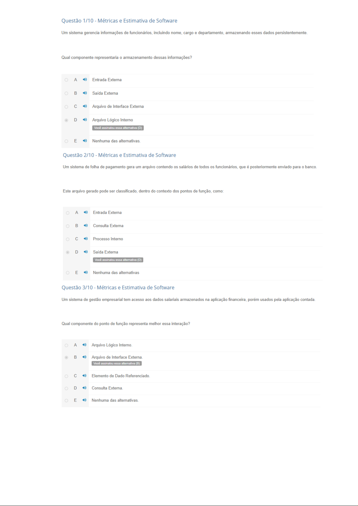 Questão 1/10 Métricas e Estimativa de Software Um sistema gerencia informações de funcionários, incluindo nome, cargo e departamento, armazenando esses dados persistentemente. Qual componente representaria 0 armazenamento dessas informações? A Entrada Externa Saída Externa Arquivo de Interface Externa D Arquivo Lógico Interno Você assinalou essa alternativa (D) E Nenhuma das alternativas. Questão 2/10 Métricas e Estimativa de Software Um sistema de folha de pagamento gera um arquivo contendo os salários de todos os funcionários, que é posteriormente enviado para 0 banco. Este arquivo gerado pode ser classificado, dentro do contexto dos pontos de função, como: A Entrada Externa Consulta Externa Processo Interno D Saída Externa Você assinalou essa alternativa (D) E Nenhuma das alternativas Questão 3/10 Métricas e Estimativa de Software Um sistema de gestão empresarial tem acesso aos dados salariais armazenados na aplicação financeira, porém usados pela aplicação contada. Qual componente do ponto de função representa melhor essa interação? A Arquivo Lógico Interno. Arquivo de Interface Externa. Você assinalou essa alternativa (B) C Elemento de Dado Referenciado. D Consulta Externa. E Nenhuma das alternativas.Questão 4/10 Métricas e Estimativa de Software Ler em voz alta Um novo sistema de gerenciamento de estoque está sendo desenvolvido. A equipe de desenvolvimento está na fase inicial de projeto, com requisitos ainda em constante evolução e sujeitos a mudanças. Qual das seguintes abordagens melhor se adequa para estimar 0 tamanho funcional do sistema usando pontos de função neste estágio? A Realizar a contagem detalhada de pontos de função, incluindo todos detalhes de cada transação e arquivo de dados, baseando-se em especificações completas sem se preocupar com a evolução das funcionalidades. Utilizar a contagem de pontos de função baseada em estimativas preliminares e prototipagem, ajustando-as conforme requisitos são refinados. Você assinalou essa alternativa (B) Aguardar a finalização completa dos requisitos antes de iniciar qualquer contagem de pontos de função, para garantir precisão máxima. D Utilizar uma ferramenta automatizada de contagem de pontos de função, sem considerar a natureza evolutiva dos requisitos. E Nenhuma das alternativas. Questão 6/10 Métricas e Estimativa de Software Ler em voz alta Você está desenvolvendo um sistema de Esse sistema recebe dados de um pedido de venda (código do produto, quantidade, preço unitário, etc.) para gerar uma fatura. usuário precisará fazer a edição de um pedido realizado para incluir um produto novo. No modelo de Pontos de Função, a edição de dados para 0 pedido de venda pode ser considerado como: A Saída Externa Consulta Externa Entrada Externa Você assinalou essa alternativa (C) D Arquivo de Referência E Nenhuma das alternativas Questão 7/10 - Métricas e Estimativa de Software Ler em voz alta Você foi destinado a utilizar a estimativa Pontos de Função(PF) para medir um software desenvolvido com a metodologia Scrum. Para avaliar 0 software você precisará seguir alguns passos. Marque a alternativa correta que cita estes passos de adaptação ao utilizar a estimativa PF. A Compreensão do Contexto do Projeto Identificação das Funcionalidades - Determinação dos Pontos de Função - Estimativa dos Pontos de Função por Iteração/Sprint Sem monitoramento e Controle. Não precisa ter compreender 0 projeto Identificação das Funcionalidades Determinação dos Pontos de Função - Estimativa dos Pontos de Função por Iteração/Sprint Monitoramento e Controle Revisão e Aprendizado. C Compreensão do Contexto do Projeto Identificação das Funcionalidades Determinação dos Pontos de Função - Estimativa dos Pontos de Função sem pensar nas Iteração/Sprint - - Monitoramento e Controle - Revisão e Aprendizado. D Não precisa ter compreender projeto Identificação das Funcionalidades Determinação dos Pontos de Função - Estimativa dos Pontos de Função sem pensar nas Iteração/Sprint - - Monitoramento e Controle - Revisão e Aprendizado. E Compreensão do Contexto do Projeto Identificação das Funcionalidades - Determinação dos Pontos de Função - Estimativa dos Pontos de Função por Iteração/Sprint Monitoramento e Controle Revisão e Aprendizado. Você assinalou essa alternativa (E) Questão 8/10 Métricas e Estimativa de Software Ler em voz alta Qual modelo COCOMO seria mais apropriado para estimar 0 esforço de desenvolvimento de um protótipo de software que utiliza componentes existentes e requer a contagem de pontos de função para avaliação? A Modelo de Composição de Aplicação Você assinalou essa alternativa (A) Modelo de Projeto Preliminar Modelo de Reuso Modelo de Pós-Arquitetura E Nenhum dos modelos COCOMO é adequadoQuestão 9/10 Métricas e Estimativa de Software Um projeto de software está na fase inicial, com requisitos levantados, mas 0 projeto ainda não foi iniciado. Qual das seguintes afirmações é a mais precisa sobre 0 modelo COCOMO a ser utilizado e suas características nesta fase? A Modelo de Pós-Arquitetura é 0 mais adequado, pois oferece a estimativa mais precisa. 0 Modelo de Reuso é ideal, pois se concentra na integração de componentes reutilizáveis. C Modelo de Projeto Preliminar é a melhor escolha, oferecendo uma estimativa aproximada de baixo custo baseada em pontos de função. Você assinalou essa alternativa (C) D Modelo de Composição de Aplicação é 0 mais apropriado, focando no número de telas e relatórios. E Nenhum modelo COCOMO é adequado nessa fase inicial do projeto. Questão 10/10 Métricas e Estimativa de Software Ler em voz alta No caso de um produto novo em desenvolvimento, a contagem inicial de pontos de função pode iniciar com estimativas preliminares e prototipagem para capturar e ajustar requisitos conforme eles se solidificam. Neste cenário, foco inicial esté