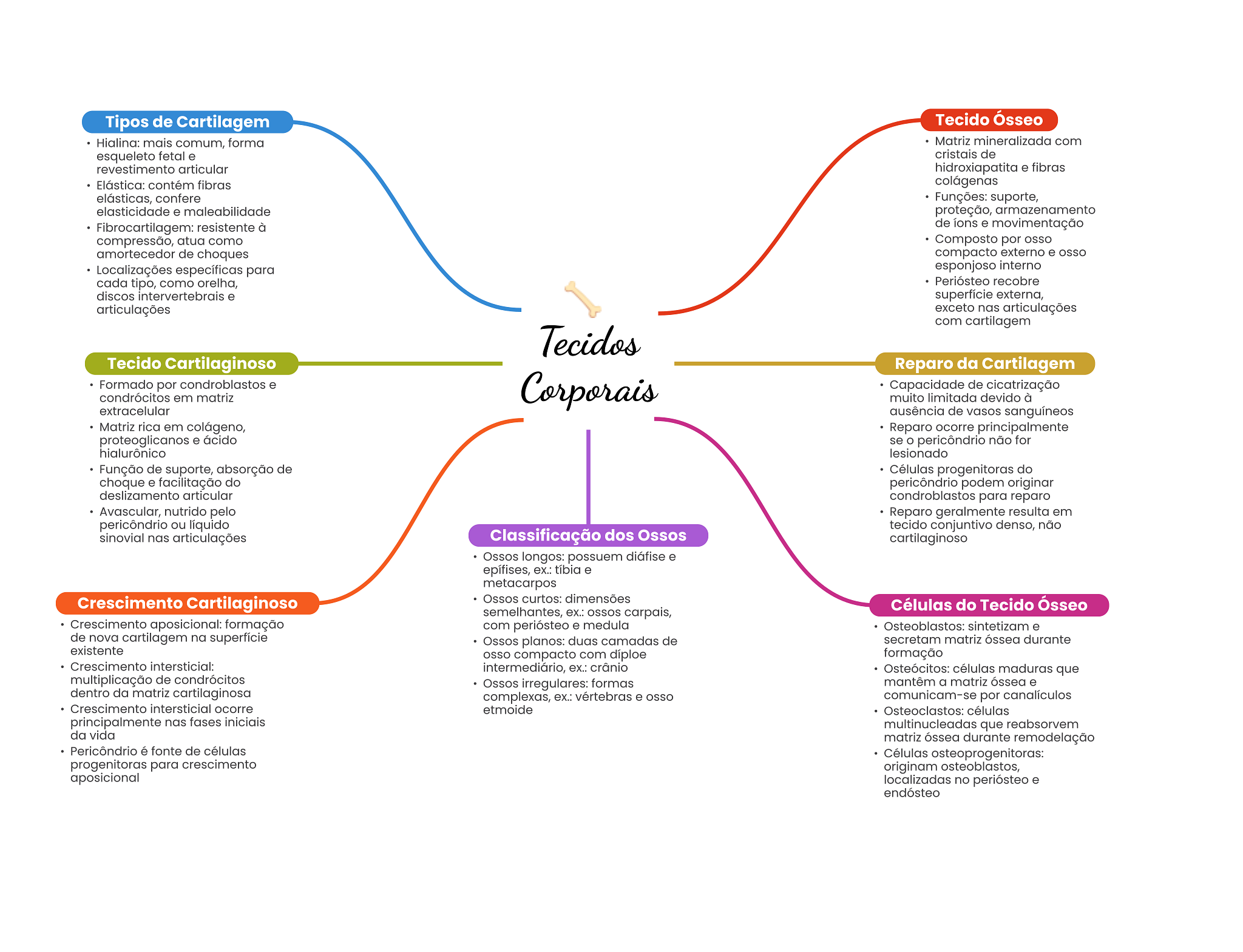 Tipos de Cartilagem Tecido Ósseo Hialina: mais comum, forma Matriz mineralizada com esqueleto fetal e cristais de revestimento articular hidroxiapatita e fibras Elástica: contém fibras colágenas elásticas, confere Funções: suporte, elasticidade e maleabilidade proteção, armazenamento Fibrocartilagem: resistente à de e movimentação compressão, atua como Composto por amortecedor de choques compacto externo e osso Localizações específicas para esponjoso interno cada tipo, como orelha, Periósteo recobre discos intervertebrais e superfície externa, articulações exceto nas articulações com cartilagem Tecidos Tecido Cartilaginoso Reparo da Cartilagem Formado por condroblastos e Corporais Capacidade de cicatrização condrócitos em matriz muito limitada devido à extracelular ausência de vasos sanguíneos Matriz rica em colágeno, Reparo ocorre principalmente proteoglicanos e ácido se pericôndrio não for hialurônico lesionado Função de suporte, absorção de Células progenitoras do choque e facilitação do pericôndrio podem originar deslizamento articular condroblastos para reparo Avascular, nutrido pelo Reparo geralmente resulta em pericôndrio ou líquido tecido conjuntivo denso, não sinovial nas articulações Classificação dos Ossos cartilaginoso Ossos longos: possuem diáfise e epífises, ex.: tíbia e metacarpos Crescimento Cartilaginoso Ossos curtos: dimensões Células do Tecido Ósseo semelhantes, ex.: OSSOS carpais, Crescimento aposicional: formação com periósteo e medula Osteoblastos: sintetizam e de nova cartilagem na superfície Ossos planos: duas camadas de secretam matriz óssea durante existente compacto com díploe formação Crescimento intersticial: intermediário, ex.: crânio Osteócitos: células maduras que multiplicação de condrócitos Ossos irregulares: formas mantêm a matriz óssea e dentro da matriz cartilaginosa complexas, ex.: vértebras e osso comunicam-se por canalículos Crescimento intersticial ocorre etmoide Osteoclastos: células principalmente nas fases iniciais multinucleadas que reabsorvem da vida matriz óssea durante remodelação Pericôndrio é fonte de células Células osteoprogenitoras: progenitoras para crescimento originam osteoblastos, aposicional localizadas no periósteo e endósteo