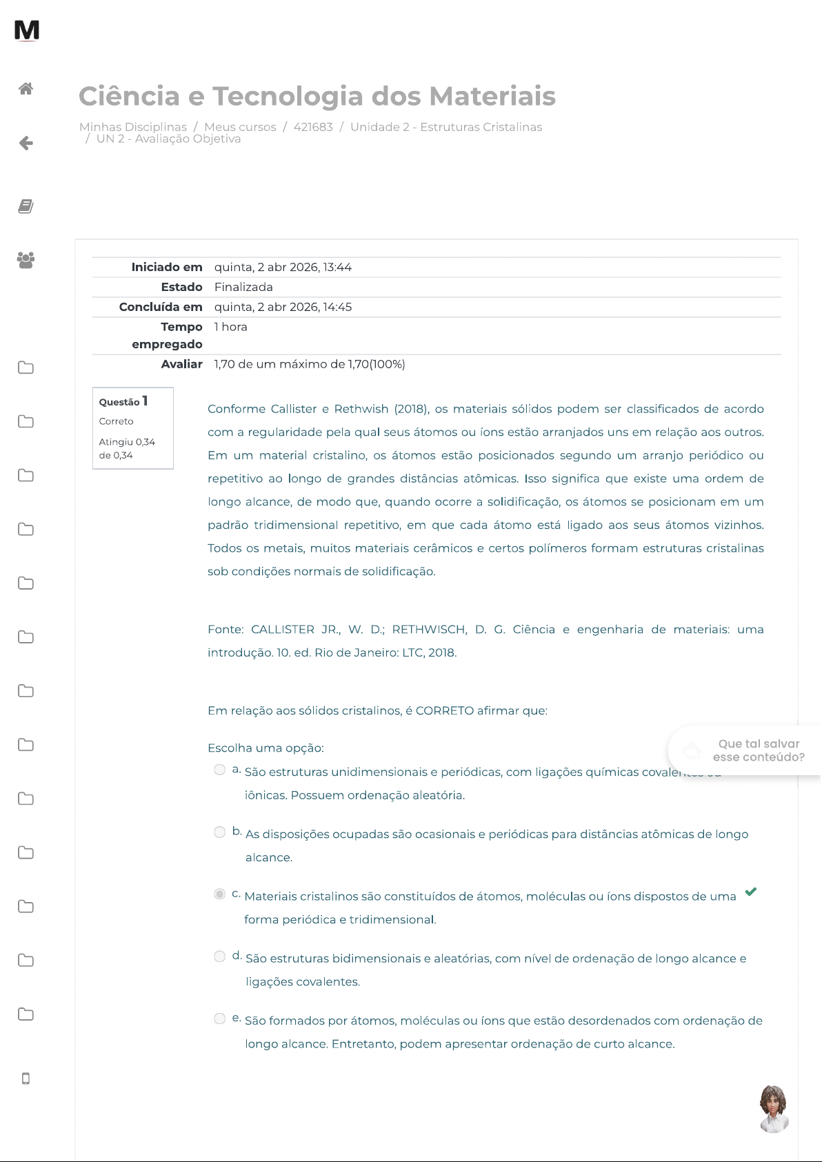 M Ciência e Tecnologia dos Materiais Minhas Disciplinas / Meus cursos / 421683 / Unidade 2 - Estruturas Cristalinas / UN 2 Avaliação Objetiva Iniciado em quinta, 2 abr 2026, 13:44 Estado Finalizada Concluída em quinta, 2 abr 2026, 14:45 Tempo 1 hora empregado Avaliar 1,70 de um máximo de 1,70(100%) Questão 1 Conforme Callister e Rethwish (2018), materiais sólidos podem ser classificados de acordo Correto com a regularidade pela qual seus átomos ou íons estão arranjados uns em relação aos outros. Atingiu 0,34 de 0,34 Em um material cristalino, os átomos estão posicionados segundo um arranjo periódico ou repetitivo ao longo de grandes distâncias atômicas. Isso significa que existe uma ordem de longo alcance, de modo que, quando ocorre a solidificação, os átomos se posicionam em um padrão tridimensional repetitivo, em que cada átomo está ligado aos seus átomos vizinhos. Todos os metais, muitos materiais cerâmicos e certos polímeros formam estruturas cristalinas sob condições normais de solidificação. Fonte: CALLISTER JR., W. D.; RETHWISCH, D. G. Ciência e engenharia de materiais: uma introdução. 10. ed. Rio de Janeiro: LTC, 2018. Em relação aos sólidos cristalinos, é CORRETO afirmar que: Escolha uma opção: Que tal salvar esse conteúdo? a. São estruturas unidimensionais e periódicas, com ligações químicas covale iônicas. Possuem ordenação aleatória. b. As disposições ocupadas são ocasionais e periódicas para distâncias atômicas de longo alcance. C. Materiais cristalinos são constituídos de átomos, moléculas ou íons dispostos de uma forma periódica e tridimensional. d. São estruturas bidimensionais e aleatórias, com nível de ordenação de longo alcance e ligações covalentes. e. São formados por átomos, moléculas ou íons que estão desordenados com ordenação de longo alcance. Entretanto, podem apresentar ordenação de curto alcance.Questão 2 M Em relação ao processo de nucleação e de crescimento de grãos, analise as afirmativas a seguir. Correto Atingiu 0,34 núcleo é primeiro estágio de formação de cristais em uma célula unitária e serve como de 0,34 base para subsequente crescimento dos cristais. crescimento de grão é segundo estágio da formação dos cristais, qual é dependente da temperatura e pode ser descrito utilizando-se a equação de Arrhenius. III A nucleação é processo de formação de pequenas aglomerações aleatórias de átomos que servem como base para crescimento dos cristais. IV A nucleação homogênea e a aglomeração de átomos ocorrem quando um material puro resfria suficiente para autossustentar a formação de núcleos estáveis. Está correto que se afirma em: Escolha uma opção: a. e III. b. e IV. C. e IV. d. Apenas II. e. III e IV. Que tal salvar esse conteúdo?Questão 3 M Monocristais artificiais de pureza elevada são empregados pela indústria na fabricação de Correto dispositivos eletrônicos, e as propriedades que são conferidas aos monocristais permitem sua Atingiu 0,34 de 0,34 utilização na produção de circuitos integrados eletrônicos, em circuitos integrados óticos, memórias óticas, lasers de estado sólido e defletores óticos, bem como guias de ondas. Para a produção de monocristais artificiais de elevada pureza, é necessária a escolha e aplicação correta dos métodos de obtenção desse material. Acerca do método utilizado para a formação de monocristais altamente puros, é correto afirmar que: Escolha uma opção: a. controle minucioso da catálise para que o cristal possa ter uma cinética de crescimento adequada é fundamental na aplicação das técnicas de obtenção de monocristais. b. Diversas técnicas de obtenção de sólidos monocristalinos estão relacionadas às condições termodinâmicas impostas durante a síntese. C. Os parâmetros de temperatura, a concentração dos reagentes e a pressão são irrelevantes para que os átomos presentes na fase líquida possam realizar interações e, consequentemente formar retículos cristalinos que se propagam inalterados ao longo do material. d. método de crescimento dá origem a cristais grandes, isto é, devido à dificuldade de aplicação dos processos e dos controles adequados. e. Os cristais que são obtidos pelos métodos de crescimento são pequenos devido à facilidade de aplicação dos processos e dos controles restritos. Que tal salvar esse conteúdo?Questão 4 M tipo de estrutura cristalina influencia diversas propriedades, e, principalmente, a capacidade Correto de se deformar (ductilidade) e de ser maleável (de mudar de forma), por exemplo, que em Atingiu 0,34 de 0,34 muitos casos é uma vantagem, por facilitar processos tecnológicos de conformação mecânica. Assim, metais que se solidificam em estruturas CFC são melhores para aplicação em processos de conformação por deformação plástica, pois são mais dúcteis do que que se solidificam em estruturas CCC e Em relação aos tipos de estruturas cristalinas estudadas, analise as afirmativas a seguir. I. A estrutura cúbica de corpo centrado (CCC) apresenta 1 átomo por célula unitária. II. A estrutura cúbica de face centrada (CFC) apresenta 4 átomos por célula unitária. III. A estrutura cúbica de corpo centrado (CCC) apresenta 4 átomos por célula unitária. Em relação às estruturas cristalinas, é CORRETO que se afirma em: Escolha uma opção: a. e II. b. e III. d. II e III. e. II. Que tal salvar esse conteúdo?Questão 5 M Conforme Callister e Rethwish (2018, 48), "A necessidade de entender a estrutura cristalina (e Correto toda a geometria e a nomenclatura que a acompanha) está fundamentada no conceito de que Atingiu 0,34 de 0,34 a estrutura de um material governa suas propriedades. Materiais são selecionados porque têm as propriedades adequadas para uma dada função e essas propriedades determinam se um material é apropriado ou não. entendimento das estruturas dos materiais abre caminho par