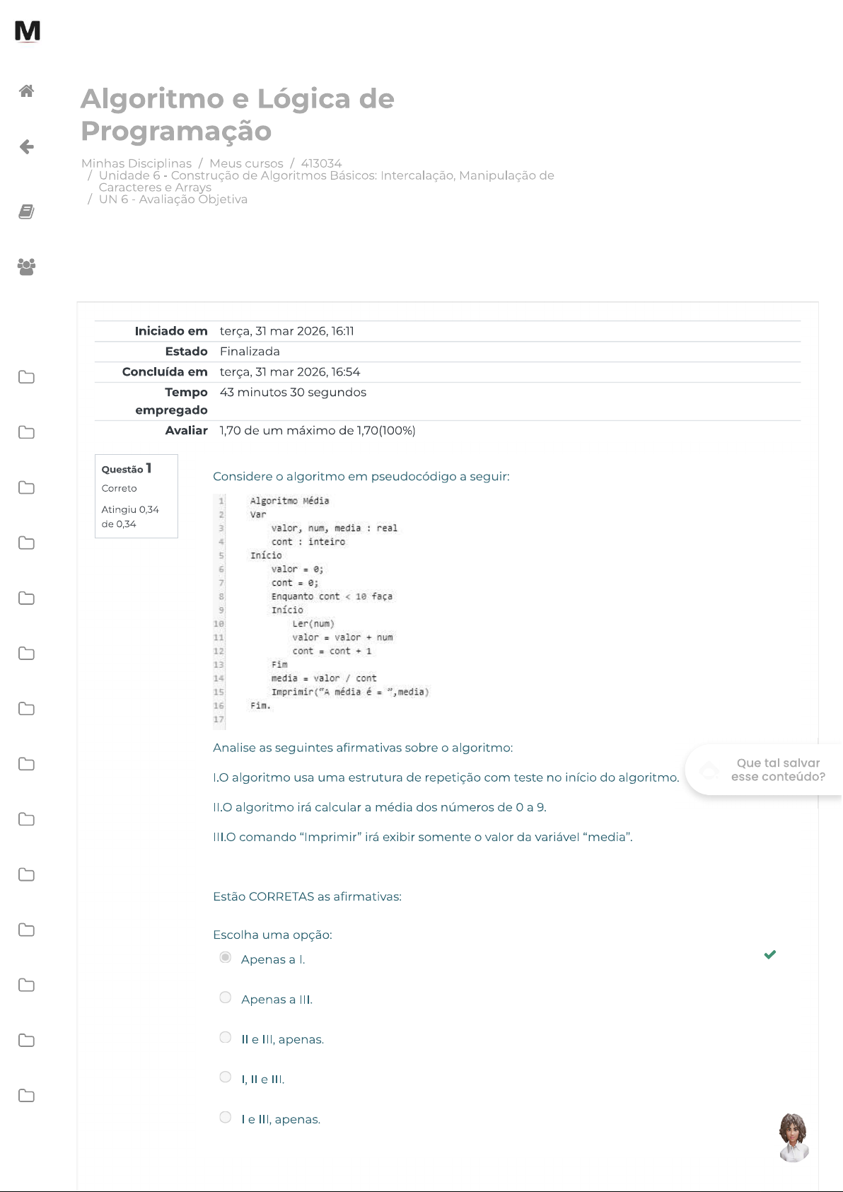 M Algoritmo e Lógica de Programação Minhas Disciplinas / Meus cursos / 413034 / Unidade 6 Construção de Algoritmos Básicos: Intercalação, Manipulação de Caracteres e Arrays / UN 6 Avaliação Objetiva Iniciado em terça, 31 mar 2026, 16:11 Estado Finalizada Concluída em terça, 31 mar 2026, 16:54 Tempo 43 minutos 30 segundos empregado Avaliar 1,70 de um máximo de 1,70(100%) Questão 1 Considere algoritmo em pseudocódigo a seguir: Correto 1 Algoritmo Média Atingiu 0,34 2 Var de 0,34 3 valor, num, media : real 4 cont : inteiro 5 Início 6 valor 0; 7 cont 0; 8 Enquanto contQuestão 2 M De acordo com algoritmo abaixo analise as seguintes afirmativas: Correto Atingiu 0,34 class A de 0,34 { public static void main(String[] args) { int INT = 1; if (INT == 2) { } } } Ao tentar compilar e executar este algoritmo: Escolha uma opção: Apenas compila, porém acusa erro de execução. não compila: não se declara uma variável com nome de uma palavra reservada compila e executa, imprimindo a palavra "Parabéns!!!". compila e executa, porém não imprime a palavra "Parabéns!!!". não compila: não se declara uma variável iniciando com letras maiúsculas. Que tal salvar esse conteúdo?Questão 3 M Para responder à questão, considere a figura abaixo. Em relação a um algoritmo escrito: Correto 1 algoritmo Atingiu 0,34 2 var de 0,34 inteiro 4 vet: vetor[1..15] de inteiro 5 inicio 7 para i de 1 ate 14 faca 9 vet[i] 0) entao 11 se entao 12 13 senao 14 15 fimse 16 fimse 17 fimpara 18 se (vet[5] > vet[10]) entao 19 para i de 5 ate 15 faca 20 21 fimpara 22 senao 23 para i de 1 ate 10 faca 24 25 fimpara 26 fimse 27 fimalgoritmo Ao final da execução do algoritmo, que valor deve estar associado a vet[12]? Escolha uma opção: a. 39 b. 49 C. 66 d. 42 e. 57 Que tal salvar esse conteúdo?Questão 4 void Order() M Correto } Atingiu 0,34 de 0,34 for (int i = 0; i + 1]) var a = V[j]; V[j] = + 1]; V[j + 1] = a; Com relação ao algoritmo acima, que manipula um vetor de inteiros, julgue os itens a seguir: I.Quando as variáveis e J valerem, respectivamente, a linha 13 apresentará a sequência de valores 1,2,4,3,0. II.Quando as variáveis e J valerem, respectivamente, 1 e 1, a linha 13 apresentará a sequência de valores 1,2,3,4,0. III.Quando as variáveis e J valerem, respectivamente, 2 e O, a linha 13 apresentará a sequência de valores 1,2,0,4,3. Assinale a opção correta. Escolha uma opção: Os itens e III estão certos. Todos os itens estão certos Os itens le II estão certos. Os itens le III estão certos. Apenas um item está certo. Que tal salvar esse conteúdo?Questão 5 M Para responder à questão, considere a figura abaixo. Em relação a um algoritmo escrito: Correto 1 algoritmo Atingiu 0,34 2 var de 0,34 3 i, j, inteiro 4 vet: vetor[1..15] de inteiro 5 inicio 7 para i de 1 ate 14 faca 9 vet[i] 0) entao 11 se entao 12 13 senao 14 15 fimse 16 fimse 17 fimpara 18 se (vet[5] > vet[10]) entao 19 para i de 5 ate 15 faca 20 21 fimpara 22 senao 23 para i de 1 ate 10 faca 24 25 fimpara 26 fimse 27 fimalgoritmo Ao final da execução do algoritmo, que valor deve estar associado a vet[15]? Escolha uma opção: a.7 b. 57 C. 44 d. 27 e.o Que tal salvar ERRATA - Unidade 6. Tela 31 Seguir para... esse conteúdo?