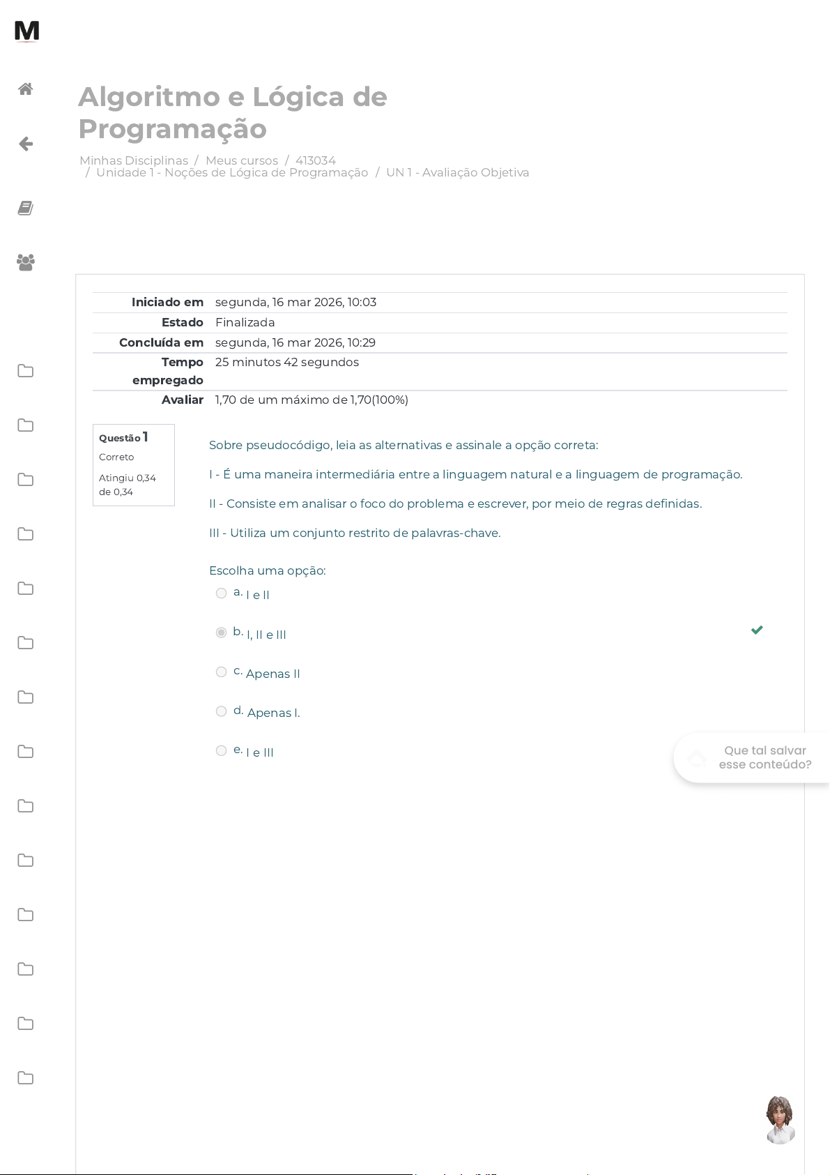 Minhas Disciplinas / Meus cursos / 413034 / Unidade 1 - Noções de Lógica de Programação / UN 1 - Avaliação Objetiva Algoritmo e Lógica de Programação Questão 1 Correto Atingiu 0,34 de 0,34 Iniciado em segunda, 16 mar 2026, 10:03 Estado Finalizada Concluída em segunda, 16 mar 2026, 10:29 Tempo empregado 25 minutos 42 segundos Avaliar 1,70 de um máximo de 1,70(100%) Sobre pseudocódigo, leia as alternativas e assinale a opção correta: I - É uma maneira intermediária entre a linguagem natural e a linguagem de programação. II - Consiste em analisar o foco do problema e escrever, por meio de regras definidas. III - Utiliza um conjunto restrito de palavras-chave. Escolha uma opção: a. I e II b. I, II e III c. Apenas II d. Apenas I. e. I e III Que tal salvar esse conteúdo? https://avap.multivix.edu.br/my/ https://avap.multivix.edu.br/course/view.php?id=38375 https://avap.multivix.edu.br/course/view.php?id=38375§ion=2 https://avap.multivix.edu.br/mod/quiz/view.php?id=2036431 https://avap.multivix.edu.br/my/ https://avap.multivix.edu.br/course/view.php?id=38375 https://avap.multivix.edu.br/user/index.php?id=38375 https://avap.multivix.edu.br/course/view.php?id=38375§ion=1 https://avap.multivix.edu.br/course/view.php?id=38375§ion=2 https://avap.multivix.edu.br/course/view.php?id=38375§ion=3 https://avap.multivix.edu.br/course/view.php?id=38375§ion=4 https://avap.multivix.edu.br/course/view.php?id=38375§ion=5 https://avap.multivix.edu.br/course/view.php?id=38375§ion=6 https://avap.multivix.edu.br/course/view.php?id=38375§ion=7 https://avap.multivix.edu.br/course/view.php?id=38375§ion=8 https://avap.multivix.edu.br/course/view.php?id=38375§ion=9 https://avap.multivix.edu.br/course/view.php?id=38375§ion=10 https://avap.multivix.edu.br/course/view.php?id=38375§ion=11 https://avap.multivix.edu.br/course/view.php?id=38375§ion=12 https://avap.multivix.edu.br/course/view.php?id=38375§ion=13 https://avap.multivix.edu.br/course/view.php?id=38375§ion=14 https://avap.multivix.edu.br/course/view.php?id=38375§ion=15 https://avap.multivix.edu.br/course/view.php?id=38375§ion=16 https://avap.multivix.edu.br/ https://avap.multivix.edu.br/ https://avap.multivix.edu.br/ https://avap.multivix.edu.br/ Questão 2 Correto Atingiu 0,34 de 0,34 Questão 3 Correto Atingiu 0,34 de 0,34 Questão 4 Correto Atingiu 0,34 de 0,34 Um pseudocódigo é uma linguagem de programação genérica e rica em detalhes, que faz intermédio entre a linguagem natural e a linguagem de programação lida por máquina. É uma característica dos pseudocódigos: Escolha uma opção: a. Sua sintaxe precisa ser seguida tão rigorosamente quanto uma linguagem de programação. b. Não precisar ser escrito com regras definidas por ser uma linguagem de programação compreendida por máquina. c. É uma representação gráfica que utiliza formas geométricas padronizadas ligadas por setas de fluxo. d. Facilitar a transcrição do algoritmo para qualquer linguagem de programação. e. Não tem limitação quanto à possibilidade de expressão. São formas utilizadas para representar algoritmos, exceto: Escolha uma opção: a. Portugol. b. Descrição narrativa. c. Fluxograma. d. Caso de teste. e. Pseudocódigo. Sobre pseudocódigo, leia as alternativas e assinale a opção correta: I - O pseudocódigo é uma linguagem pouco utilizada por ser mais formal do que a descrição narrativa e mais fácil de manter do que um fluxograma. II - A maior vantagem provém da facilidade da transcrição do algoritmo para qualquer outra linguagem de programação. III - A desvantagem é sua limitação do seu poder de expressão. Escolha uma opção: a. Apenas II b. I e II c. II e III d. I, II e III e. Apenas I Que tal salvar esse conteúdo? https://avap.multivix.edu.br/my/ https://avap.multivix.edu.br/course/view.php?id=38375 https://avap.multivix.edu.br/user/index.php?id=38375 https://avap.multivix.edu.br/course/view.php?id=38375§ion=1 https://avap.multivix.edu.br/course/view.php?id=38375§ion=2 https://avap.multivix.edu.br/course/view.php?id=38375§ion=3 https://avap.multivix.edu.br/course/view.php?id=38375§ion=4 https://avap.multivix.edu.br/course/view.php?id=38375§ion=5 https://avap.multivix.edu.br/course/view.php?id=38375§ion=6 https://avap.multivix.edu.br/course/view.php?id=38375§ion=7 https://avap.multivix.edu.br/course/view.php?id=38375§ion=8 https://avap.multivix.edu.br/course/view.php?id=38375§ion=9 https://avap.multivix.edu.br/course/view.php?id=38375§ion=10 https://avap.multivix.edu.br/course/view.php?id=38375§ion=11 https://avap.multivix.edu.br/course/view.php?id=38375§ion=12 https://avap.multivix.edu.br/course/view.php?id=38375§ion=13 https://avap.multivix.edu.br/course/view.php?id=38375§ion=14 https://avap.multivix.edu.br/course/view.php?id=38375§ion=15 https://avap.multivix.edu.br/course/view.php?id=38375§ion=16 https://avap.multivix.edu.br/ https://avap.multivix.edu.br/ https://avap.multivix.edu.br/ https://avap.multivix.edu.br/ Questão 5 Correto Atingiu 0,34 de 0,34 “Trata-se de uma maneira intermediária entre a linguagem natural e uma linguagem de programação. Consiste em analisar o enunciado do problema e escrever, por meio de regras definidas, os passos a serem seguidos para a resolução do problema”. Este parágrafo descreve qual tipo de representação de algoritmo? Escolha uma opção: a. Pseudocódigo ou Portugol. b. Todas as alternativas são falsas. c. Todas as alternativas são verdadeiras. d. Fluxograma. e. Descrição narrativa. ◄ ERRATA - Unidade 1. Tela 06 Seguir para... Conteúdo Online ► Que tal salvar esse conteúdo? https://avap.multivix.edu.br/mod/resource/view.php?id=2036430&forceview=1 https://avap.multivix.edu.br/mod/scorm/view.php?id=2036432&forceview=1 https://avap.multivix.edu.br/my/ https://avap.multivix.edu.br/course/view.php?id=38375 https://avap.multivix.edu.br/user/index.php?id=38375 https://avap.multivix.edu.br/course/view.php?id=38375§ion=1 https://ava