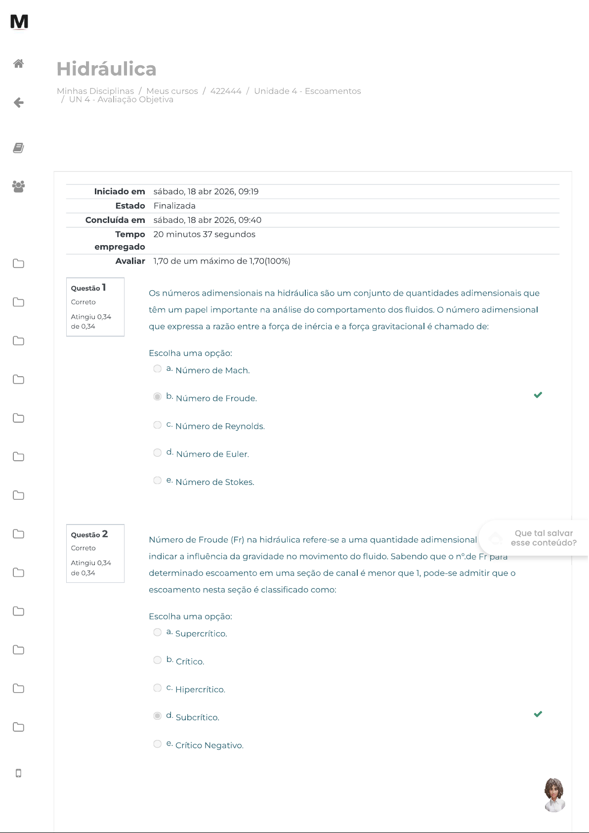 M Hidráulica Minhas Disciplinas / Meus cursos / 422444 / Unidade 4 Escoamentos / UN 4 Avaliação Objetiva Iniciado em sábado, 18 abr 2026, 09:19 Estado Finalizada Concluída em sábado, 18 abr 2026, 09:40 Tempo 20 minutos 37 segundos empregado Avaliar 1,70 de um máximo de 1,70(100%) Questão 1 Os números adimensionais na hidráulica são um conjunto de quantidades adimensionais que Correto têm um papel importante na análise do comportamento dos fluidos. número adimensional Atingiu 0,34 de 0,34 que expressa a razão entre a força de inércia e a força gravitacional é chamado de: Escolha uma opção: a. Número de Mach. b. Número de Froude. C. Número de Reynolds. d. Número de Euler. e. Número de Stokes. Questão 2 Que tal salvar Número de Froude (Fr) na hidráulica refere-se a uma quantidade adimensional esse conteúdo? Correto indicar a influência da gravidade no movimento do fluido. Sabendo que n°.de Fr para Atingiu 0,34 de 0,34 determinado escoamento em uma seção de canal é menor que 1, pode-se admitir que escoamento nesta seção é classificado como: Escolha uma opção: a. Supercrítico. b. Crítico. C. Hipercrítico. d. Subcrítico. e. Crítico Negativo.Questão 3 M fluxo de fluidos pode ser classificado em diferentes padrões com base na variação dos Correto parâmetros de fluxo com tempo e a distância. escoamento de um rio, cuja vazão não se Atingiu 0,34 de 0,34 altera ao longo do tempo, pode ser definido como: Escolha uma opção: a. Escoamento constante e não uniforme. b. Escoamento turbulento. C. Escoamento instável e uniforme. d. Escoamento laminar. e. Escoamento constante e uniforme. Questão 4 A geometria do canal a descrição do tamanho e a forma dos canais em que a água flui Correto recebe frequentemente um tratamento superficial na documentação de modelagem, embora Atingiu 0,34 de 0,34 constitua a base de qualquer análise da hidráulica de canal aberto. parâmetro geométrico determina a eficiência do canal é chamado de: Escolha uma opção: a. Profundidade. b. Largura do canal. C. Raio hidráulico. d. Profundidade hidráulica. e. Fator de seção. Questão 5 Um salto hidráulico é um fenômeno da ciência hidráulica frequentemente obser Correto Que tal salvar escoamentos em canais abertos, como rios e vertedouros. A respeito deste assu esse conteúdo? Atingiu 0,34 de 0,34 afirmar que principal parâmetro que interfere no salto hidráulico é a: Escolha uma opção: a. Velocidade inicial de escoamento. b. Viscosidade do fluído. C. Variação volumétrica. d. Temperatura de escoamento. e. Pressão da tubulação. Conteúdo Online Seguir para... Conteúdo OnlineQue tal salvar esse conteúdo?
