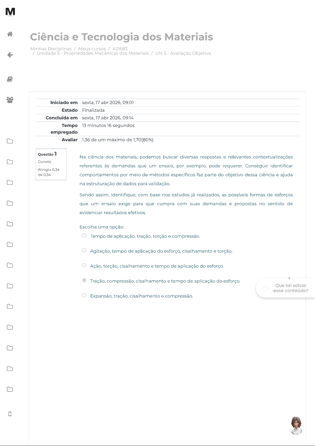M Ciência e Tecnologia dos Materiais Minhas Disciplinas / Meus cursos / 421683 / Unidade 5 Propriedades Mecânicas dos Materiais / UN 5 Avaliação Objetiva Iniciado em sexta, 17 abr 2026, 09:01 Estado Finalizada Concluída em sexta, 17 abr 2026, 09:14 Tempo 13 minutos 16 segundos empregado Avaliar 1,36 de um máximo de 1,70(80%) Questão 1 Na ciência dos materiais, podemos buscar diversas respostas e relevantes contextualizações Correto referentes às demandas que um ensaio, por exemplo, pode requerer. Conseguir identificar Atingiu 0,34 de 0,34 comportamentos por meio de métodos específicos faz parte do objetivo dessa ciência e ajuda na estruturação de dados para validação. Sendo assim, identifique, com base nos estudos já realizados, as possíveis formas de esforços que um ensaio exige para que cumpra com suas demandas e propostas no sentido de evidenciar resultados efetivos. Escolha uma opção: Tempo de aplicação, tração, torção e compressão. Agitação, tempo de aplicação do esforço, cisalhamento e torção. Ação, torção, cisalhamento e tempo de aplicação do esforço. Tração, compressão, cisalhamento e tempo de aplicação do esforço. Que tal salvar esse conteúdo? Expansão, tração, cisalhamento e compressão.Questão 2 M Como base de estudo e consideração técnica, a Lei de Hooke valida a capacidade de resistência Correto dos materiais abaixo do limite elástico, em que a tensão média é proporcional à deformação Atingiu 0,34 de 0,34 média. Nessa contextualização, módulo de Young (também chamado módulo de rigidez) determina a capacidade de resistência do material analisado aos esforços aplicados. Nesse sentido, assinale a opção correta acerca da relação entre a Lei de Hooke e módulo de Young. Escolha uma opção: Não há relação sobre quanto maior for módulo de Young, maior será a resistência do material aos esforços aplicados. Quanto menor for módulo de Young, maior será a resistência do material aos esforços aplicados. Quanto maior for módulo de Young, menor será a resistência do material aos esforços aplicados. Quanto maior for módulo de Young, maior será a resistência do material aos esforços aplicados. Quanto maior for módulo de Young, maior será a resistência dos materiais não metálicos, especificamente, aos esforços aplicados. Questão 3 Quando é aplicado ensaio de tração, ocorre uma deformação no corpo de prova e, com isso, Correto mede-se a variação no comprimento Essa medição é feita com base na carga trativa (P). Atingiu 0,34 de 0,34 Além disso, no Sistema Internacional de Unidades (SI), utiliza-se como unidade de medida newton (N) para a carga (P) e metro (m) para a variação de comprimento Depois, os resultados de (P) e são transformados em gráficos de tensão (σ) e deformação (ε). Sabendo disso, assinale a opção que aponta os conceitos de tensão e de deformação. Escolha uma opção: Tensão no esforço de fixação do corpo de prova; deformação longitudinal. Que tal salvar esse conteúdo? Esforço de tração aplicado no corpo de prova; variação longitudinal do corpo de prova. Esforço sofrido pela máquina; alteração geométrica do corpo de prova. Tração tangencial no ensaio; corpo de prova com deformação por tração. Deformação por fadiga; alteração pela variação longitudinal do corpo de prova.Questão 4 M Quando da realização de um ensaio, pode haver variações, como em qualquer outra atividade Incorreto que envolva questões operacionais não automatizadas. Essas variações, dependendo do grau, Atingiu 0,00 de 0,34 podem impactar fortemente nos resultados, portanto, toda atenção e cuidados na operação, calibração e manutenção do equipamento faz a diferença. Para um ensaio, são definidos alguns fatores relevantes que podem levar à dispersão das propriedades medidas nos materiais como resultado das possíveis variações de um ensaio a ser realizado, tanto nas propriedades mecânicas medidas quanto nas tensões definidas para aplicação pelo equipamento. As tensões de projeto, que, por sua vez, seguem a normativa sobre ensaios se aplicam tanto para corpo de prova quanto para equipamento no que tange à determinação de tensões aplicadas, por exemplo. São regras que normalmente devem ser utilizadas para fins de padronização do processo de ensaio. Assinale a opção que apresenta cinco fatores de variabilidade dos resultados. Escolha uma opção: Preparação do corpo de prova, variações no procedimento de ensaio, influências do operador, calibração do dispositivo de ensaio e homogeneidades na estruturação atômica das amostras. Método de ensaio, variações no procedimento de fabricação dos corpos de prova, influências do operador, calibração do dispositivo de ensaio e não homogeneidades na composição de uma amostra para outra. Temperatura, variações no procedimento de fabricação dos corpos de prova, influências do operador, calibração do dispositivo de ensaio e homogeneidades na composição de uma amostra para outra. Método de ensaio ajustado para cada ensaio, procedimento de fabricação dos corpos de prova com ajustes constantes, influências da máquina, calibração do dispositivo de ensaio e não homogeneidades de uma amostra por lote. Método de ensaio, variações no alinhamento técnico do equipamento, influências do operador, calibração do dispositivo de ensaio e não homogeneidades na composição de uma amostra para outra. Que tal salvar esse conteúdo?Questão 5 M A utilização dos ensaios para a verificação da dureza é um meio de análise do material. Pode Correto haver um comparativo entre a resistência que este oferece ao esforço e, com isso, ser possível Atingiu 0,34 de 0,34 identificar as características de composição do material. A maior ou menor resistência, além de mostrar como está composto corpo de prova, também pode identificar a aplicação adequada do item. 