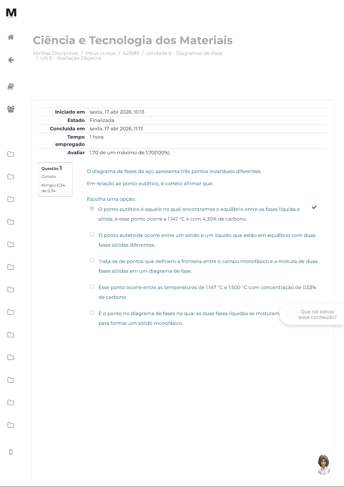 M Ciência e Tecnologia dos Materiais Minhas Disciplinas / Meus cursos / 421683 / Unidade 6 Diagramas de Fase / UN 6 Avaliação Objetiva Iniciado em sexta, 17 abr 2026, 10:13 Estado Finalizada Concluída em sexta, 17 abr 2026, 11:13 Tempo 1 hora empregado Avaliar 1,70 de um máximo de 1,70(100%) Questão 1 diagrama de fases do aço apresenta três pontos invariáveis diferentes. Correto Atingiu 0,34 Em relação ao ponto eutético, é correto afirmar que: de 0,34 Escolha uma opção: ponto eutético é aquele no qual encontramos equilíbrio entre as fases líquida e sólida, e esse ponto ocorre a 1.147 °C e com 4,30% de carbono. ponto eutetoide ocorre entre um sólido e um líquido que estão em equilíbrio com duas fases sólidas diferentes. Trata-se de pontos que definem a fronteira entre campo monofásico e a mistura de duas fases sólidas em um diagrama de fase. Esse ponto ocorre entre as temperaturas de 1.147 °C e 1.500 °C com concentração de 0,53% de carbono. É ponto no diagrama de fases no qual as duas fases líquidas se misturam Que tal salvar esse conteúdo? para formar um sólido monofásico.Questão 2 M Frequentemente, é necessário conhecer quanto de cada material podemos combinar sem Correto produzir uma fase adicional. As soluções se formam quando combinamos materiais diferentes, Atingiu 0,34 de 0,34 e a solubilidade é um parâmetro que determina quanto um material combina com outro sem que haja formação de fase adicional. Em relação ao conceito de solubilidade, é correto afirmar que: Escolha uma opção: Uma solução sólida é mesmo que uma mistura, pois contém mais de um tipo de fase, em que as características de cada uma são conservadas. limite de solubilidade determina a quantidade de concentração máxima de átomos de solvente que pode se dissolver no soluto, independentemente da temperatura. A solubilidade limitada independe da razão soluto/solvente, logo, quando são misturados, esses líquidos produzem somente uma das duas fases. Os componentes de uma solução sólida se diluem inteiramente um no outro e não mantêm suas características particulares. A solubilidade ilimitada apresenta duas fases distintas, nas quais a temperatura não influencia no processo de formação da solução. Questão 3 Em uma liga binária, com = Ni, = Ni e CL = Ni, valor do peso do Correto níquel é igual a: Atingiu 0,34 de 0,34 Escolha uma opção: 1,65. 0,68. 0,76. 0,84. Que tal salvar esse conteúdo? 0,32.Questão 4 M Considerando os tratamentos térmicos que são comumente utilizados na fase de Correto processamento de materiais metálicos, é correto que se afirma em: Atingiu 0,34 de 0,34 Escolha uma opção: A dureza aumenta com a distância a partir da extremidade temperada, uma vez que a taxa de têmpera é constante. A têmpera é um processo térmico dependente do meio de ocorrência, e ar é considerado meio mais eficiente. A temperabilidade é um parâmetro usado para avaliar a composição da elasticidade na formação de uma estrutura predominantemente austenística. A curva de temperabilidade é padronizada para todas as ligas de aço-carbono, levando-se em consideração qualquer meio de ocorrência. melhor arranjo de características mecânicas em aços de alta resistência é obtido se uma microestrutura for majoritariamente martensítica. Questão 5 Considere que ferro fundido com 3,0% é fundido a 1.400 Em seguida, ele é resfriado Correto lentamente, a partir do Fe-C apresentado no texto-base. Atingiu 0,34 de 0,34 Nesse contexto, as fases presentes na temperatura de 1.150 são: Escolha uma opção: Uma fase perlita, a martesita (g ) e uma fase sólida. Uma fase líquida, a ferrita (α) e uma fase sólida. Uma fase sólida, a austenita (g ) e uma fase líquida. Uma fase sólida, a austenita (α) e uma fase líquida. Uma fase líquida, a ferrita (α) e uma fase austenita Que tal salvar esse conteúdo? Conteúdo Online Seguir para... Exercícios de Fixação