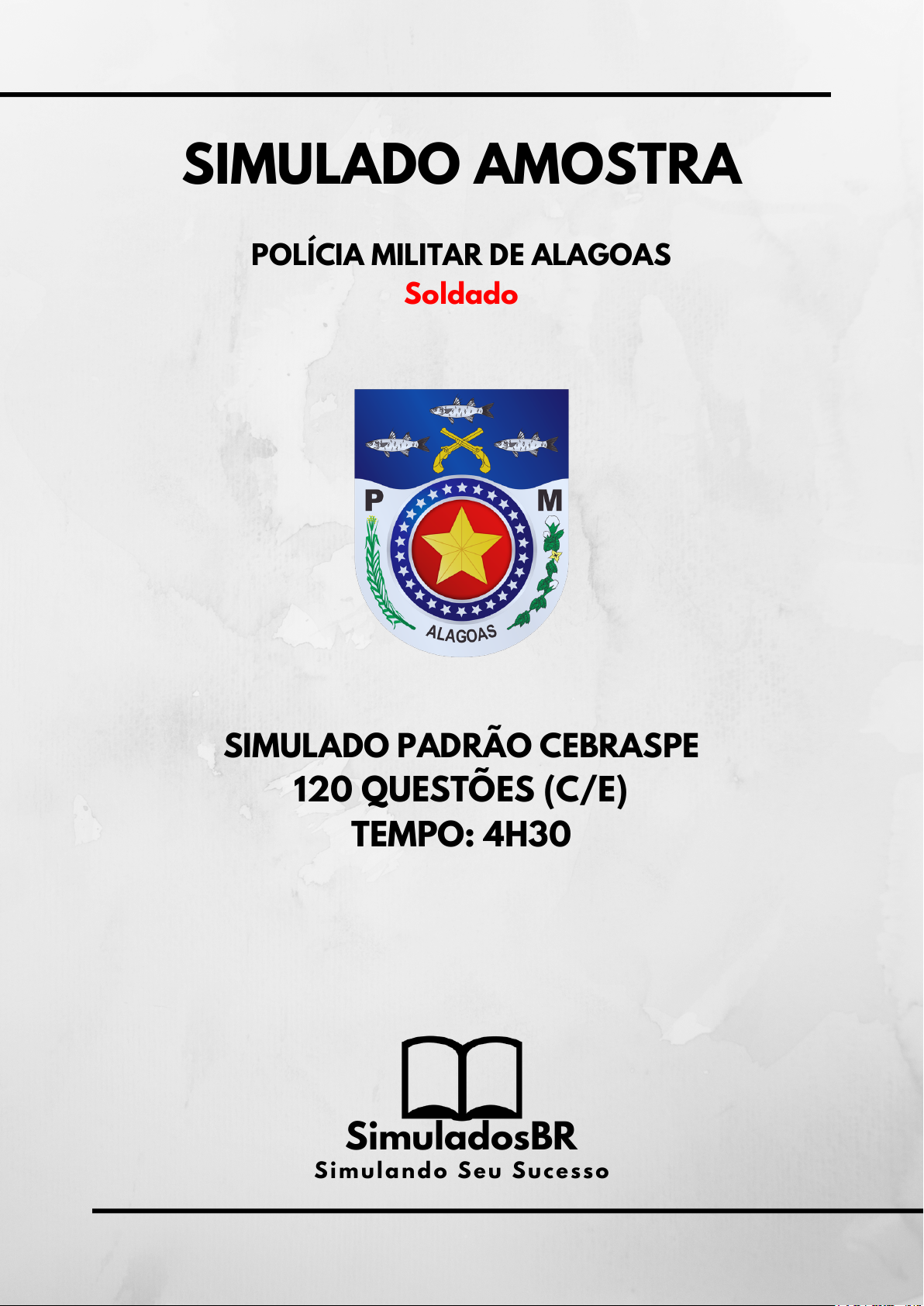 SIMULADO AMOSTRA POLÍCIA MILITAR DE ALAGOAS Soldado SIMULADO PADRÃO CEBRASPE 120 QUESTÕES (C/E) TEMPO: 4H30 SimuladosBR Simulando Seu Sucesso https://www.simuladosbr.net Simulado Amostra – Polícia Militar de Alagoas – Soldado – Aplicação: Abril/2026 SimuladosBR Adquira o Pacote de Simulados em Nosso Site - www.SimuladosBR.net -- CONHECIMENTOS GERAIS -- Língua Portuguesa Texto CG2A1 A alusão ao princípio republicano tornou-se extremamente frequente no Brasil, não só em textos acadêmicos e decisões judiciais, como também nos debates travados na sociedade por pessoas alheias ao mundo do direito. O tema tem vindo à baila, por exemplo, em discussões sobre a corrupção e seu combate; sobre privilégios concedidos a autoridades públicas e poderosos de todo tipo; sobre a persistência no país de cultura patrimonialista e desigualitária, que não separa o público do privado e não trata a todos com o mesmo respeito e consideração. Existe na sociedade a difusa percepção, infelizmente correta, de que, embora nossa forma de governo seja a república e não a monarquia, falta República — com “r” maiúsculo — às nossas relações políticas e sociais. A Constituição Federal de 1988 consagrou o princípio republicano em seu art. 1.º e acolheu diversos elementos e institutos que guardam estreita relação com o ideário republicano: o direito à igualdade; a legitimidade de todo cidadão para propor ação popular visando à garantia da coisa pública; os princípios da moralidade, publicidade e impessoalidade administrativa; as exigências constitucionais de concurso público e licitação; entre tantos outros. O próprio nome atribuído ao país — República Federativa do Brasil — sinaliza a centralidade do princípio republicano entre nós. Essa centralidade foi reforçada pelo povo brasileiro no plebiscito ocorrido em 1993, quando, por expressiva maioria, optamos pela manutenção da forma republicana de governo, em detrimento da monarquia. Porém, entre a proclamação do princípio e a realidade há um abismo que ainda não fomos capazes de transpor nestes trinta anos de vigência da Carta de 1988. O republicanismo projeta um ideal ambicioso para a política. Deseja-se que a política — compreendida em sentido amplo — tenha importância para as pessoas, que não devem limitar suas atividades e atenção a seus interesses e negócios privados. Ademais, espera-se que a política não se resuma à disputa entre forças movidas por interesses egoísticos, mas se volte à busca coletiva do bem comum. Nessa chave, a esfera pública é idealmente concebida não como algo similar ao mercado — em que os agentes visam apenas a defender os próprios interesses —, mas como um fórum, em que existe disputa, mas também troca de razões e argumentos, objetivando-se a identificação e a persecução do interesse público. Não se afirma que essa seja a realidade da política nas sociedades contemporâneas. Trata-se, isso sim, do ideal normativo a ser perseguido para a construção do Estado republicano. Daniel Sarmento (com adaptações) Julgue os itens subsequentes, referente a aspectos linguísticos, discursivos e também das relações de coesão e coerência estabelecidas no texto CG2A1. 01. No segundo parágrafo, todo o trecho subsequente aos dois-pontos constitui uma enumeração na qual se discriminam os “diversos elementos e institutos que guardam estreita relação com o ideário republicano”. 02. O texto classifica-se como predominantemente argumentativo, o que se evidencia pela organização do discurso e pelo posicionamento do autor em relação ao assunto abordado. 03. No primeiro período do texto, a expressão “como também” tem sentido aditivo, pois introduz uma informação adicional acerca dos âmbitos sociais em que se verifica a alusão ao republicanismo. 04. A expressão “Nessa chave” (primeiro período do último parágrafo) poderia ser substituída por Sob esse ângulo, sem prejuízo da coerência textual. 05. Por meio do emprego da expressão “isso sim” (último período do texto), o autor retoma e, ao mesmo tempo, confirma a ideia apresentada anteriormente. 06. O referente das formas pronominais “suas” e “seus”, no segundo período do quarto parágrafo, é “pessoas”. 07. O termo “Ademais” (último período do quarto parágrafo) introduz uma oração que expressa consequência em relação à afirmação feita no período imediatamente anterior. 08. O trecho “que ainda” (último período do terceiro parágrafo) poderia ser substituído por do qual ainda, sem prejuízo da correção gramatical e do sentido do texto. 09. Conclui-se das relações de sentido estabelecidas no quarto parágrafo que o vocábulo “política” (último período) retoma, por coesão referencial, “republicanismo” (primeiro período). https://www.simuladosbr.net/ https://www.simuladosbr.net/ Simulado Amostra – Polícia Militar de Alagoas – Soldado – Aplicação: Abril/2026 SimuladosBR Adquira o Pacote de Simulados em Nosso Site - www.SimuladosBR.net 10. Considerado o republicanismo previsto na Constituição Federal de 1988, conforme apresentado no texto, infere-se que a política deve espelhar o paradigma do mercado. Texto PMSD2 Imaginar é um dom comum a todos os seres humanos — e também uma daquelas características que nos diferenciam dos outros animais, incapazes de atingir esse nível de abstração. Apesar disso, a criatividade parece a muitos de nós algo inacessível, difícil de cultivar, restrita apenas àqueles que já nasceram com aptidões artísticas ou inventivas. Isso não é verdade. Nas últimas décadas, a psicologia e a neurociência começaram a desvendar o processo de surgimento de ideias originais no nosso cérebro — e descobriram estratégias que qualquer um pode adotar para aperfeiçoar a própria capacidade criativa, mesmo que você se considere desprovido desse traquejo. O que se 