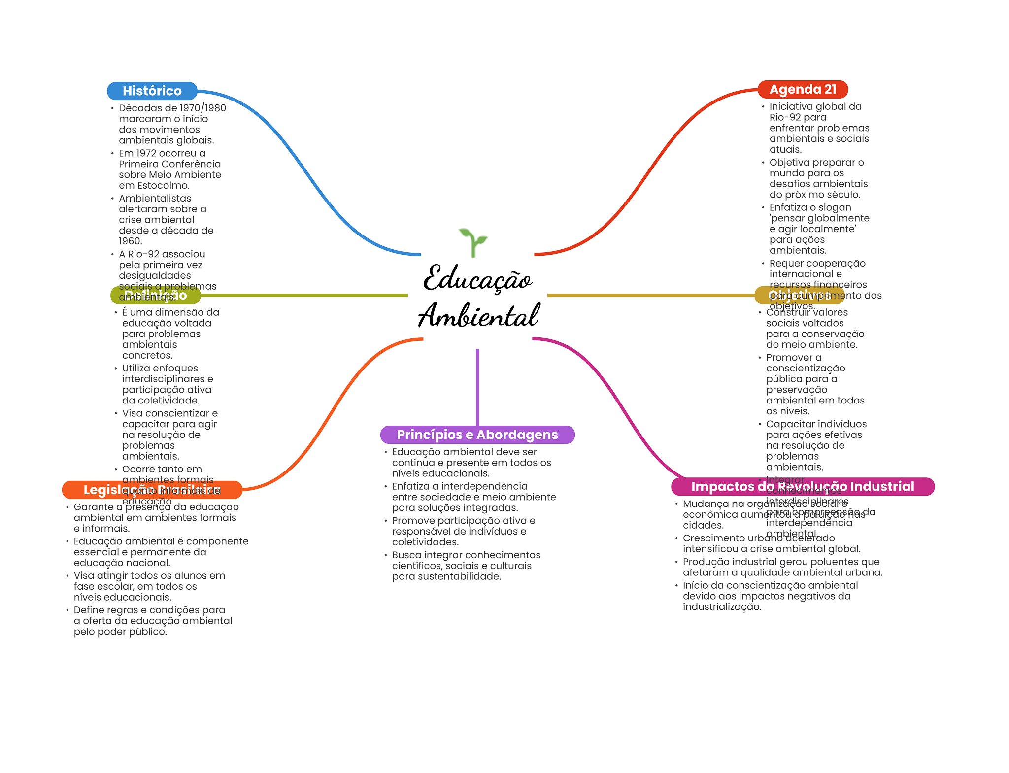 Histórico Agenda 21 Décadas de 1970/1980 Iniciativa global da marcaram início Rio-92 para dos movimentos enfrentar problemas ambientais globais. ambientais e sociais Em 1972 ocorreu a atuais. Primeira Conferência Objetiva preparar o sobre Meio Ambiente mundo para os em Estocolmo. desafios ambientais Ambientalistas do próximo século. alertaram sobre a Enfatiza slogan crise ambiental pensar globalmente desde a década de e agir 1960. para ações A Rio-92 associou ambientais. pela primeira vez Requer cooperação desigualdades Educação internacional e sociais a problemas recursos financeiros para dos É uma dimensão da Ambiental objetivos. Construir valores educação voltada sociais voltados para problemas para a conservação ambientais do meio ambiente. concretos. Promover a Utiliza enfoques conscientização interdisciplinares e pública para a participação ativa preservação da coletividade. ambiental em todos Visa conscientizar e níveis. capacitar para agir Capacitar indivíduos na resolução de Princípios e Abordagens para ações efetivas problemas na resolução de ambientais. Educação ambiental deve ser problemas contínua e presente em todos Ocorre tanto em ambientais. níveis educacionais. ambientes formais Enfatiza a interdependência Impactos da Revolução Industrial entre sociedade e meio ambiente Garante a presença da educação para soluções integradas. Mudança na ambiental em ambientes formais econômica Promove participação ativa e e informais. cidades. responsável de indivíduos e Educação ambiental é componente Crescimento urband coletividades. essencial e permanente da intensificou a crise ambiental global. Busca integrar conhecimentos educação nacional. científicos, sociais e culturais Produção industrial gerou poluentes que Visa atingir todos alunos em para afetaram a qualidade ambiental urbana. fase escolar, em todos Início da conscientização ambiental níveis educacionais. devido aos impactos negativos da Define regras e condições para industrialização. a oferta da educação ambiental pelo poder público.