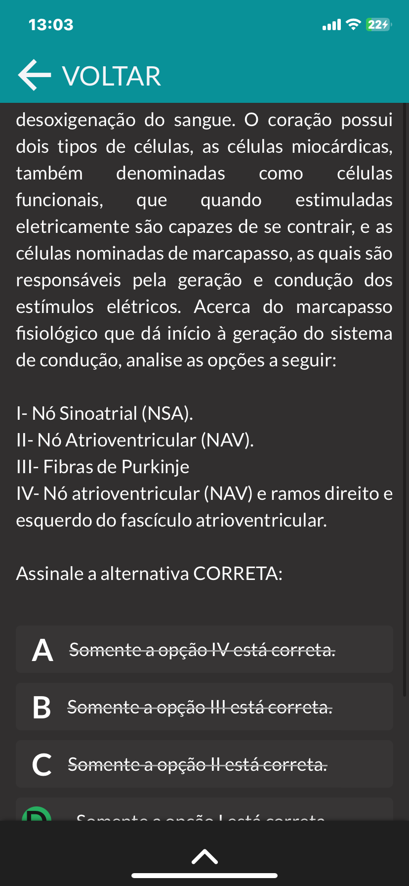 13:03 224 VOLTAR desoxigenação do sangue. coração possui dois tipos de células, as células miocárdicas, também denominadas como células funcionais, que quando estimuladas eletricamente são capazes de se contrair, e as células nominadas de marcapasso, as quais são responsáveis pela geração e condução dos estímulos elétricos. Acerca do marcapasso fisiológico que dá início à geração do sistema de condução, analise as opções a seguir: I- Nó Sinoatrial (NSA). II- Nó Atrioventricular (NAV). III- Fibras de Purkinje IV- Nó atrioventricular (NAV) e ramos direito e esquerdo do fascículo atrioventricular. Assinale a alternativa CORRETA: A Somente a opção IV está correta. B Somente a opção está correta. c Somente a opção H está correta.