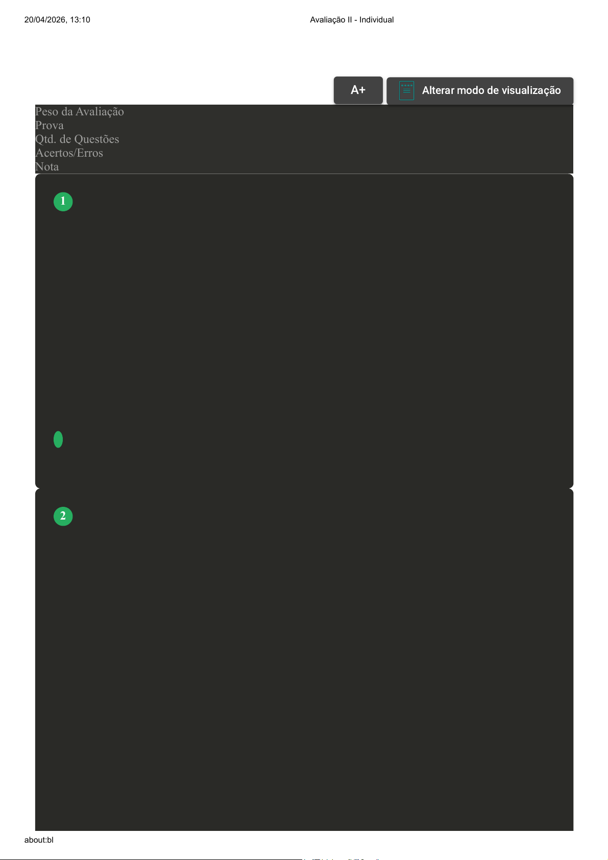 Prova Impressa GABARITO | Avaliação II - Individual (Cod.:1598037) Peso da Avaliação 1,50 Prova 119234252 Qtd. de Questões 10 Acertos/Erros 10/0 Nota 10,00 No ponto de vista de Max Weber, burocracia foi concebida de uma determinada forma, sendo esse teórico considerado o pai da burocracia. Acerca do surgimento da burocracia para Max Weber, assinale a alternativa CORRETA: A Divisão de trabalho, hierarquia de autoridade, seleção informal, regras, regulamentos, pessoalidade e orientação de carreira. B Sistema exagerado por divisão de trabalho e hierarquia de autoridade. C Sistema exagerado por regulamento e papéis se referindo ao sentido popular. D Ele considerava essa teoria como um modelo em que a estrutura é organizada por normas escritas, visando a racionalidade e igualdade de tratamento de todos os casos e situações. A burocracia determinada por Weber é uma forma racional de dominar as pessoas, funcionários ou uma nação com autoridade. Busca-se a precisão na obediência, continuidade, disciplina rigorosa e confiança. Mesmo após guerras e revoluções, o conceito indicado para a burocracia e seu funcionamento continuavam igualmente ao governo anterior, ou seja, o controle rigoroso de situações. Estas são representadas pelas normas e regras que cada cidadão deveria apresentar e corresponder ao sistema controlado por pessoas poderosas. Com isso, Weber considerava que a burocracia não é um sistema social, mas um tipo da busca pelo poder (RICHTER, 2016). Assim, tem-se alguns tipos de autoridades. Sobre esses tipos de autoridade e suas características, associe os itens, utilizando o código a seguir: I- Carismática. II- Tradicional. III- Burocrática. ( ) Nesse tipo de autoridade, os subordinados aceitam todas as ordens como legítimas, pela confiança e credibilidade que a pessoa do líder possui. Este não é hereditário, não possui base racional e é muito instável. ( ) Essa forma de autoridade é na forma patriarcal, está na própria pessoa, vem de herança de pai para filho, os subordinados apenas seguem as ordens porque sempre foi dessa maneira. Esse poder não é racional, possuindo um comportamento mais conservador. ( ) Está baseada em leis e normas que a figura autoritária possui. Nesse caso, os subordinados atendem às ordens, mas com crença em seus direitos e deveres, sem tirar a grande responsabilidade do superior. VOLTAR A+Aumentar, FonteAlterar modo de visualização 1 2 20/04/2026, 13:10 Avaliação II - Individual about:blank 1/6 ( ) Esse sistema de autoridade não está ligado a heranças, e sim por regras e normas estabelecidas e aceitas por todas as pessoas do país ou da organização. Assinale a alternativa que apresenta a sequência CORRETA: FONTE: RICHTER, Rosana. Fundamentos e teoria organizaciona. Indaial: UNIASSELVI, 2016. A I - II - III - III. B III - II - III - I. C III - III - II - I. D II - I - II - III. Os estudos realizados na Teoria das Relações Humanas identificaram que as pessoas precisavam de necessidades básicas, gerando motivação no ambiente de trabalho, referentes ao comportamento humano na busca de objetivos profissionais e sociais. O homem, com o passar do tempo e suas necessidades, evoluiu em três aspectos essenciais para promover a motivação: as necessidades fisiológicas, psicológicas e de autorrealização (RICHTER, 2016, p. 80). Tendo por base essas necessidades, analise as seguintes assertivas: I- As necessidades fisiológicas também chamadas de necessidades primárias, como: alimentação, sono, atividade física, satisfação sexual, abrigo, proteção e segurança. II- As necessidades psicológicas são independentes das necessidades fisiológicas, porém sem essas não se consegue chegar às necessidades de autorrealização. III- Consideram-se necessidades secundárias: a segurança íntima, participação de fazer parte de um grupo social, autoconfiança e afeição. IV- Na base das necessidades está a autorrealização, pois o ser humano sempre está procurando o seu próprio potencial em uma continuidade do seu autodesenvolvimento, mas que nem sempre é alcançado. Assinale a alternativa CORRETA: FONTE: RICHTER; Rosana. Fundamentos e teoria organizacional / Rosana Richter; Tulio Kléber Vicenzi: UNIASSELVI, 2016. A As assertivas I, II e III estão corretas. B As assertivas II, III e IV estão corretas. C As assertivas I, II e IV estão corretas. D As assertivas I e III estão corretas. O modelo em quem Hawthorne trabalhou buscou humanizar o trabalho das pessoas e, em 1924, através de uma pesquisa supervisionada por Mayo, buscou verificar a produtividade no local de trabalho, dentro dos princípios da Teoria Clássica. A pesquisa se deu em uma indústria de componentes elétricos, em que a rotatividade (tunover) de pessoas chegava a 250% ao ano, e mesmo tentando incentivos através de aumentos salariais, não trazia satisfação para o funcionário (RICHTER, 2016, p.74). Sobre as conclusões do modelo de Hawthrne, analise as seguintes 3 4 20/04/2026, 13:10 Avaliação II - Individual about:blank 2/6 afirmativas: I- A capacidade social faz parte do melhoramento no nível de produção, buscando a informalidade na relação entre operário e coordenação. II- O comportamento social dos operários ainda é individual, sendo que eles percebem que ficar fora do grupo é uma opção que pode ser vantajosa em alguns casos. III- A integração social facilita o desenvolvimento pessoal do operário fazendo com que ele se sinta parte de um todo, melhorando consideravelmente sua satisfação e interação no ambiente de trabalho. IV- Os funcionários têm o comportamento dependendo das recompensas e sanções sociais, segundo normas e padrões da sociedade. Assinale a alternativa CORRETA: FONTE: RICHTER, Rosana. Fundamentos e teoria organizacional. Indaial: UNIASSELVI, 2016. A As afirmativas I e IV estão corretas. B As afirmativas I, III e IV estão corretas. C As afirmativas I, II e III estão cor
