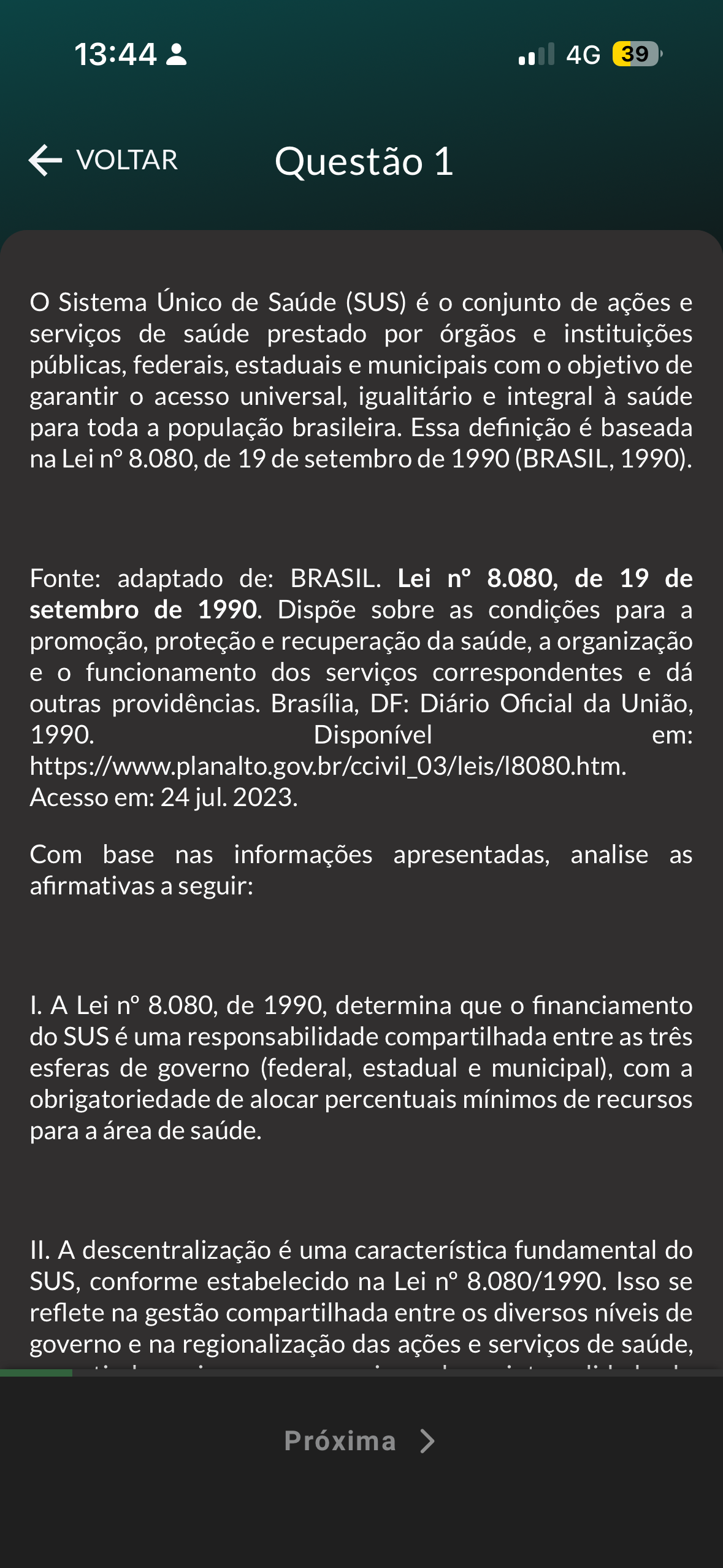13:44 4G 39 VOLTAR Questão 1 Sistema Único de Saúde (SUS) é conjunto de ações e serviços de saúde prestado por órgãos e instituições públicas, federais, estaduais e municipais com objetivo de garantir acesso universal, igualitário e integral à saúde para toda a população brasileira. Essa definição é baseada na Lei n° 8.080, de 19 de setembro de 1990 (BRASIL, 1990). Fonte: adaptado de: BRASIL. Lei n° 8.080, de 19 de setembro de 1990. Dispõe sobre as condições para a promoção, proteção e recuperação da saúde, a organização e funcionamento dos serviços correspondentes e dá outras providências. Brasília, DF: Diário Oficial da União, 1990. Disponível em: https://www.planalto.gov.br/ccivil_03/leis/18080.htm. Acesso em: 24 jul. 2023. Com base nas informações apresentadas, analise as afirmativas a seguir: I. A Lei n° 8.080, de 1990, determina que financiamento do SUS é uma responsabilidade compartilhada entre as três esferas de governo (federal, estadual e municipal), com a obrigatoriedade de alocar percentuais mínimos de recursos para a área de saúde. II. A descentralização é uma característica fundamental do SUS, conforme estabelecido na Lei n° 8.080/1990. Isso se reflete na gestão compartilhada entre os diversos níveis de governo e na regionalização das ações e serviços de saúde, Próxima >