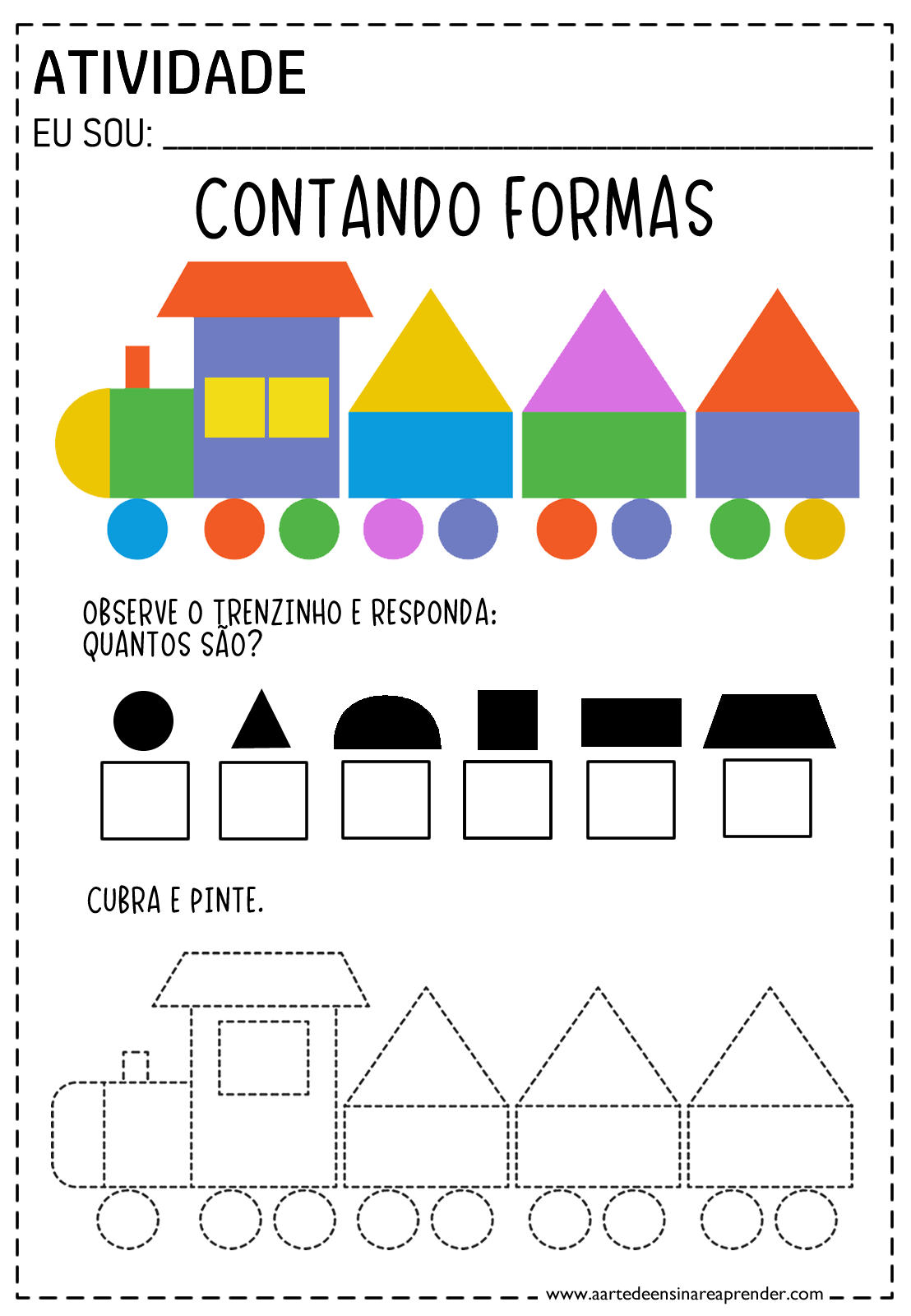 ATIVIDADE EU SOU: CONTANDO FORMAS OBSERVE 0 E RESPONDA: QUANTOS SAO? CUBRA E PINTE. 0000 www.aartedeensinareaprender.com