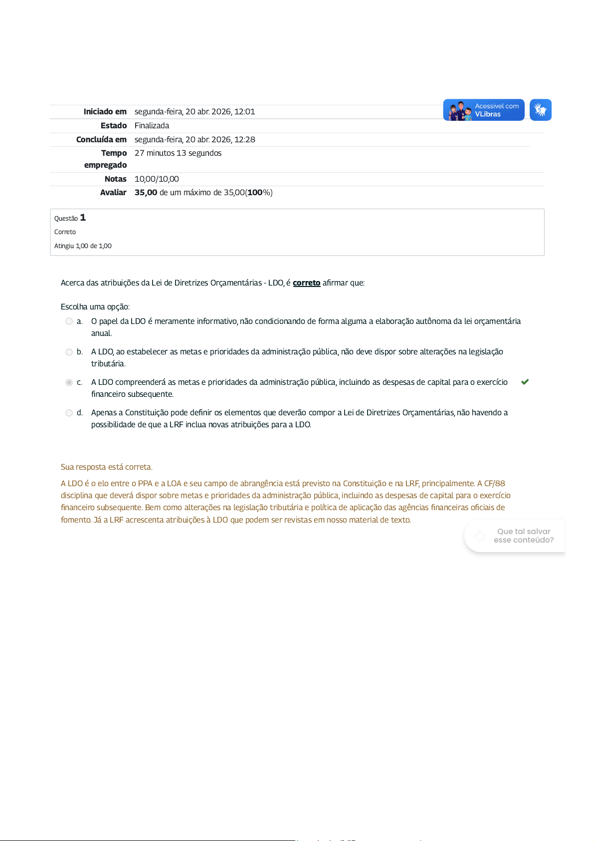 Iniciado em segunda-feira, 20 abr. 2026, 12:01 Estado Finalizada Concluída em segunda-feira, 20 abr. 2026, 12:28 Tempo empregado 27 minutos 13 segundos Notas 10,00/10,00 Avaliar 35,00 de um máximo de 35,00(100%) Questão 1 Correto Atingiu 1,00 de 1,00 Acerca das atribuições da Lei de Diretrizes Orçamentárias - LDO, é correto afirmar que: Escolha uma opção: a. O papel da LDO é meramente informativo, não condicionando de forma alguma a elaboração autônoma da lei orçamentária anual. b. A LDO, ao estabelecer as metas e prioridades da administração pública, não deve dispor sobre alterações na legislação tributária. c. A LDO compreenderá as metas e prioridades da administração pública, incluindo as despesas de capital para o exercício financeiro subsequente. d. Apenas a Constituição pode definir os elementos que deverão compor a Lei de Diretrizes Orçamentárias, não havendo a possibilidade de que a LRF inclua novas atribuições para a LDO. Sua resposta está correta. A LDO é o elo entre o PPA e a LOA e seu campo de abrangência está previsto na Constituição e na LRF, principalmente. A CF/88 disciplina que deverá dispor sobre metas e prioridades da administração pública, incluindo as despesas de capital para o exercício financeiro subsequente. Bem como alterações na legislação tributária e política de aplicação das agências financeiras oficiais de fomento. Já a LRF acrescenta atribuições à LDO que podem ser revistas em nosso material de texto. Que tal salvar esse conteúdo? Questão 2 Correto Atingiu 1,00 de 1,00 Questão 3 Correto Atingiu 1,00 de 1,00 A respeito do orçamento público, assinale a alternativa incorreta: Escolha uma opção: a. A LOA deverá incluir o orçamento fiscal referente aos Poderes da União, seus fundos, órgãos e entidades da administração direta e indireta. b. Os limites para a contratação de operações de crédito e concessão de garantias pelos entes federados são fixados por Resolução do Senado Federal, conforme estipula a Constituição. c. A Constituição de 1988 estipulou que a despesa com pessoal ativo e inativo da União, dos Estados, do Distrito Federal e dos Municípios não poderá exceder os limites estabelecidos em lei complementar. Para cumprir tal mandamento constitucional, foi editada a Lei Responsabilidade Fiscal. d. A reserva de contingência é a dotação global a ser utilizada como fonte de recursos para abertura de créditos adicionais, sempre que houver necessidade de complementação de alguma dotação original, por erro a menor na estimativa orçamentária. Sua resposta está correta. Conforme vimos em aula, a reserva de contingência tem finalidade específica e deve ser prevista na LDO, com o objetivo de atender a passivos contingentes e outros riscos e eventos fiscais imprevistos, ou seja, passivos que se materializem durante o exercício fiscal mas que não puderam ser previstos antecipadamente, em relação à possibilidade de ocorrência e valor exato. Aprecie os itens a seguir a respeito da integração entre PPA – Plano Plurianual, a LDO – Lei de Diretrizes Orçamentárias e a LOA – Lei Orçamentária Anual, e assinale a alternativa correta: Escolha uma opção: a. O PPA é uma lei complementar, enquanto a LOA é uma lei ordinária, e isso garante que o PPA orientará a elaboração da LOA. b. PPA, LDO e LOA são leis ordinárias, pois a própria Constituição obriga o encadeamento lógico do PPA, passando pela LDO, até a LOA. c. Dentre as regras que garantem a hierarquia entre os instrumentos, está o dispositivo constitucional que determina que emendas ao projeto de LDO não poderão ser aprovadas quando incompatíveis com a LOA. d. A compatibilidade entre PPA, LDO e LOA dependerá do Legislativo apreciar as três peças orçamentárias simultaneamente. Sua resposta está correta. Um dos aspectos mais interessantes do orçamento público brasileiro é justamente o encadeamento lógico e normativo entre PPA, LDO e LOA, garantido por normas constitucionais e sempre no sentido do planejamento (estratégico) para o orçamento (operacional): PPA>LDO>LOA. Estudamos esse aspecto em nossa aula. Retorne a ela em caso de necessidade de revisão. Que tal salvar esse conteúdo? Questão 4 Correto Atingiu 1,00 de 1,00 Questão 5 Correto Atingiu 1,00 de 1,00 Marque o item errado a respeito do regramento orçamentário brasileiro: Escolha uma opção: a. A Constituição de 1988 estipulou que a despesa com pessoal ativo e inativo da União, dos Estados, do Distrito Federal e dos Municípios não poderá exceder os limites estabelecidos em lei complementar. b. A reserva de contingência é a dotação global a ser utilizada como fonte de recursos para abertura de créditos adicionais e para o atendimento de passivos contingentes e outros riscos e eventos fiscais imprevistos. c. Embora haja previsão constitucional para a realização de despesas mínimas com as funções Educação e Seguridade Social, não há nenhum mandamento que explicitamente estabeleça limites para os gastos com a Saúde. d. Com foco na integração entre plano e orçamento, a própria Constituição explicita a obrigatoriedade de observância do encadeamento lógico que parte do PPA, atravessa a LDO e se resolve na LOA. Sua resposta está correta. Nessa questão, tivemos a oportunidade de rever vários conceitos orçamentários da última aula, como limites com despesas de pessoal, reserva de contingência, vinculação orçamentária para áreas específicas (saúde, educação, seguridade social, entre outros) e encadeamento lógico entre PPA, LDO e LOA. Sugerimos rever os tópicos específicos em caso de dúvidas. Suponha que você seja um gestor público municipal. Sua equipe decide criar um novo programa de prevenção ao tabagismo, pois os índices de doenças relacionadas ao fumo subiram muito na cidade nos últimos anos. Esse programa não foi inicialmente previsto na LOA, ou seja, não há