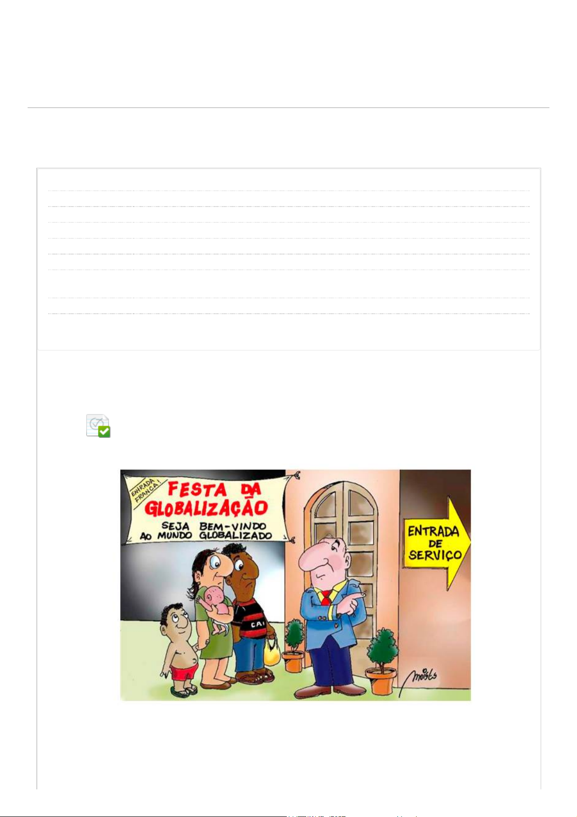 Revisar envio do teste: QUESTIONÁRIO UNIDADE II ESTUDOS DISCIPLINARES XIII 7438-25_SEPI_EN_0123_R_20261 CONTEÚDO Usuário hirayma.luzeiro @aluno.unip.br Curso ESTUDOS DISCIPLINARES XIII Teste QUESTIONÁRIO UNIDADE II Iniciado 28/03/26 23:44 Enviado 28/03/26 23:49 Status Completada Resultado da tentativa 5 em 5 pontos Tempo decorrido 4 minutos Resultados exibidos Todas as respostas, Respostas enviadas, Respostas corretas, Comentários, Perguntas respondidas incorretamente Pergunta 1 Sociedade e economia: globalização e desigualdade social. Veja a charge e leia o trecho de texto de Milton Santos a seguir: Disponível em: https://mcartuns.wordpress.com/2013/08/02/globalizacao-3/. Acesso em: 15 ago. 2017. De fato, para grande parte da humanidade a globalização está se impondo como uma fábrica de perversidades. O desemprego crescente torna-se crônico. A pobreza aumenta e as classes UNIP EAD BIBLIOTECAS MURAL DO ALUNO TUTORIAISCONTEÚDOS ACADÊMICOS 0,5 em 0,5 pontos 28/03/2026, 21:49 Revisar envio do teste: QUESTIONÁRIO UNIDADE II – ... https://ava.ead.unip.br/webapps/assessment/review/review.jsp?attempt_id=_119320605_1&course_id=_451646_1&content_id=_5052514_1&ret… 1/17 http://company.blackboard.com/ https://ava.ead.unip.br/webapps/blackboard/execute/courseMain?course_id=_451646_1 https://ava.ead.unip.br/webapps/blackboard/content/listContent.jsp?course_id=_451646_1&content_id=_5048247_1&mode=reset https://ava.ead.unip.br/webapps/portal/execute/tabs/tabAction?tab_tab_group_id=_10_1 https://ava.ead.unip.br/webapps/portal/execute/tabs/tabAction?tab_tab_group_id=_27_1 https://ava.ead.unip.br/webapps/portal/execute/tabs/tabAction?tab_tab_group_id=_47_1 https://ava.ead.unip.br/webapps/portal/execute/tabs/tabAction?tab_tab_group_id=_29_1 https://ava.ead.unip.br/webapps/portal/execute/tabs/tabAction?tab_tab_group_id=_25_1 https://ava.ead.unip.br/webapps/login/?action=logout Resposta Selecionada: a. Respostas: a. b. c. d. e. Comentário da resposta: médias perdem em qualidade de vida. O salário médio tende a baixar. A fome e o desabrigo se generalizam em todos os continentes. A mortalidade infantil permanece, a despeito dos progressos médicos e da informação. A educação de qualidade é, cada vez mais, inacessível. Alastram-se e aprofundam-se os males espirituais e morais, como o egoísmo, o cinismo e a corrupção. A perversidade sistêmica que está na raiz dessa evolução negativa da humanidade tem relação com a adesão desenfreada aos comportamentos competitivos que, atualmente, caracterizam as ações hegemônicas. Todas essas mazelas são, direta ou indiretamente, imputáveis ao presente processo de globalização. Fonte: SANTOS, M. Por uma outra globalização, do pensamento único à consciência universal. Rio de Janeiro: Record, 2001. Com base na leitura, avalie as afirmativas a seguir: I. A charge e o texto apresentam visões antagônicas sobre o processo de globalização, pois a charge mostra a inclusão de todos, e o texto critica a perversidade da economia global; II. Para Milton Santos, a perversidade caracterizada pelas desigualdades é intrínseca à globalização; III. A charge destaca o aumento das ofertas de emprego promovido pela globalização, ao contrário do texto, que afirma que o desemprego é crescente e crônico; IV. A charge e o texto contrapõem-se ao discurso comum de que a globalização promove a igualdade e o crescimento a todos os países, e as classes sociais. É correto o que se afirma, somente, em: II e IV. II e IV. I, II e IV. II, III e IV. I e III. II e III. Resposta: A Comentário: I e III. Afirmativas incorretas. JUSTIFICATIVA. A charge e o texto apresentam visões similares sobre a globalização. A charge mostra uma situação de exclusão social na Era da Globalização e não indica que esse processo gere o aumento na oferta de emprego. O texto afirma que “para grande parte da humanidade a globalização está se impondo como uma fábrica de perversidades”. II. Afirmativa correta. JUSTIFICATIVA. Segundo o texto, “a perversidade sistêmica que está na raiz [da] evolução negativa da humanidade tem relação com a adesão desenfreada aos comportamentos competitivos que, atualmente, caracterizam as ações hegemônicas”. O autor prossegue afirmando que “todas essas mazelas são, direta ou indiretamente, imputáveis ao presente processo de globalização”. IV. Afirmativa correta. JUSTIFICATIVA. Tanto a charge quanto o texto contrariam a ideia segundo a qual o processo de globalização seria capaz de levar à igualdade social e de promover o crescimento da totalidade das nações. 28/03/2026, 21:49 Revisar envio do teste: QUESTIONÁRIO UNIDADE II – ... https://ava.ead.unip.br/webapps/assessment/review/review.jsp?attempt_id=_119320605_1&course_id=_451646_1&content_id=_5052514_1&ret… 2/17 Pergunta 2 Educação: ensino e evolução social. Veja a charge e leia o texto da professora Íris Rodrigues Oliveira, da UFRJ: Disponível em: http://educacaoecidadaniaucsal.blogspot.com.br. Acesso em: 27 jul. 2017. A educação não pode, sozinha, instaurar um estatuto de ascensão social para quem quer que seja. Não é um fato comprovado cientificamente que alguém que tenha, por exemplo, curso universitário ascenda social, econômica e emocionalmente. A educação tem que ser aberta para todos e possibilitar que o homem tenha uma formação que o capacite a conhecer novos espaços, investir em novas aventuras, sejam cognitivas, afetivas, econômicas, sociais, de todos os tipos. O Brasil tem que lutar contra os fortes indicadores de exclusão social, econômica e financeira. Quando se fala em ascensão social, pensa-se em, apenas, uma das características, porque ninguém comprova que uma ascensão econômica leva a uma social. O que é uma ascensão social? Como é que você se sente incluído socialmente em uma cultura, em um grupo e em um lugar? Será que as pessoas de bom nível econômico, emocional, afetivo têm, tamb