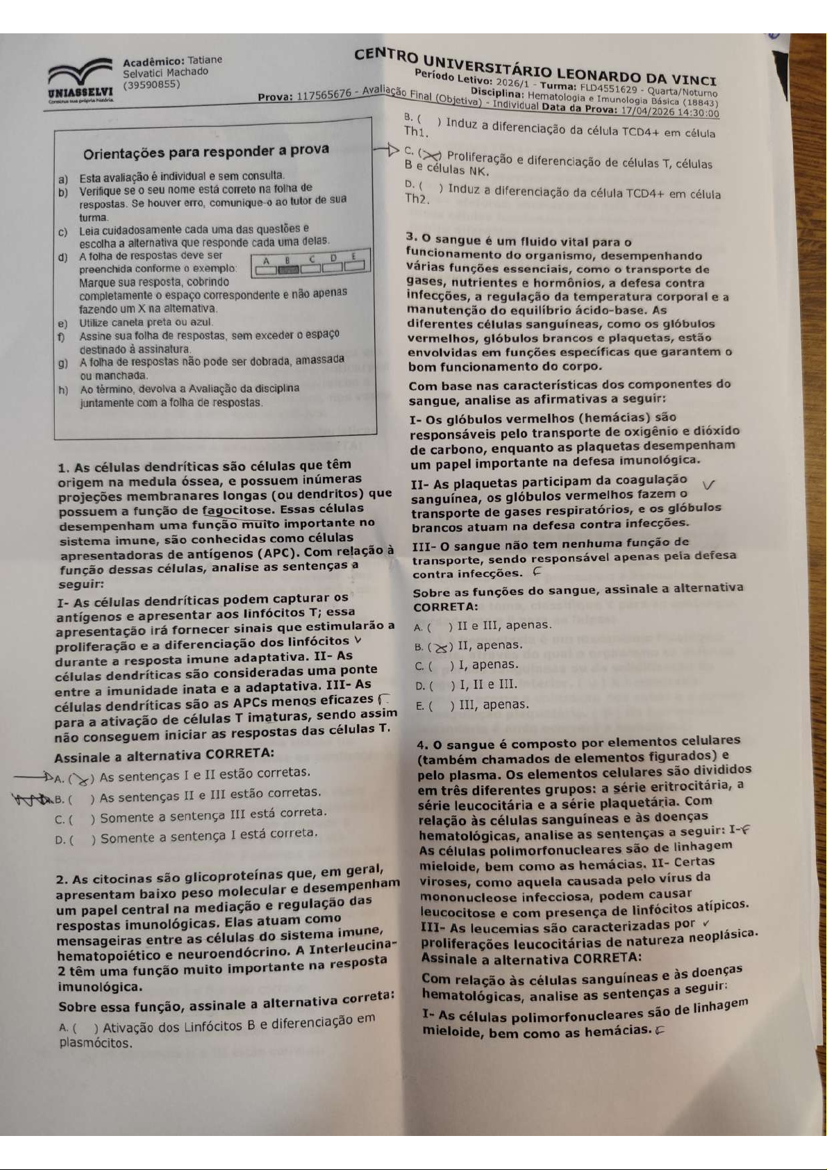 Acadêmico: Tatiane Selvatici Machado (39590855) CENTRO Avaliação UNIVERSITÁRIO 2026/1 LEONARDO DA VINCI UNIASSELVI Prova: 117565676 Final Prova: Quarta/Noturno Básica (18843) B. Induz a diferenciação da célula 17/04/2026 TCD4+ em 14:30:00 célula Orientações para responder a prova C. B Proliferação e diferenciação de células T, células a) Esta avaliação é individual e sem consulta. e células NK. b) Verifique se seu nome está correto na folha de respostas. Se houver erro, comunique-o tutor de sua D. Induz a diferenciação da célula TCD4+ em célula turma. c) Leia cuidadosamente cada uma das questões e escolha a alternativa que responde cada uma delas. sangue é um fluido vital para d) A folha de respostas deve ser A B C D E funcionamento do organismo, desempenhando preenchida conforme exemplo: várias funções essenciais, como transporte de Marque sua resposta, cobrindo gases, nutrientes e hormônios, a defesa contra completamente espaço correspondente e não apenas infecções, a regulação da temperatura corporal e a fazendo um na alternativa. manutenção do equilíbrio ácido-base. As e) Utilize caneta preta ou azul. diferentes células sanguíneas, como os glóbulos f) Assine sua folha de respostas, sem exceder espaço vermelhos, glóbulos brancos e plaquetas, estão destinado à g) A folha de respostas não pode ser dobrada, amassada envolvidas em funções específicas que garantem ou manchada. bom do corpo. h) Ao término, devolva a Avaliação da disciplina Com base nas características dos componentes do juntamente com a folha de respostas. sangue, analise as afirmativas a seguir: I- Os glóbulos vermelhos (hemácias) são responsáveis pelo transporte de oxigênio e dióxido de carbono, enquanto as plaquetas desempenham 1. As células dendríticas são células que têm um papel importante na defesa imunológica. origem na medula óssea, e possuem inúmeras II- As plaquetas participam da coagulação projeções membranares longas (ou dendritos) que sanguínea, os glóbulos vermelhos fazem possuem a função de fagocitose. Essas células transporte de gases respiratórios, e os glóbulos desempenham uma função muito importante no brancos atuam na defesa contra infecções. sistema imune, são conhecidas como células apresentadoras de antígenos (APC). Com relação à III- sangue não tem nenhuma função de função dessas células, analise as sentenças a transporte, sendo responsável apenas pela defesa contra infecções. F seguir: I- As células dendríticas podem capturar os Sobre as funções do sangue, assinale a alternativa antígenos e apresentar aos linfócitos T; essa CORRETA: apresentação irá fornecer sinais que estimularão a A. ) II e III, apenas. proliferação e a diferenciação dos linfócitos B. II, apenas. durante a resposta imune adaptativa. II- As células dendríticas são consideradas uma ponte ) I, apenas. entre a imunidade inata e a adaptativa. III- As D.( ) I, II e III. células dendríticas são as APCs menos eficazes E.( ) III, apenas. para a ativação de células T imaturas, sendo assim não conseguem iniciar as respostas das células 4. o sangue é composto por elementos celulares Assinale a alternativa CORRETA: (também chamados de elementos figurados) e As sentenças I e II estão corretas. pelo plasma. Os elementos celulares são divididos As sentenças II e III estão corretas. em três diferentes grupos: a série eritrocitária, a série leucocitária e a série plaquetária. Com ) Somente a sentença III está correta. relação às células sanguíneas e às doenças D. ( ) Somente a sentença I está correta. hematológicas, analise as sentenças a seguir: I-F As células polimorfonucleares são de linhagem 2. As citocinas são glicoproteínas que, em geral, mieloide, bem como as hemácias. II- Certas apresentam baixo peso molecular e desempenham viroses, como aquela causada pelo vírus da um papel central na mediação e regulação das mononucleose infecciosa, podem causar leucocitose e com presença de linfócitos atípicos. respostas imunológicas. Elas atuam como mensageiras entre as células do sistema imune, III- As leucemias são caracterizadas por hematopoiético e neuroendócrino. A Interleucina- proliferações leucocitárias de natureza neoplásica. 2 têm uma função muito importante na resposta Assinale a alternativa CORRETA: imunológica. Com relação às células sanguíneas e às doenças Sobre essa função, assinale a alternativa correta: hematológicas, analise as sentenças a seguir: A. ( ) Ativação dos Linfócitos B e diferenciação em I- As células polimorfonucleares são de linhagem plasmócitos. mieloide, bem como as hemácias. FAcadêmico: Tatiane CENTRO UNIVERSITÁRIO LEONARDO DA VINCI Selvatici Machado Período Letivo: 2026/1 Turma: FLD4551629 Quarta/Noturno (39590855) UNIASSELVI Prova: 117565676 Avaliação Final (Objetiva) Disciplina: Individual Hematologia Data da Prova: e Imunologia 17/04/2026 Básica 14:30:00 (18843) II- Certas viroses, como aquela causada pelo vírus da mononucleose infecciosa, podem causar 7. As células TCD4+ possuem subtipos de células, leucocitose e com presença de linfócitos atípicos. e cada subtipo secretam um conjunto de citocinas, III- As leucemias são caracterizadas por os quais irão provocar reações diferentes de proliferações leucocitárias de natureza defesa. Existem três grandes subgrupos de células TCD4+ efetoras, chamadas de TH1, TH2 e TH17, e neoplásica. essas células funcionam na defesa do hospedeiro É correto o que se afirma em: contra diferentes tipos de agentes patogênicos A. Somente a sentença I está correta. infecciosos e estão envolvidas em diferentes tipos As sentenças I, II e III estão corretas. de lesões de tecidos em doenças imunológicas. C. Nenhuma alternativa está correta. Assinale a alternativa CORRETA que apresenta as características que distinguem uma célula Th1 de D. Somente a sentença III