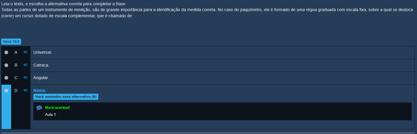 Leia 0 texto, e escolha a alternativa correta para completar a frase. Todas as partes de um instrumento de medição, são de grande importância para a identificação da medida correta. No caso do paquímetro, ele é formado de uma régua graduada com escala fixa, sobre a qual se desloca (corre) um cursor dotado de escala complementar, que é chamado de: Nota: 10.0 A Universal. B Catraca. C Angular. D Nônio. Você assinalou essa alternativa (D) Você acertou! Aula 1