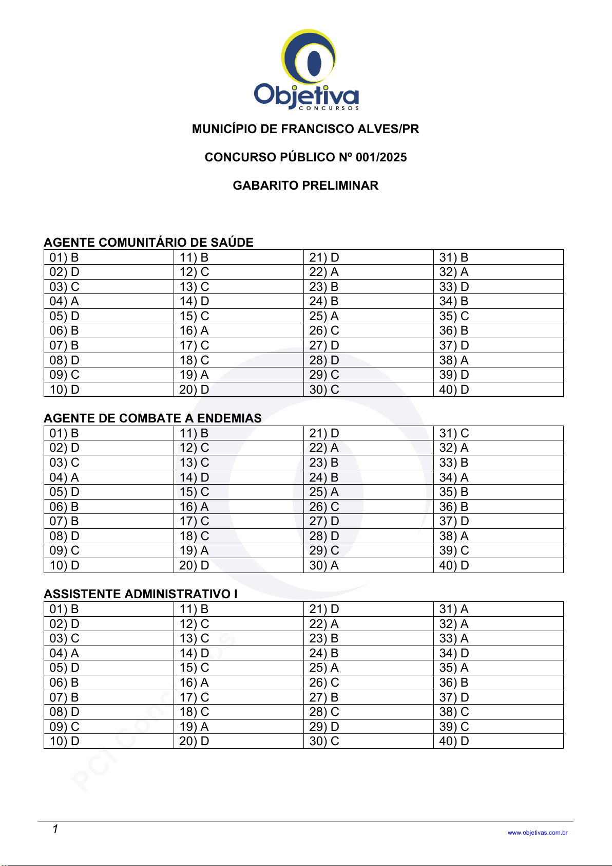 pcimarkpci MjgwNDo2ZmU4OjAxYzI6NzcwMDoxMWI1Ojg0NDU6MDY5OTo5MmVi:TW9uLCAyMCBBcHIgMjAyNiAxNzoyODo0MiAtMDMwMA== www.pciconcursos.com.br 1 www.objetivas.com.br MUNICÍPIO DE FRANCISCO ALVES/PR CONCURSO PÚBLICO Nº 001/2025 GABARITO PRELIMINAR AGENTE COMUNITÁRIO DE SAÚDE 01) B 11) B 21) D 31) B 02) D 12) C 22) A 32) A 03) C 13) C 23) B 33) D 04) A 14) D 24) B 34) B 05) D 15) C 25) A 35) C 06) B 16) A 26) C 36) B 07) B 17) C 27) D 37) D 08) D 18) C 28) D 38) A 09) C 19) A 29) C 39) D 10) D 20) D 30) C 40) D AGENTE DE COMBATE A ENDEMIAS 01) B 11) B 21) D 31) C 02) D 12) C 22) A 32) A 03) C 13) C 23) B 33) B 04) A 14) D 24) B 34) A 05) D 15) C 25) A 35) B 06) B 16) A 26) C 36) B 07) B 17) C 27) D 37) D 08) D 18) C 28) D 38) A 09) C 19) A 29) C 39) C 10) D 20) D 30) A 40) D ASSISTENTE ADMINISTRATIVO I 01) B 11) B 21) D 31) A 02) D 12) C 22) A 32) A 03) C 13) C 23) B 33) A 04) A 14) D 24) B 34) D 05) D 15) C 25) A 35) A 06) B 16) A 26) C 36) B 07) B 17) C 27) B 37) D 08) D 18) C 28) C 38) C 09) C 19) A 29) D 39) C 10) D 20) D 30) C 40) D pcimarkpci MjgwNDo2ZmU4OjAxYzI6NzcwMDoxMWI1Ojg0NDU6MDY5OTo5MmVi:TW9uLCAyMCBBcHIgMjAyNiAxNzoyODo0MiAtMDMwMA== www.pciconcursos.com.br 2 www.objetivas.com.br ASSISTENTE SOCIAL 01) B 11) D 21) D 31) D 02) C 12) C 22) B 32) D 03) D 13) B 23) A 33) B 04) A 14) D 24) C 34) D 05) B 15) C 25) A 35) B 06) C 16) A 26) B 36) D 07) C 17) D 27) A 37) C 08) A 18) B 28) A 38) A 09) D 19) C 29) D 39) C 10) A 20) A 30) A 40) D AUXILIAR DE EDUCAÇÃO INFANTIL 01) B 11) B 21) D 31) D 02) D 12) C 22) A 32) C 03) C 13) C 23) B 33) C 04) A 14) D 24) B 34) B 05) D 15) C 25) A 35) C 06) B 16) A 26) C 36) B 07) B 17) C 27) B 37) D 08) D 18) C 28) D 38) A 09) C 19) A 29) A 39) C 10) D 20) D 30) C 40) A AUXILIAR DE LABORATÓRIO 01) B 11) B 21) D 31) A 02) D 12) C 22) A 32) A 03) C 13) C 23) B 33) C 04) A 14) D 24) B 34) B 05) D 15) C 25) A 35) B 06) B 16) A 26) C 36) A 07) B 17) C 27) D 37) B 08) D 18) C 28) C 38) A 09) C 19) A 29) C 39) B 10) D 20) D 30) D 40) D pcimarkpci MjgwNDo2ZmU4OjAxYzI6NzcwMDoxMWI1Ojg0NDU6MDY5OTo5MmVi:TW9uLCAyMCBBcHIgMjAyNiAxNzoyODo0MiAtMDMwMA== www.pciconcursos.com.br 3 www.objetivas.com.br AUXILIAR DE LIMPEZA E ORDEM PÚBLICA 01) B 11) B 21) B 02) B 12) A 22) D 03) C 13) C 23) A 04) C 14) D 24) A 05) D 15) C 25) C 06) B 16) D 26) C 07) C 17) C 27) B 08) A 18) B 28) C 09) C 19) D 29) A 10) B 20) C 30) D AUXILIAR DE SERVIÇOS GERAIS 01) B 11) B 21) B 02) B 12) A 22) D 03) C 13) C 23) A 04) C 14) D 24) A 05) D 15) C 25) C 06) B 16) D 26) D 07) C 17) C 27) B 08) A 18) B 28) C 09) C 19) D 29) D 10) B 20) C 30) C DENTISTA 01) B 11) D 21) D 31) A 02) C 12) C 22) B 32) C 03) D 13) B 23) A 33) C 04) A 14) D 24) C 34) B 05) B 15) C 25) A 35) D 06) C 16) A 26) B 36) C 07) C 17) D 27) A 37) B 08) A 18) B 28) A 38) B 09) D 19) C 29) D 39) C 10) A 20) A 30) A 40) B pcimarkpci MjgwNDo2ZmU4OjAxYzI6NzcwMDoxMWI1Ojg0NDU6MDY5OTo5MmVi:TW9uLCAyMCBBcHIgMjAyNiAxNzoyODo0MiAtMDMwMA== www.pciconcursos.com.br 4 www.objetivas.com.br ENFERMEIRO PADRÃO 01) B 11) D 21) D 31) C 02) C 12) C 22) B 32) D 03) D 13) B 23) A 33) A 04) A 14) D 24) C 34) D 05) B 15) C 25) A 35) B 06) C 16) A 26) B 36) A 07) C 17) D 27) A 37) D 08) A 18) B 28) A 38) C 09) D 19) C 29) D 39) A 10) A 20) A 30) A 40) B ENGENHEIRO CIVIL 01) B 11) D 21) D 31) B 02) C 12) C 22) B 32) A 03) D 13) B 23) A 33) B 04) A 14) D 24) C 34) B 05) B 15) C 25) A 35) C 06) C 16) A 26) B 36) D 07) C 17) D 27) A 37) B 08) A 18) B 28) B 38) B 09) D 19) C 29) D 39) C 10) A 20) A 30) B 40) D FARMACÊUTICO 01) B 11) D 21) D 31) B 02) C 12) C 22) B 32) B 03) D 13) B 23) A 33) A 04) A 14) D 24) C 34) D 05) B 15) C 25) A 35) D 06) C 16) A 26) B 36) B 07) C 17) D 27) A 37) A 08) A 18) B 28) A 38) D 09) D 19) C 29) D 39) B 10) A 20) A 30) A 40) C pcimarkpci MjgwNDo2ZmU4OjAxYzI6NzcwMDoxMWI1Ojg0NDU6MDY5OTo5MmVi:TW9uLCAyMCBBcHIgMjAyNiAxNzoyODo0MiAtMDMwMA== www.pciconcursos.com.br 5 www.objetivas.com.br FARMACÊUTICO BIOQUÍMICO 01) B 11) D 21) D 31) B 02) C 12) C 22) B 32) A 03) D 13) B 23) A 33) D 04) A 14) D 24) C 34) C 05) B 15) C 25) A 35) D 06) C 16) A 26) B 36) B 07) C 17) D 27) A 37) A 08) A 18) B 28) A 38) C 09) D 19) C 29) D 39) D 10) A 20) A 30) A 40) A FONOAUDIÓLOGO 01) B 11) D 21) D 31) B 02) C 12) C 22) B 32) C 03) D 13) B 23) A 33) A 04) A 14) D 24) C 34) B 05) B 15) C 25) A 35) D 06) C 16) A 26) B 36) D 07) C 17) D 27) A 37) C 08) A 18) B 28) A 38) A 09) D 19) C 29) D 39) B 10) A 20) A 30) A 40) C MÉDICO 01) B 11) D 21) D 31) B 02) C 12) C 22) B 32) D 03) D 13) B 23) A 33) C 04) A 14) D 24) C 34) D 05) B 15) C 25) A 35) C 06) C 16) A 26) B 36) A 07) C 17) D 27) A 37) D 08) A 18) B 28) A 38) A 09) D 19) C 29) D 39) B 10) A 20) A 30) A 40) A pcimarkpci MjgwNDo2ZmU4OjAxYzI6NzcwMDoxMWI1Ojg0NDU6MDY5OTo5MmVi:TW9uLCAyMCBBcHIgMjAyNiAxNzoyODo0MiAtMDMwMA== www.pciconcursos.com.br 6 www.objetivas.com.br MONITOR SOCIAL 01) B 11) B 21) D 31) B 02) D 12) C 22) A 32) D 03) C 13) C 23) B 33) C 04) A 14) D 24) B 34) B 05) D 15) C 25) A 35) C 06) B 16) A 26) C 36) B 07) B 17) C 27) B 37) D 08) D 18) C 28) A 38) A 09) C 19) A 29) D 39) C 10) D 20) D 30) C 40) A MOTORISTA CATEGORIA “D” 01) B 11) B 21) B 02) B 12) A 22) D 03) C 13) C 23) D 04) C 14) D 24) C 05) D 15) C 25) A 06) B 16) D 26) A 07) C 17) C 27) D 08) A 18) C 28) D 09) C 19) D 29) A 10) B 20) C 30) B NUTRICIONISTA 01) B 11) D 21) D 31) C 02) C 12) C 22) B 32) D 03) D 13) B 23) A 33) B 04) A 14) D 24) C 34) D 05) B 15) C 25) A 35) D 06) C 16) A 26) B 36) A 07) C 17) D 27) A 37) B 08) A 18) B 28) A 38) C 09) D 19) C 29) D 39) A 10) A 20) A 30) A 40) D pcimarkpci MjgwNDo2ZmU4OjAxYzI6NzcwMDoxMWI1Ojg0NDU6MDY5OTo5MmVi:TW9uLCAyMCBBcHIgMjAyNiAxNzoyODo0MiAtMDMwMA== www.pciconcursos.com.br 7 www.objetivas.com.br OPERADOR DE MÁQUINA PESADA 01) B 11) B 21) B 02) B 12) A 22) D 03) C 13) C 23) D 04) C 14) D 24) C 05) D 15) C 25) A 06) B 16) D 26) A 07) C 17) C 27) D 08) A 18) B 28) D 09) C 19) D 29) A 10) B 20) C 30) B PEDAGOGO 01) B 11) D 21) D 31) C 02) C 12) C 22) B 32) A 03) D 13) B 23) A 33) B 04