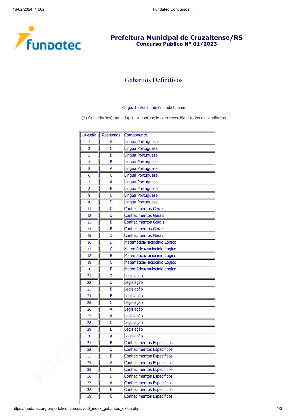 pcimarkpci MjgwNDo2ZmU4OjAxYzI6NzcwMDoxMWI1Ojg0NDU6MDY5OTo5MmVi:TW9uLCAyMCBBcHIgMjAyNiAxNzozMToyNSAtMDMwMA== www.pciconcursos.com.br 16/02/2024, 14:02 .: Fundatec Concursos :. https://fundatec.org.br/portal/concursos/v6.0_index_gabaritos_exibe.php 1/2 Prefeitura Municipal de Cruzaltense/RS Concurso Público Nº 01/2023 Gabaritos Definitivos Cargo: 1 - Auditor de Controle Interno (*) Questão(ões) anulada(s) - a pontuação será revertida a todos os candidatos Questão Respostas Componente 1 A Língua Portuguesa 2 C Língua Portuguesa 3 B Língua Portuguesa 4 E Língua Portuguesa 5 A Língua Portuguesa 6 C Língua Portuguesa 7 A Língua Portuguesa 8 E Língua Portuguesa 9 C Língua Portuguesa 10 D Língua Portuguesa 11 C Conhecimentos Gerais 12 D Conhecimentos Gerais 13 B Conhecimentos Gerais 14 E Conhecimentos Gerais 15 D Conhecimentos Gerais 16 D Matemática/raciocínio Lógico 17 C Matemática/raciocínio Lógico 18 B Matemática/raciocínio Lógico 19 C Matemática/raciocínio Lógico 20 E Matemática/raciocínio Lógico 21 D Legislação 22 D Legislação 23 B Legislação 24 E Legislação 25 C Legislação 26 A Legislação 27 A Legislação 28 C Legislação 29 E Legislação 30 A Legislação 31 B Conhecimentos Específicos 32 D Conhecimentos Específicos 33 E Conhecimentos Específicos 34 A Conhecimentos Específicos 35 C Conhecimentos Específicos 36 D Conhecimentos Específicos 37 A Conhecimentos Específicos 38 E Conhecimentos Específicos 39 C Conhecimentos Específicos pcimarkpci MjgwNDo2ZmU4OjAxYzI6NzcwMDoxMWI1Ojg0NDU6MDY5OTo5MmVi:TW9uLCAyMCBBcHIgMjAyNiAxNzozMToyNSAtMDMwMA== www.pciconcursos.com.br 16/02/2024, 14:02 .: Fundatec Concursos :. https://fundatec.org.br/portal/concursos/v6.0_index_gabaritos_exibe.php 2/2 40 D Conhecimentos Específicos Imprimir Assinatura Eletrônica: 28892.5 pcimarkpci MjgwNDo2ZmU4OjAxYzI6NzcwMDoxMWI1Ojg0NDU6MDY5OTo5MmVi:TW9uLCAyMCBBcHIgMjAyNiAxNzozMToyNSAtMDMwMA== www.pciconcursos.com.br 16/02/2024, 14:02 .: Fundatec Concursos :. https://fundatec.org.br/portal/concursos/v6.0_index_gabaritos_exibe.php 1/2 Prefeitura Municipal de Cruzaltense/RS Concurso Público Nº 01/2023 Gabaritos Definitivos Cargo: 2 - Enfermeiro Padrão (*) Questão(ões) anulada(s) - a pontuação será revertida a todos os candidatos Questão Respostas Componente 1 A Língua Portuguesa 2 C Língua Portuguesa 3 B Língua Portuguesa 4 E Língua Portuguesa 5 A Língua Portuguesa 6 C Língua Portuguesa 7 A Língua Portuguesa 8 E Língua Portuguesa 9 C Língua Portuguesa 10 D Língua Portuguesa 11 C Conhecimentos Gerais 12 D Conhecimentos Gerais 13 B Conhecimentos Gerais 14 E Conhecimentos Gerais 15 D Conhecimentos Gerais 16 D Matemática/raciocínio Lógico 17 C Matemática/raciocínio Lógico 18 B Matemática/raciocínio Lógico 19 C Matemática/raciocínio Lógico 20 E Matemática/raciocínio Lógico 21 D Legislação 22 D Legislação 23 B Legislação 24 E Legislação 25 C Legislação 26 A Legislação 27 A Legislação 28 C Legislação 29 E Legislação 30 A Legislação 31 A Conhecimentos Específicos 32 B Conhecimentos Específicos 33 C Conhecimentos Específicos 34 D Conhecimentos Específicos 35 E Conhecimentos Específicos 36 B Conhecimentos Específicos 37 C Conhecimentos Específicos 38 E Conhecimentos Específicos 39 B Conhecimentos Específicos pcimarkpci MjgwNDo2ZmU4OjAxYzI6NzcwMDoxMWI1Ojg0NDU6MDY5OTo5MmVi:TW9uLCAyMCBBcHIgMjAyNiAxNzozMToyNSAtMDMwMA== www.pciconcursos.com.br 16/02/2024, 14:02 .: Fundatec Concursos :. https://fundatec.org.br/portal/concursos/v6.0_index_gabaritos_exibe.php 2/2 40 A Conhecimentos Específicos Imprimir Assinatura Eletrônica: 26337.5 pcimarkpci MjgwNDo2ZmU4OjAxYzI6NzcwMDoxMWI1Ojg0NDU6MDY5OTo5MmVi:TW9uLCAyMCBBcHIgMjAyNiAxNzozMToyNSAtMDMwMA== www.pciconcursos.com.br 16/02/2024, 14:02 .: Fundatec Concursos :. https://fundatec.org.br/portal/concursos/v6.0_index_gabaritos_exibe.php 1/2 Prefeitura Municipal de Cruzaltense/RS Concurso Público Nº 01/2023 Gabaritos Definitivos Cargo: 3 - Engenheiro (*) Questão(ões) anulada(s) - a pontuação será revertida a todos os candidatos Questão Respostas Componente 1 E Língua Portuguesa 2 C Língua Portuguesa 3 A Língua Portuguesa 4 B Língua Portuguesa 5 B Língua Portuguesa 6 D Língua Portuguesa 7 A Língua Portuguesa 8 D Língua Portuguesa 9 B Língua Portuguesa 10 E Língua Portuguesa 11 B Legislação 12 D Legislação 13 C Legislação 14 C Legislação 15 B Legislação 16 E Legislação 17 A Legislação 18 C Legislação 19 E Legislação 20 C Legislação 21 D Conhecimentos Gerais 22 * Conhecimentos Gerais 23 E Conhecimentos Gerais 24 A Conhecimentos Gerais 25 C Conhecimentos Gerais 26 E Matemática/raciocínio Lógico 27 B Matemática/raciocínio Lógico 28 C Matemática/raciocínio Lógico 29 E Matemática/raciocínio Lógico 30 A Matemática/raciocínio Lógico 31 C Conhecimentos Específicos 32 E Conhecimentos Específicos 33 A Conhecimentos Específicos 34 D Conhecimentos Específicos 35 B Conhecimentos Específicos 36 E Conhecimentos Específicos 37 D Conhecimentos Específicos 38 C Conhecimentos Específicos 39 A Conhecimentos Específicos pcimarkpci MjgwNDo2ZmU4OjAxYzI6NzcwMDoxMWI1Ojg0NDU6MDY5OTo5MmVi:TW9uLCAyMCBBcHIgMjAyNiAxNzozMToyNSAtMDMwMA== www.pciconcursos.com.br 16/02/2024, 14:02 .: Fundatec Concursos :. https://fundatec.org.br/portal/concursos/v6.0_index_gabaritos_exibe.php 2/2 40 B Conhecimentos Específicos Imprimir Assinatura Eletrônica: 29915 pcimarkpci MjgwNDo2ZmU4OjAxYzI6NzcwMDoxMWI1Ojg0NDU6MDY5OTo5MmVi:TW9uLCAyMCBBcHIgMjAyNiAxNzozMToyNSAtMDMwMA== www.pciconcursos.com.br 16/02/2024, 14:03 .: Fundatec Concursos :. https://fundatec.org.br/portal/concursos/v6.0_index_gabaritos_exibe.php 1/2 Prefeitura Municipal de Cruzaltense/RS Concurso Público Nº 01/2023 Gabaritos Definitivos Cargo: 4 - Médico (*) Questão(ões) anulada(s) - a pontuação será revertida a todos os candidatos Questão Respostas Componente 1 E Língua Portuguesa 2 C Língua Portuguesa 3
