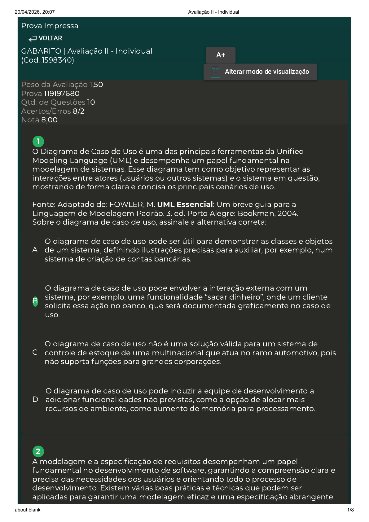 Prova Impressa GABARITO | Avaliação II - Individual (Cod.:1598340) Peso da Avaliação 1,50 Prova 119197680 Qtd. de Questões 10 Acertos/Erros 8/2 Nota 8,00 O Diagrama de Caso de Uso é uma das principais ferramentas da Unified Modeling Language (UML) e desempenha um papel fundamental na modelagem de sistemas. Esse diagrama tem como objetivo representar as interações entre atores (usuários ou outros sistemas) e o sistema em questão, mostrando de forma clara e concisa os principais cenários de uso. Fonte: Adaptado de: FOWLER, M. UML Essencial: Um breve guia para a Linguagem de Modelagem Padrão. 3. ed. Porto Alegre: Bookman, 2004. Sobre o diagrama de caso de uso, assinale a alternativa correta: A O diagrama de caso de uso pode ser útil para demonstrar as classes e objetos de um sistema, definindo ilustrações precisas para auxiliar, por exemplo, num sistema de criação de contas bancárias. B O diagrama de caso de uso pode envolver a interação externa com um sistema, por exemplo, uma funcionalidade “sacar dinheiro”, onde um cliente solicita essa ação no banco, que será documentada graficamente no caso de uso. C O diagrama de caso de uso não é uma solução válida para um sistema de controle de estoque de uma multinacional que atua no ramo automotivo, pois não suporta funções para grandes corporações. D O diagrama de caso de uso pode induzir a equipe de desenvolvimento a adicionar funcionalidades não previstas, como a opção de alocar mais recursos de ambiente, como aumento de memória para processamento. A modelagem e a especificação de requisitos desempenham um papel fundamental no desenvolvimento de software, garantindo a compreensão clara e precisa das necessidades dos usuários e orientando todo o processo de desenvolvimento. Existem várias boas práticas e técnicas que podem ser aplicadas para garantir uma modelagem eficaz e uma especificação abrangente VOLTAR A+Aumentar, Fonte Alterar modo de visualização 1 2 20/04/2026, 20:07 Avaliação II - Individual about:blank 1/8 dos requisitos. Com base no excerto, sobre em que podem consistir as boas práticas e técnicas de modelagem de requisitos, analise as sentenças a seguir: I- Descrição técnica, pertinente à área de desenvolvimento de software. II- Construção de um formato de descrição-padrão, garantindo que todas as definições o utilizem. III- Descrição usando recursos de destaque, como negrito, destaque em cor diferente, entre outros, para realçar uma parte importante do requisito. Assinale a alternativa CORRETA: Fonte: SOMMERVILLE, I. Engenharia de software. 8. ed. São Paulo: Pearson Addison Wesley, 2007. A As sentenças I e III estão corretas. B As sentenças II e III estão corretas. C Somente a sentença I está correta. D As sentenças I e II estão corretas. O Diagrama de Atividade é um importante componente da Unified Modeling Language (UML) utilizado na engenharia de software e no desenvolvimento de sistemas. Esse diagrama é especialmente útil para modelar o fluxo de atividades e a sequência de ações dentro de um processo ou método específico. Fonte: Adaptado de: SOMMERVILLE, I. Engenharia de Software. 10. ed. São Paulo: Pearson Education do Brasil, 2018. Com base no excerto, para o bom uso de um diagrama de atividade, num projeto de software, é importante ficar atento a(o): I. Às etapas de coleta de requisitos, que servem apenas para essa finalidade: coletar requisitos. II. Ao contexto e à finalidade do sistema, pois deve ser aplicado dentro de um contexto e método específico. III. À integração com o diagrama de caso de uso, somente após a conclusão do diagrama e das descrições de caso de uso. IV. À identificação de todas as atividades envolvidas no processo, pois melhora a ilustração da lógica de um fluxo de trabalho. É correto o que se afirma em: 3 20/04/2026, 20:07 Avaliação II - Individual about:blank 2/8 A I, II e III, apenas. B III e IV, apenas. C I, apenas. D II e IV, apenas. A especificação detalhada dos requisitos é uma etapa crucial no processo de desenvolvimento de software, pois é nessa fase que os detalhes e especificações precisas do sistema são documentados. Essa documentação é essencial para garantir que o software seja desenvolvido de acordo com as necessidades e expectativas dos usuários e stakeholders. Fonte: Adaptado de: IEEE. Guide to the Software Engineering Body of Knowledge: SWEBOK® v. 3.0. Los Alamitos, CA: IEEE Computer Society, 2014. Sobre a necessidade de realizar uma especificação detalhada dos requisitos, classifique V para as sentenças verdadeiras e F para as falsas: ( ) Há a necessidade de se identificar quem são os usuários finais do sistema, a exemplo, em sistema de consulta médica, identificar quem é o responsável pelo agendamento de consultas que irá operar o sistema. ( ) Devem ser documentadas quaisquer restrições ou limitações que possam afetar o uso do sistema, a exemplo, num sistema de pedido de refeições, deve-se prever a integração com sistemas que computam a quantidade de ingredientes disponíveis para o preparo do pedido. ( ) Entender o objetivo do sistema é um requisito fundamental, por exemplo, em um software de controle de estoque, que será utilizado por um operador para o controle de entrada e saída dos itens, também deverá prover a apresentação de relatórios gerenciais à administração da empresa. ( ) Prover recursos do ambiente onde o sistema será implantado é um item que não deve ser previsto, pois no projeto de software não importa como será implementado e em que situação, pois um sistema é volátil e não deve se preocupar com questões físicas, como hardware e outros recursos para seu uso. Assinale a alternativa que apresenta a sequência correta: A V, V, F, F. B V, F, F, V. 4 20/04/2026, 20:07 Avaliação II - Individual about:blank 3/8 C F, V, V, F. D V, V, V, F. Durante a revisão de requisitos, uma equipe multidisciplinar, incluindo a
