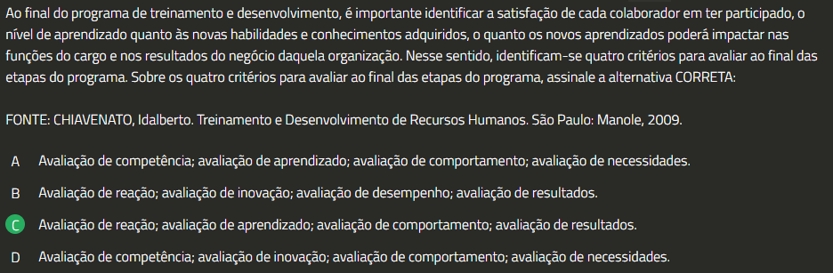 Ao final do programa de treinamento e desenvolvimento, é importante identificar a satisfação de cada colaborador em ter participado, 0 nível de aprendizado quanto às novas habilidades e conhecimentos adquiridos, quanto novos aprendizados poderá impactar nas funções do cargo e nos resultados do negócio daquela organização. Nesse sentido, identificam-se quatro critérios para avaliar ao final das etapas do programa. Sobre quatro critérios para avaliar ao final das etapas do programa, assinale a alternativa CORRETA: FONTE: CHIAVENATO, Idalberto. Treinamento e Desenvolvimento de Recursos Humanos. São Paulo: Manole, 2009. A Avaliação de competência; avaliação de aprendizado; avaliação de comportamento; avaliação de necessidades. B Avaliação de reação; avaliação de inovação; avaliação de desempenho; avaliação de resultados. Avaliação de reação; avaliação de aprendizado; avaliação de comportamento; avaliação de resultados. D Avaliação de competência; avaliação de inovação; avaliação de comportamento; avaliação de necessidades.