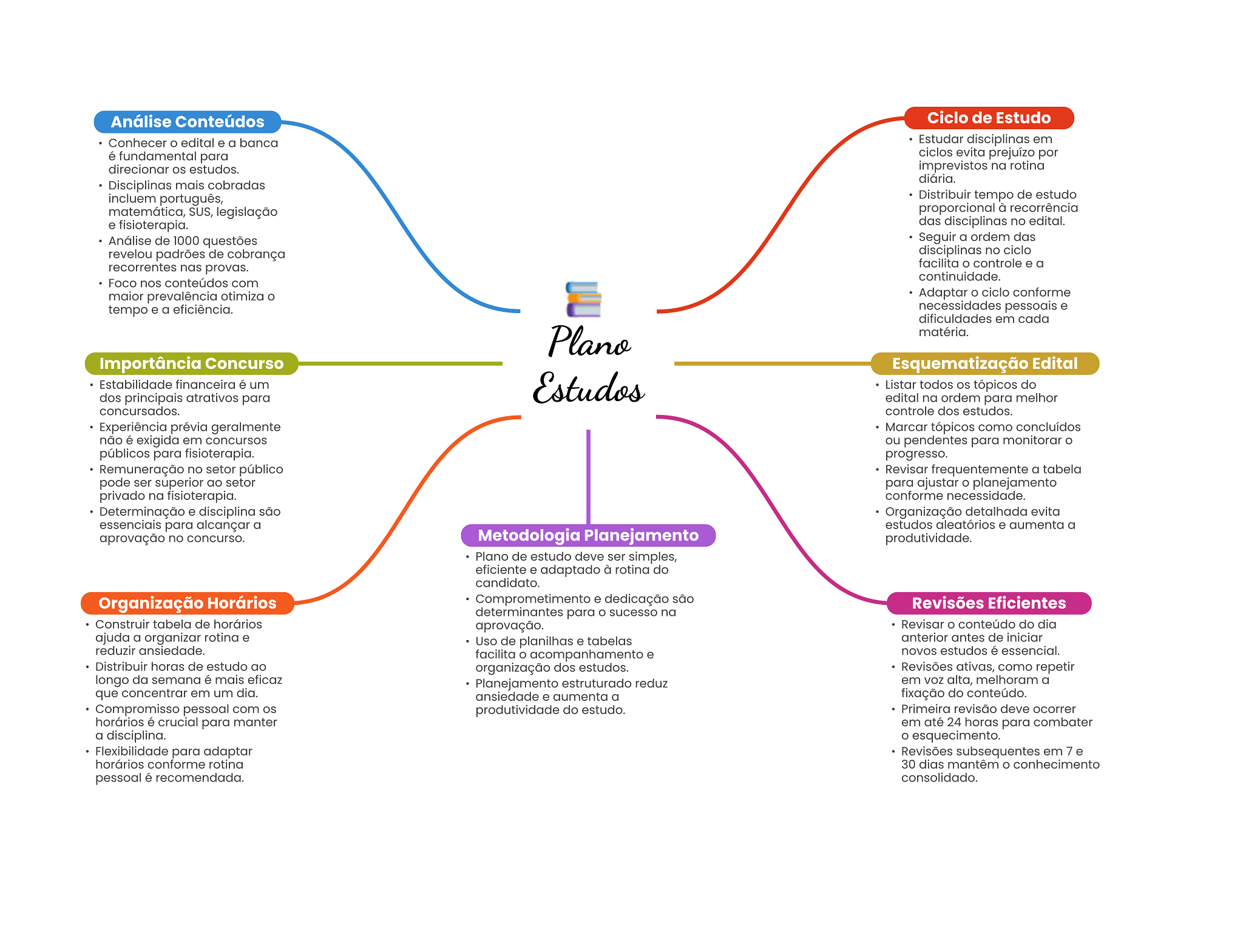 Análise Conteúdos Ciclo de Estudo Conhecer edital e a banca Estudar disciplinas em é fundamental para ciclos evita prejuízo por direcionar estudos. imprevistos na rotina diária. Disciplinas mais cobradas incluem português, Distribuir tempo de estudo matemática, SUS, legislação proporcional à recorrência e fisioterapia. das disciplinas no edital. Análise de 1000 questões Seguir a ordem das revelou padrões de cobrança disciplinas no ciclo recorrentes nas provas. facilita controle e a continuidade. Foco nos conteúdos com maior prevalência otimiza Adaptar ciclo conforme tempo e a eficiência. necessidades pessoais e dificuldades em cada Plano matéria. Importância Concurso Esquematização Edital Estabilidade financeira é um dos principais atrativos para Estudos Listar todos tópicos do edital na ordem para melhor concursados. controle dos estudos. Experiência prévia geralmente Marcar tópicos como concluídos não é exigida em concursos ou pendentes para monitorar O públicos para fisioterapia. progresso. Remuneração no setor público Revisar frequentemente a tabela pode ser superior ao setor para ajustar O planejamento privado na fisioterapia. conforme necessidade. Determinação e disciplina são Organização detalhada evita essenciais para alcançar a estudos aleatórios e aumenta a aprovação no concurso. Metodologia Planejamento produtividade. Plano de estudo deve ser simples, eficiente e adaptado à rotina do candidato. Organização Horários Comprometimento e dedicação são Revisões Eficientes determinantes para sucesso na Construir tabela de horários aprovação. Revisar conteúdo do dia ajuda a organizar rotina e Uso de planilhas e tabelas anterior antes de iniciar reduzir ansiedade. facilita O acompanhamento e novos estudos é essencial. Distribuir horas de estudo ao organização dos estudos. Revisões ativas, como repetir longo da semana é mais eficaz Planejamento estruturado reduz em alta, melhoram a que concentrar em um dia. ansiedade e aumenta a fixação do conteúdo. Compromisso pessoal com produtividade do estudo. Primeira revisão deve ocorrer horários é crucial para manter em até 24 horas para combater a disciplina. esquecimento. Flexibilidade para adaptar Revisões subsequentes em 7 e horários conforme rotina 30 dias mantêm conhecimento pessoal é recomendada. consolidado.
