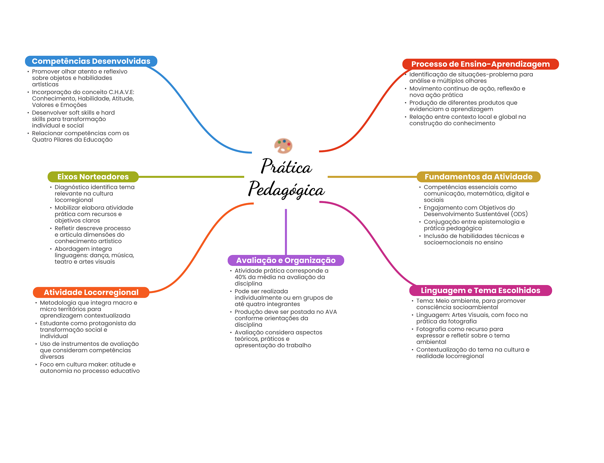 Competências Desenvolvidas Processo de Ensino-Aprendizagem Promover olhar atento e reflexivo Identificação de situações-problema para sobre objetos e habilidades artísticas análise e múltiplos olhares Movimento contínuo de ação, reflexão e Incorporação do conceito C.H.A.V.E: nova ação prática Conhecimento, Habilidade, Atitude, Valores e Emoções Produção de diferentes produtos que Desenvolver soft skills e hard evidenciam a aprendizagem skills para transformação Relação entre contexto local e global na individual e social construção do conhecimento Relacionar competências com Quatro Pilares da Educação Prática Eixos Norteadores Fundamentos da Atividade Diagnóstico identifica tema relevante na cultura Pedagógica Competências essenciais como comunicação, matemática, digital e locorregional sociais Mobilizar elabora atividade Engajamento com Objetivos do prática com recursos e Desenvolvimento Sustentável (ODS) objetivos claros Conjugação entre epistemologia e Refletir descreve processo prática pedagógica e articula dimensões do Inclusão de habilidades técnicas e conhecimento artístico socioemocionais no ensino Abordagem integra linguagens: dança, música, teatro e artes visuais Avaliação e Organização Atividade prática corresponde a 40% da média na avaliação da disciplina Atividade Locorregional Pode ser realizada Linguagem e Tema Escolhidos individualmente ou em grupos de Metodologia que integra macro e até quatro integrantes Tema: Meio ambiente, para promover micro territórios para consciência socioambiental Produção deve ser postada no AVA aprendizagem contextualizada conforme orientações da Linguagem: Artes Visuais, com foco na Estudante como protagonista da disciplina prática da fotografia transformação social e Avaliação considera aspectos Fotografia como recurso para individual teóricos, práticos e expressar e refletir sobre tema Uso de instrumentos de avaliação ambiental apresentação do trabalho que consideram competências Contextualização do tema na cultura e diversas realidade locorregional Foco em cultura maker: atitude e autonomia no processo educativo